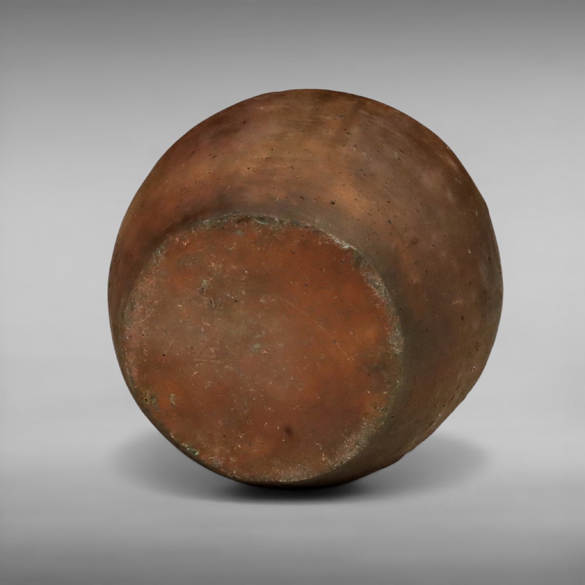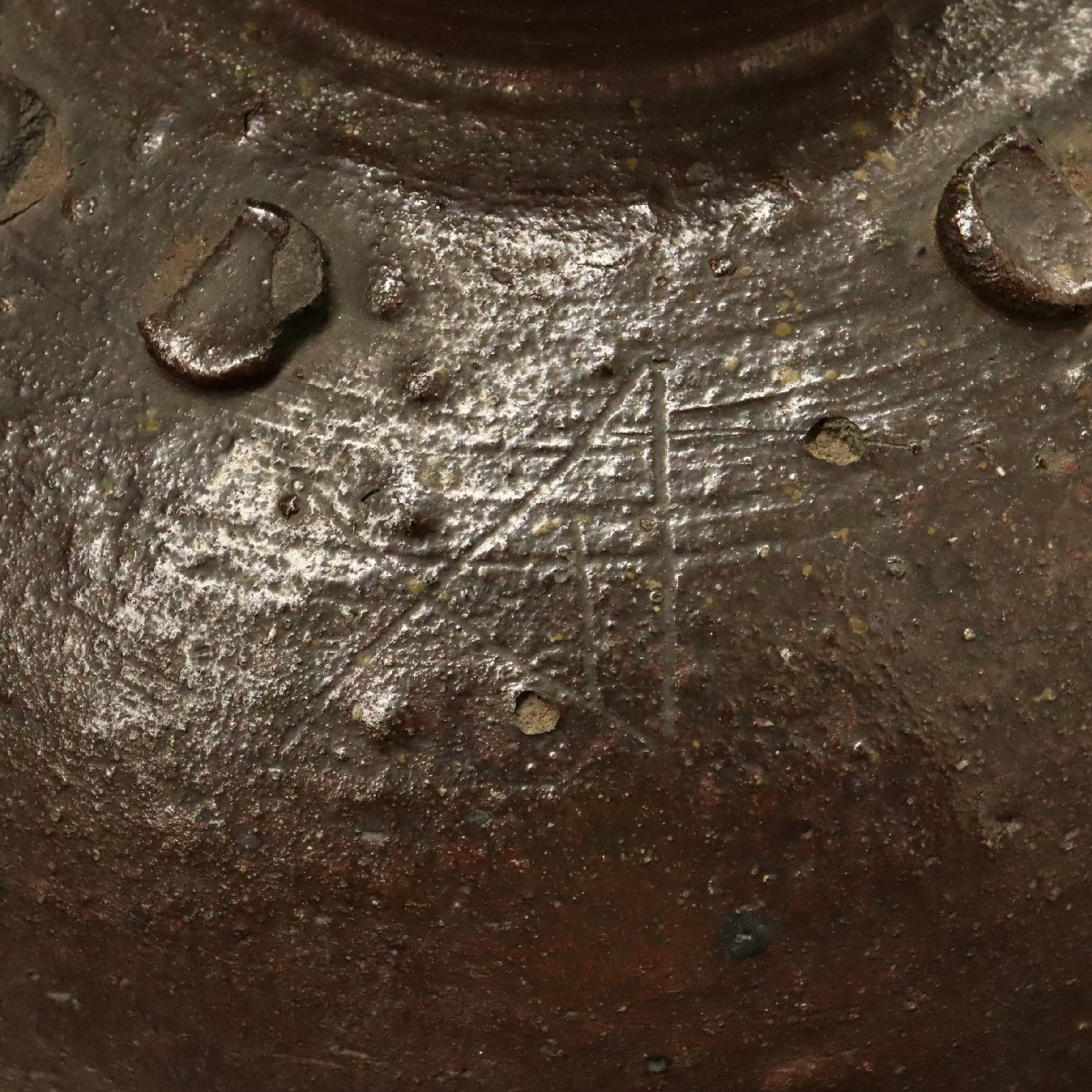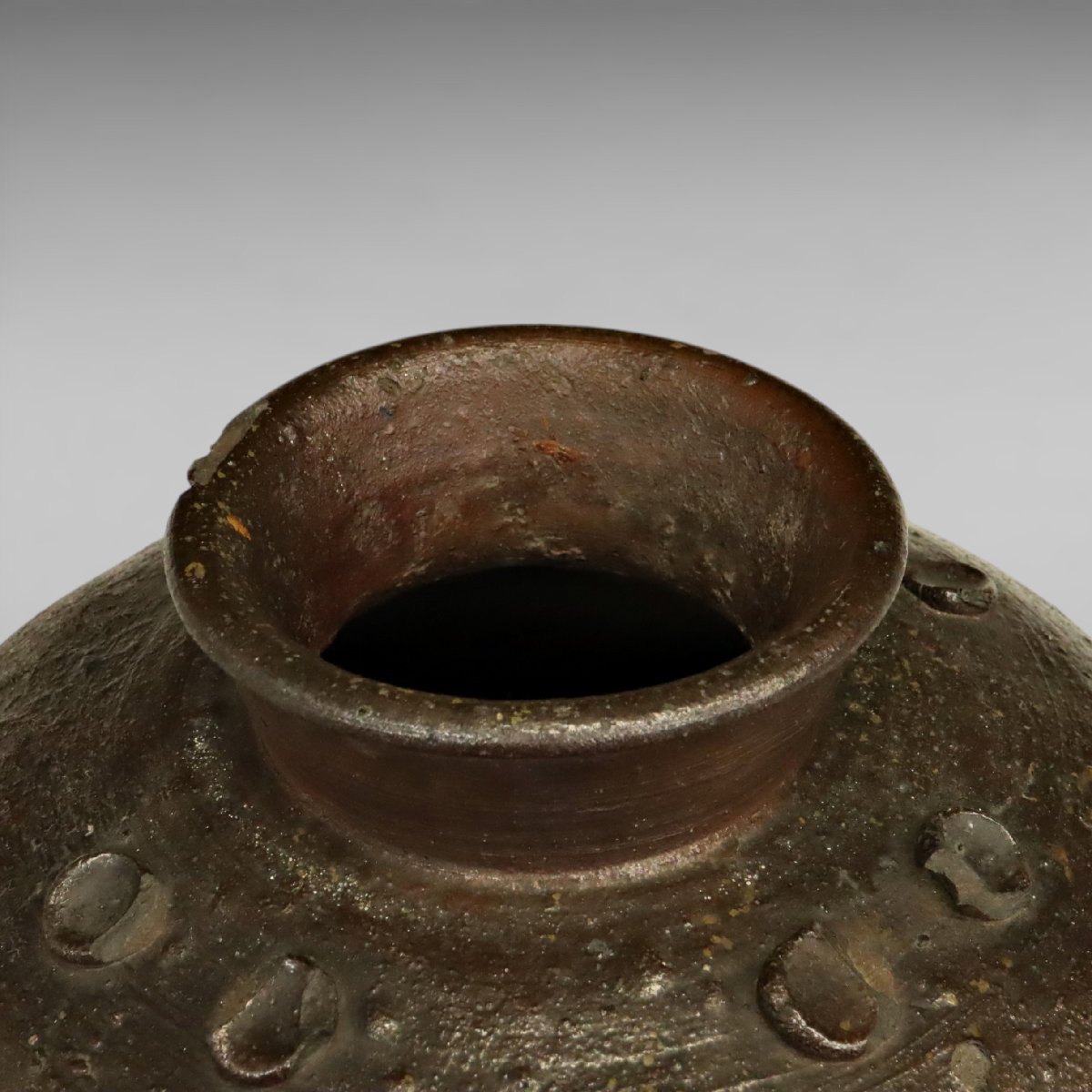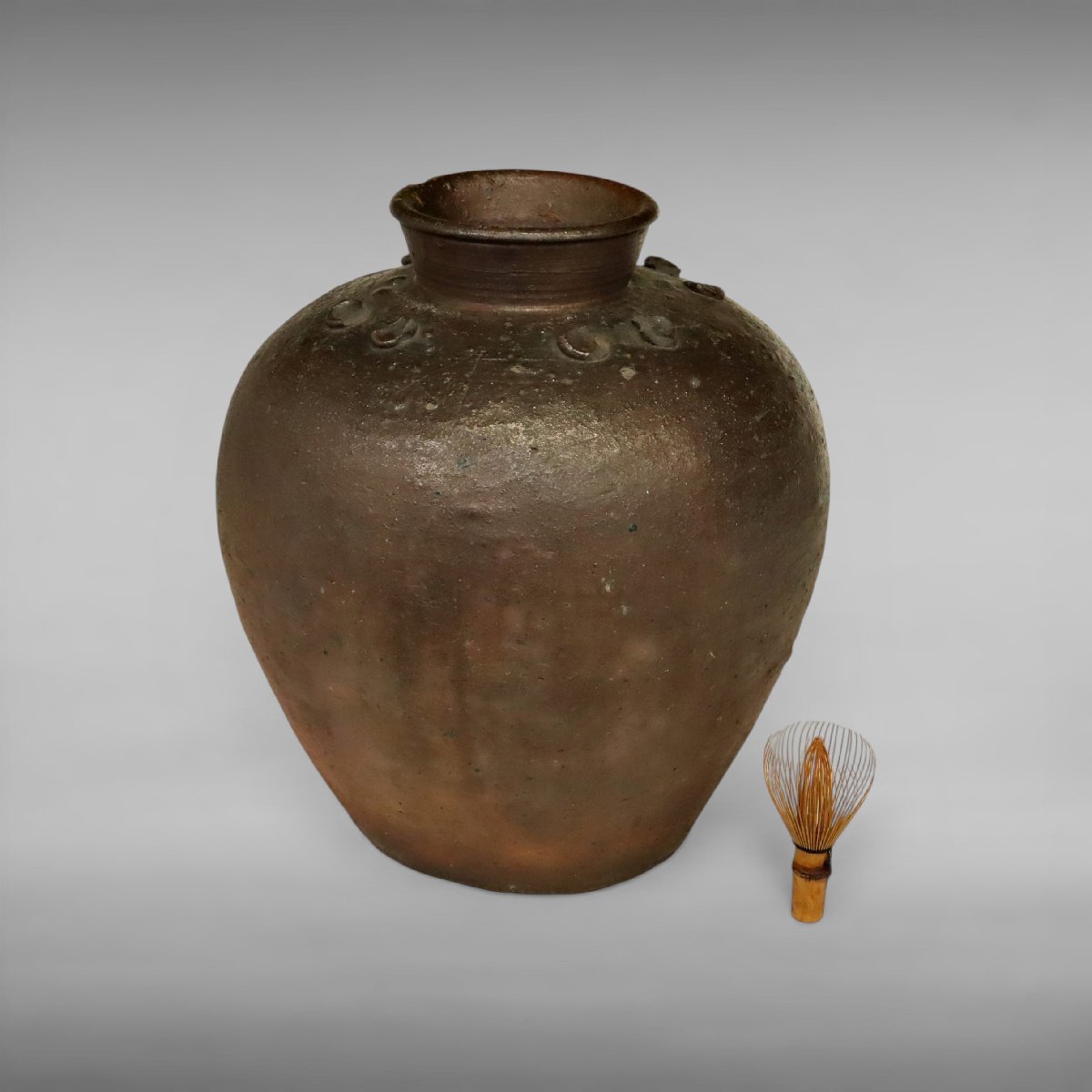 室町期、岡山県備前の古備前四耳壺です。端正な四耳造形と力強い焼締肌に加え窯印を備えた見どころ多い作で、葉茶壺としての格調と中世備前の実用美を今に伝える貴重な古陶磁として華道具・茶道具両面で蒐集価値の高い逸品です。