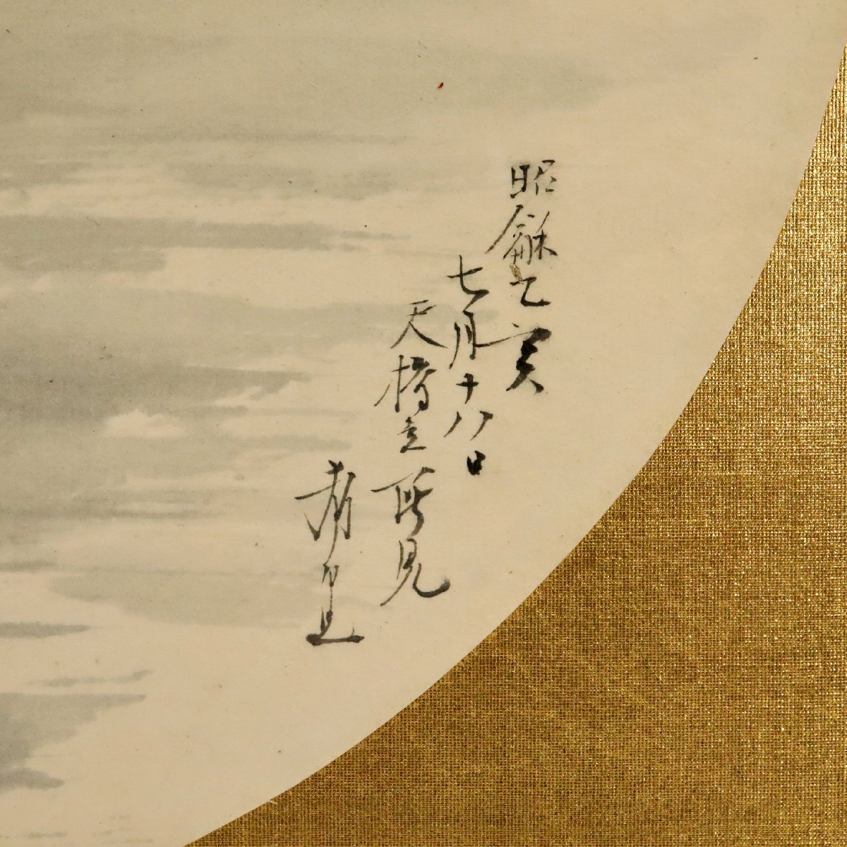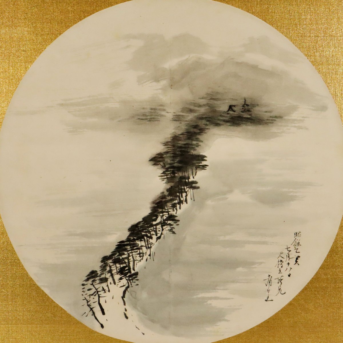 広島県福山市出身、日本芸術院会員・児玉希望による昭和10年作「天橋立所見」水墨画額装です。簡潔にして格調高い筆致が名勝天橋立の静謐な景観を描き出した秀作で、郷土ゆかりの巨匠による資料性と蒐集価値を備えた貴重な書画作品です。