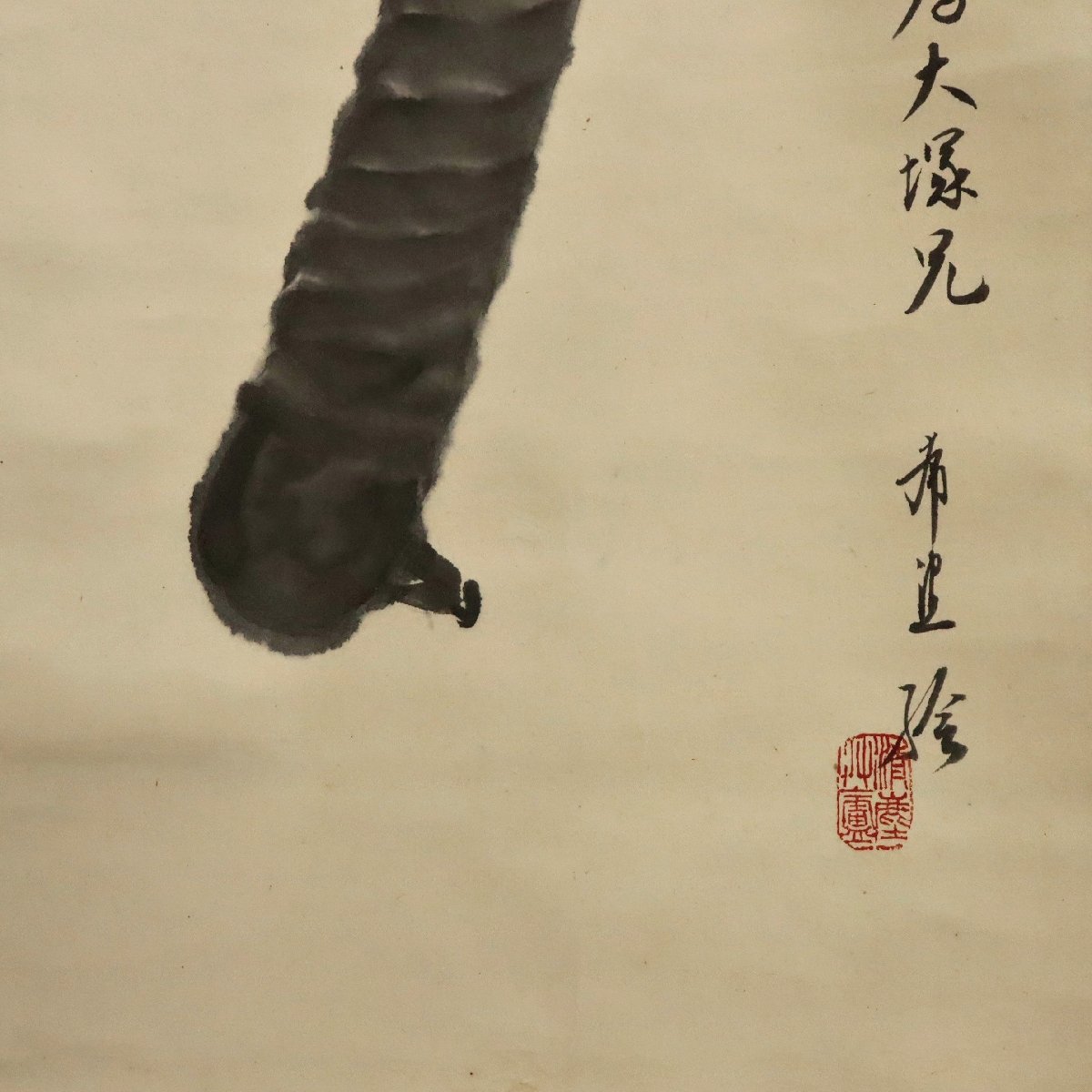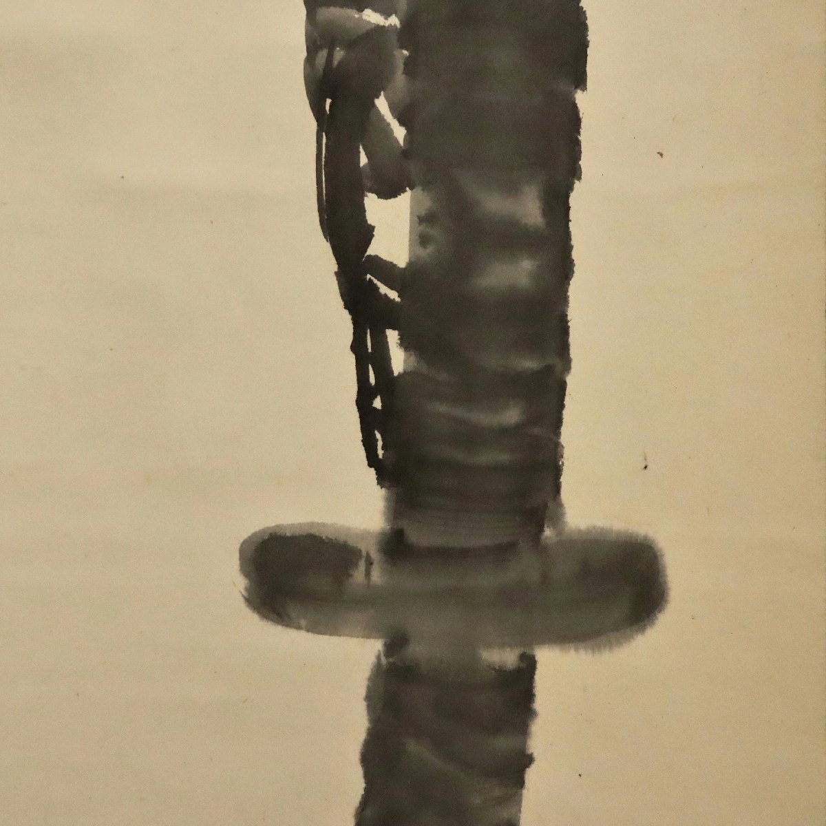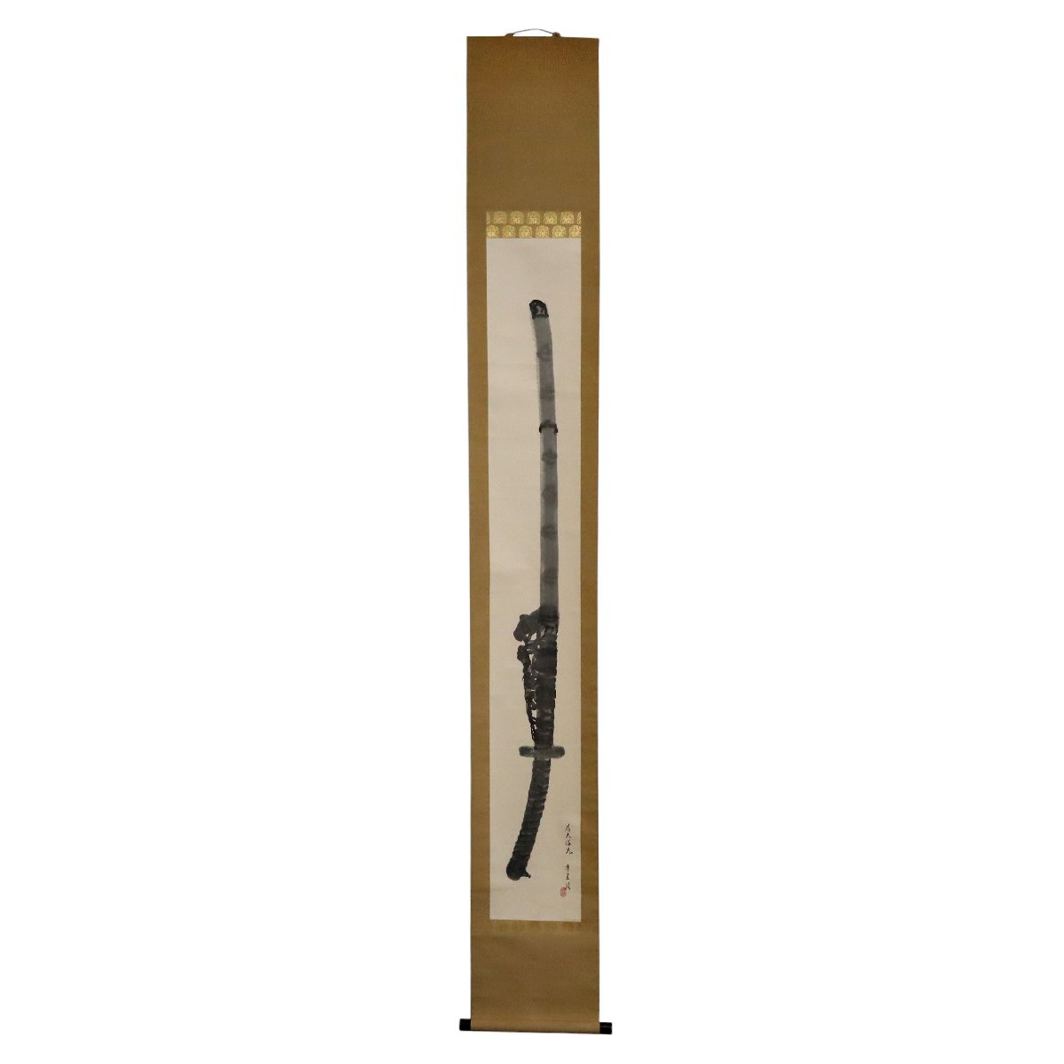 日本芸術院会員として知られる児玉希望による「太刀」を題材とした水墨画の紙本掛軸です。共箱付で来歴も感じられ、鋭さと静謐さを併せ持つ筆致に近代日本画の気品が漂う一幅。広島県ゆかりの作家による発見性高い備後関連書画の佳品です。