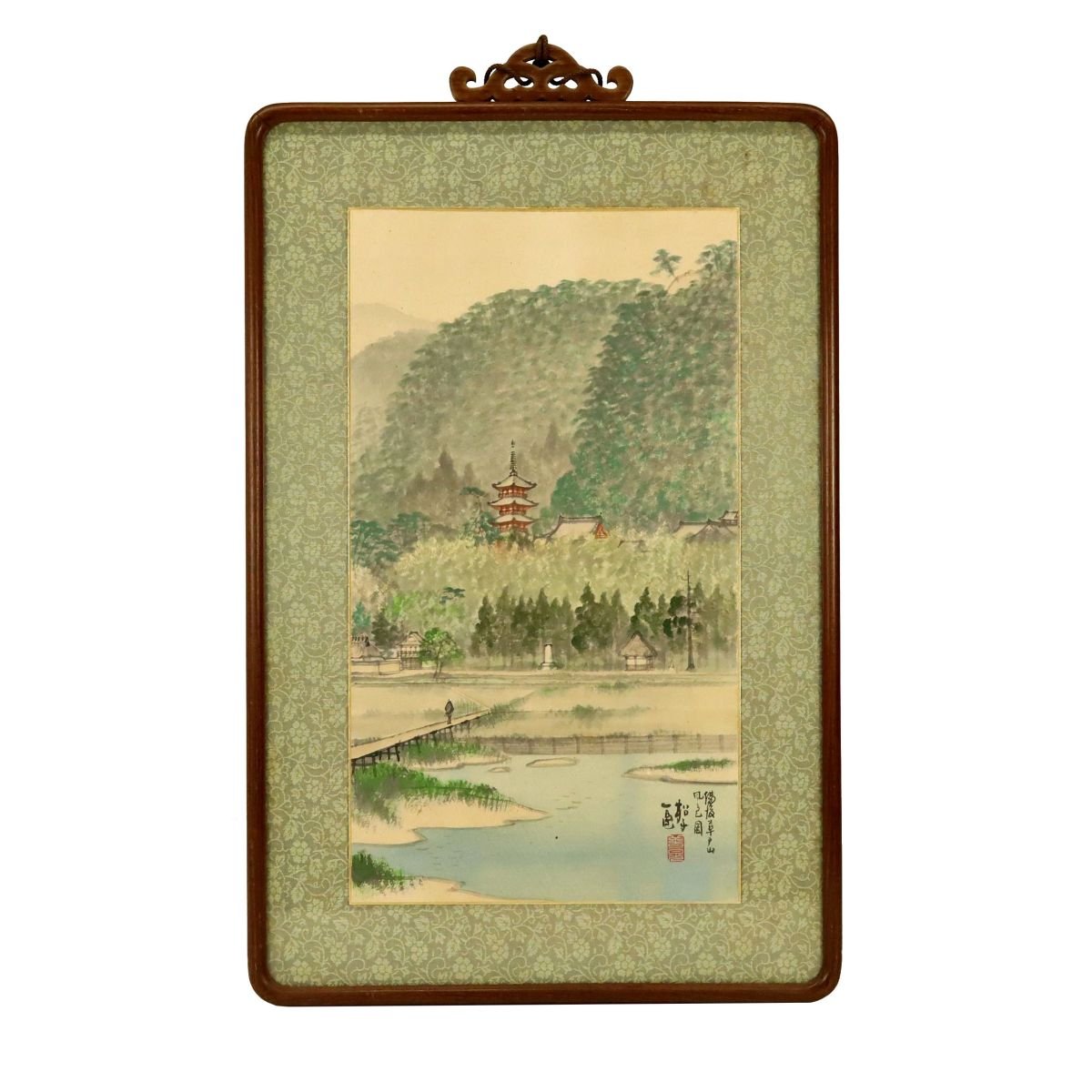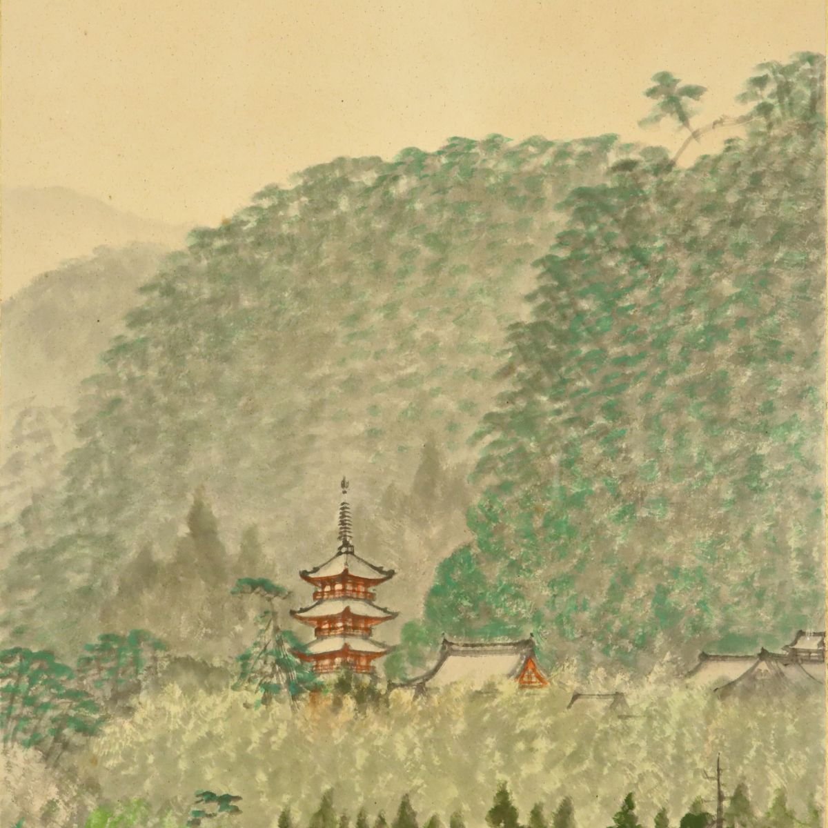 備後ゆかりの画家・松島一晃による「備後草戸山」水彩画です。歴史的景観として知られる草戸山の自然豊かな佇まいを、やわらかな彩色と落ち着いた筆致で情趣豊かに描いた一作。約47.8×26.7cmの飾りやすい寸法で、郷土の風景と美意識を伝える資料性と鑑賞性を兼ね備えた備後美術の骨董絵画です。