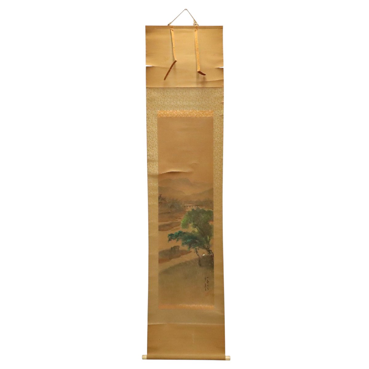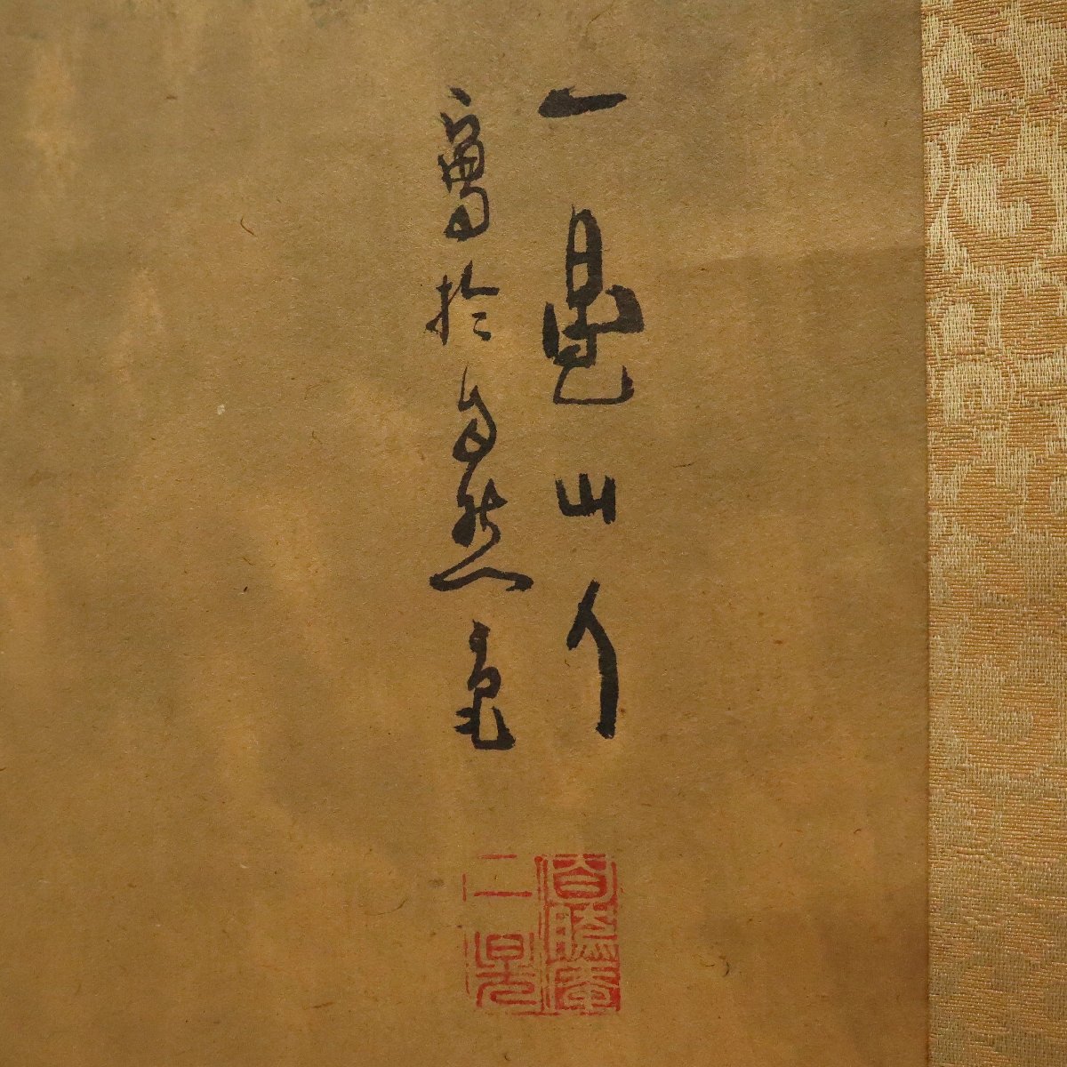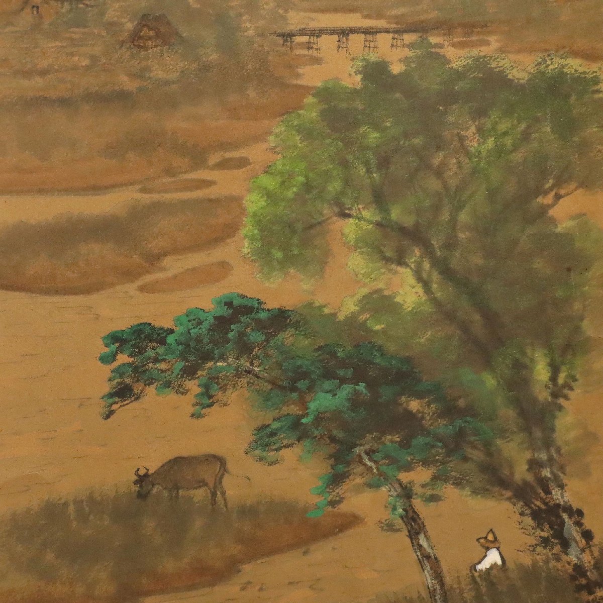 備後(広島県福山市周辺)ゆかりとされる松島一晃による牧牛と山水図の掛軸です。紙本に牧牛と山水を柔らかな筆致で描き、静けさと自然美が調和した書画骨董の逸品でございます。共箱付きで茶席や和室に格調を添えます。
