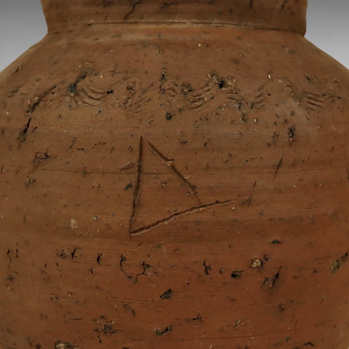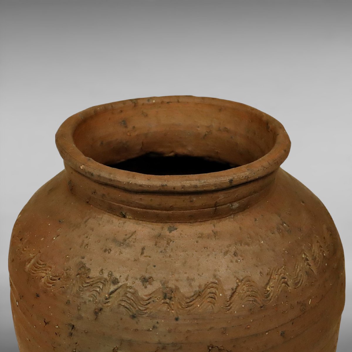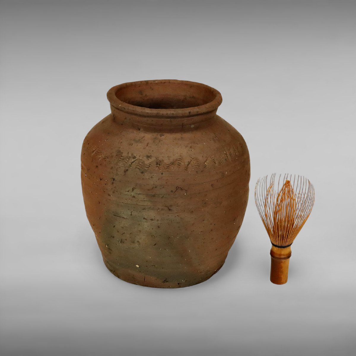 桃山期の古備前による波状紋種壷です。岡山県備前市伊部に連なる古備前特有の力強い土味に、躍動感ある波状紋が映える見どころ豊かな作行。堂々とした器形に桃山茶陶の風格が漂う、華道具としても鑑賞性・蒐集価値の高い優品です。