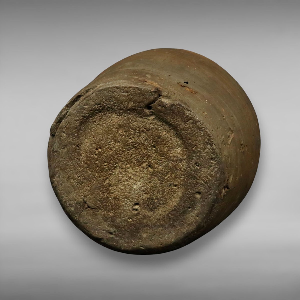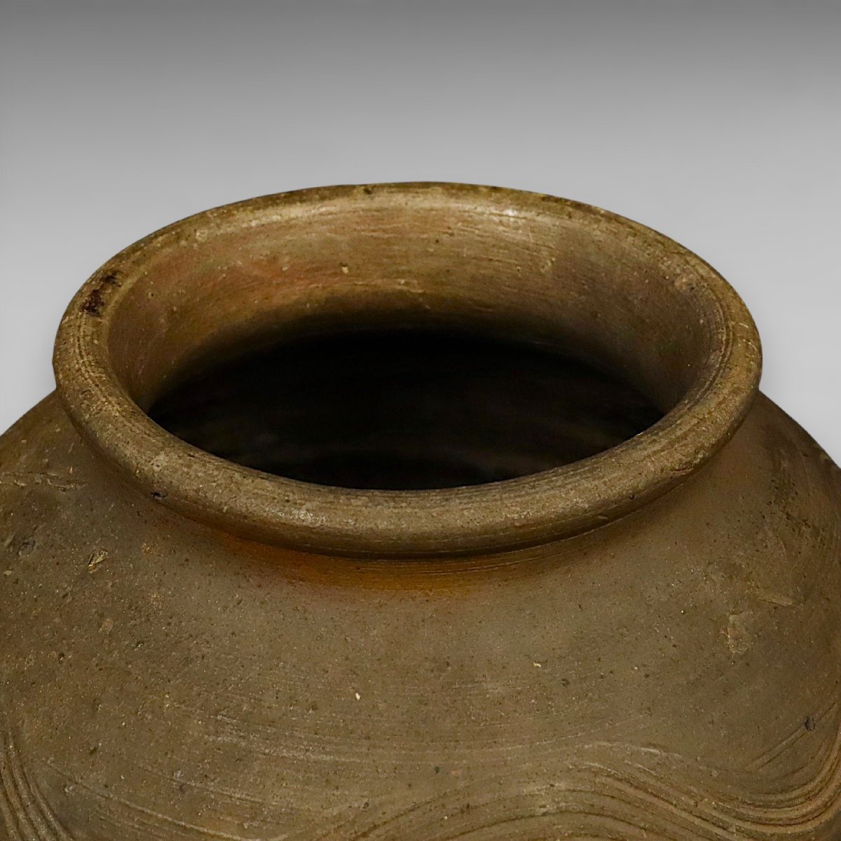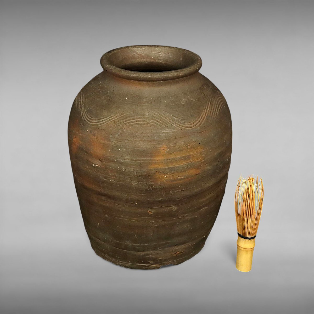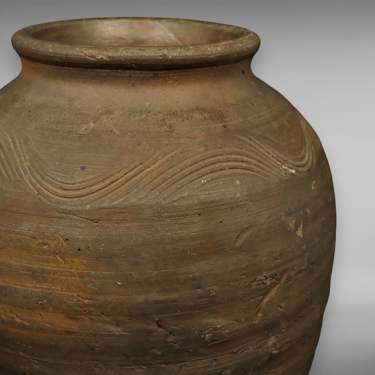桃山期に岡山県備前市周辺で焼成された古備前の波状紋壷です。躍動感ある波状紋と無釉焼締の力強い土味、自然釉の景色が桃山陶特有の豪放な趣を伝える逸品。花入としても映える華道具として鑑賞性に優れた発見性の高い古備前です。