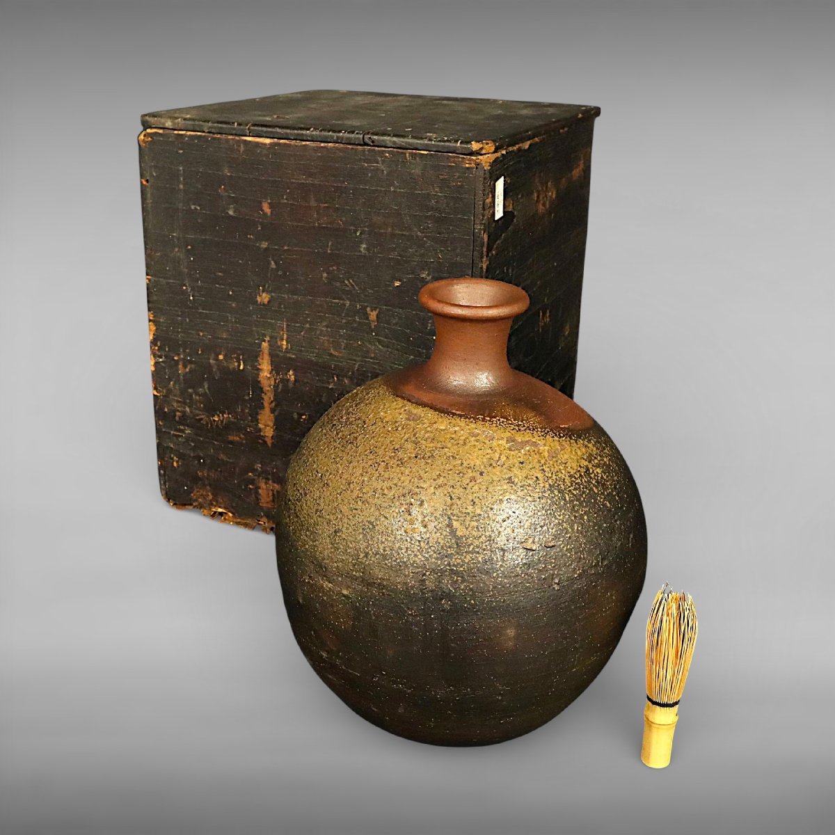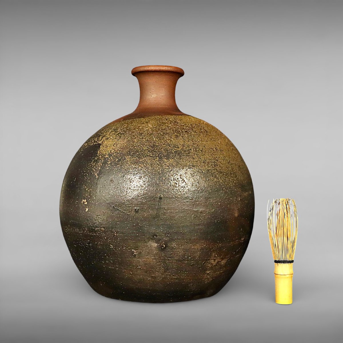 桃山期に岡山県備前市周辺で焼成された古備前の蕪徳利です。丸みある蕪形の堂々たる造形と無釉焼締の力強い土味、自然釉の景色が桃山陶の豪放な美意識を伝える逸品。酒器としてはもちろん花入としても映える発見性の高い古陶磁です。