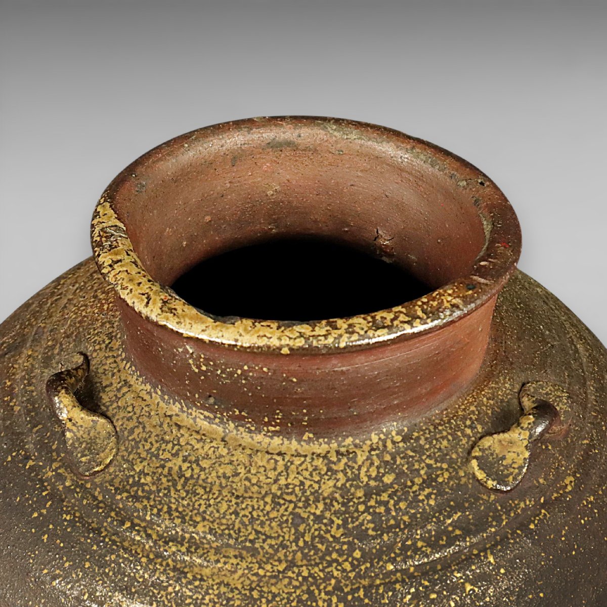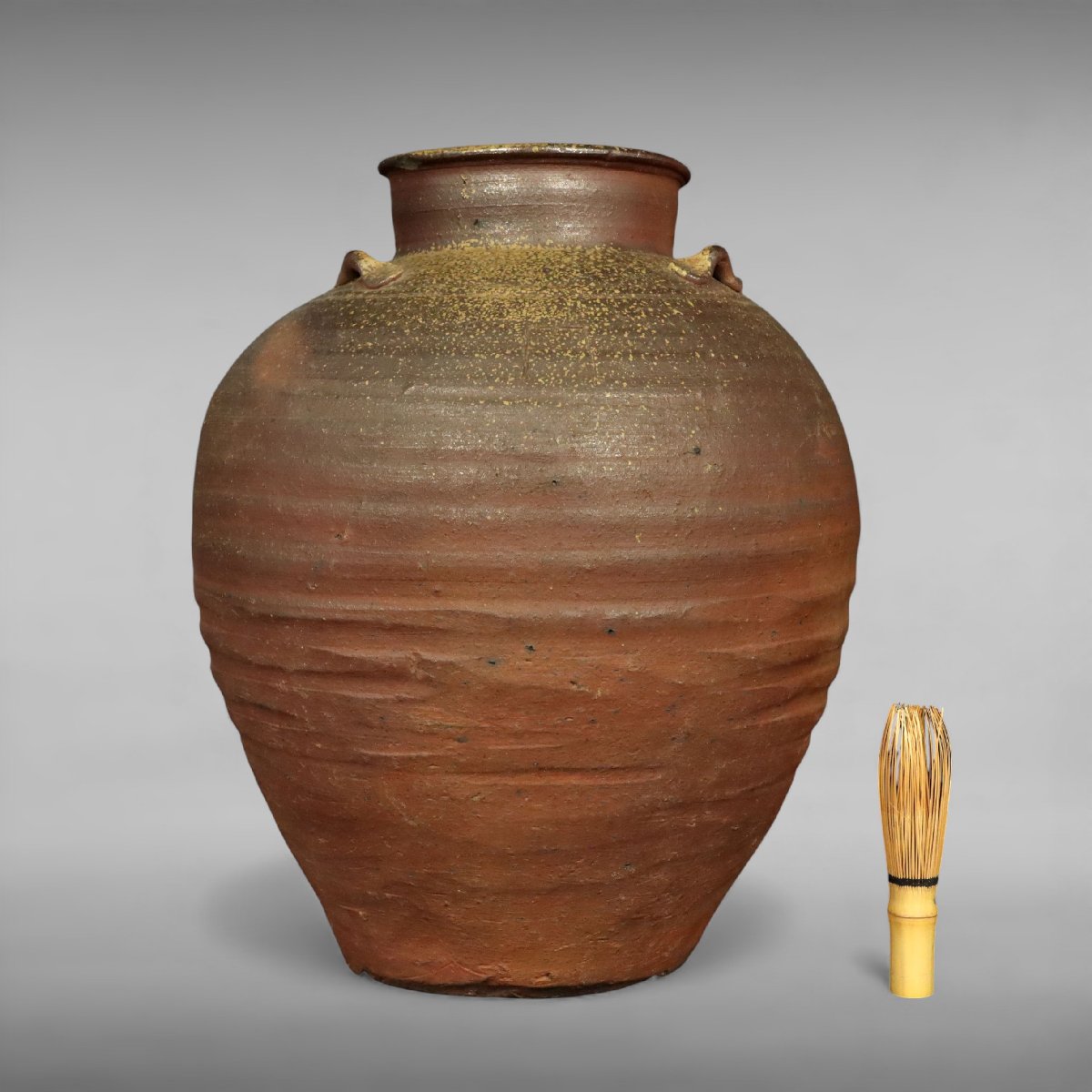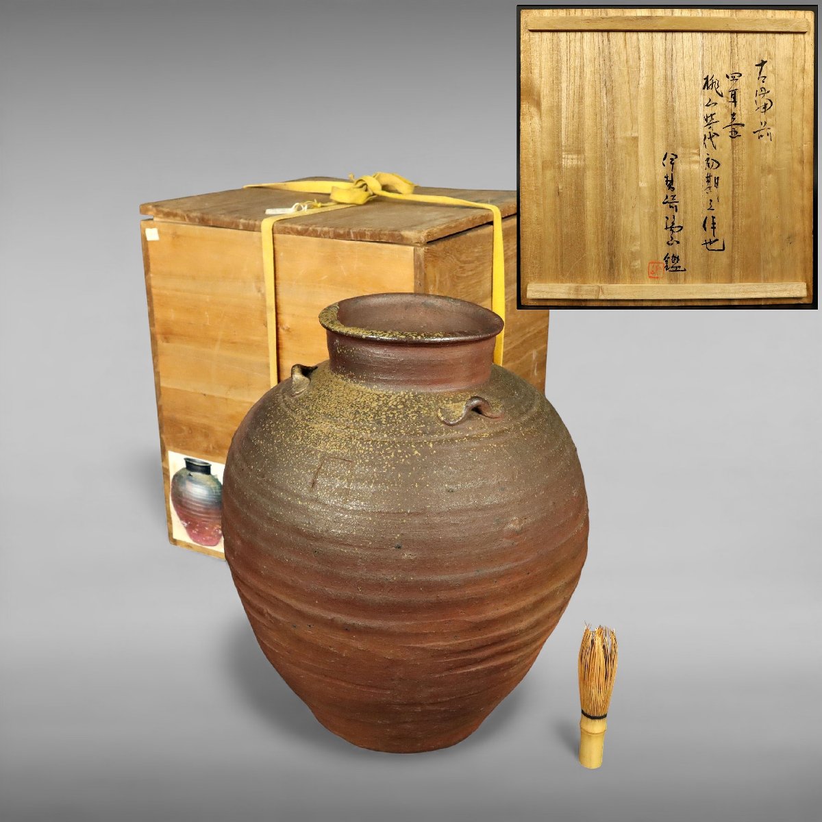 桃山期の古備前による三耳壷です。岡山県備前市伊部に連なる古備前特有の力強い土味と均整の取れた三耳の造形に加え、窯印を備えた見どころある古格の一作。伊勢崎陽山識箱を伴い伝来も確かな、華道具として蒐集価値の高い優品です。