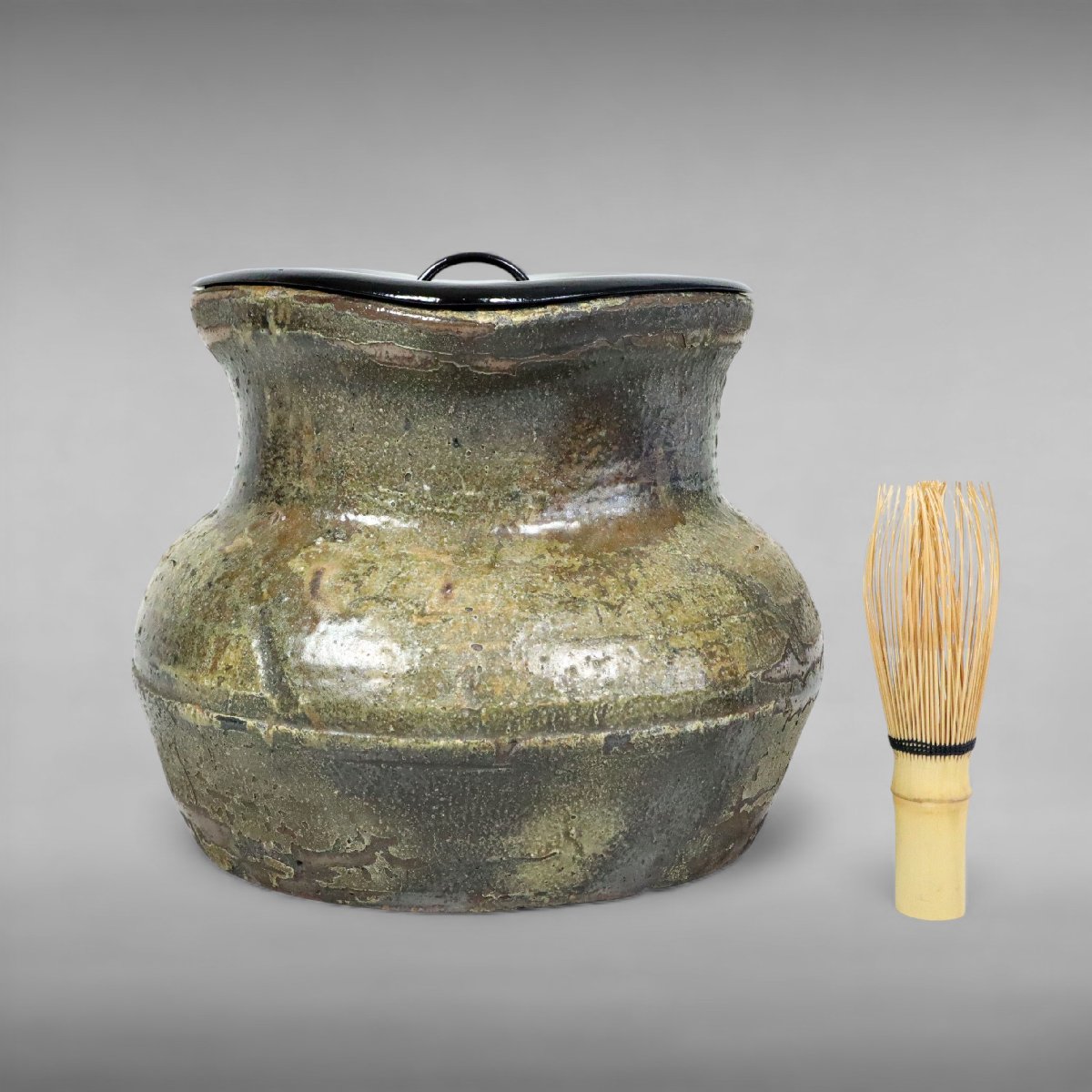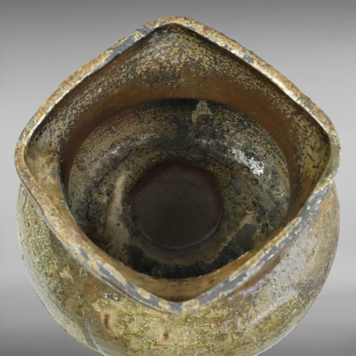 桃山期の古備前による四方口水指です。岡山県備前市伊部に連なる古備前特有の力強い土味と直線的で端正な四方口の造形が見どころで、桃山茶陶ならではの簡潔にして格調高い作行が魅力。箱付で伝来も感じられる、茶道具として蒐集価値の高い優品です