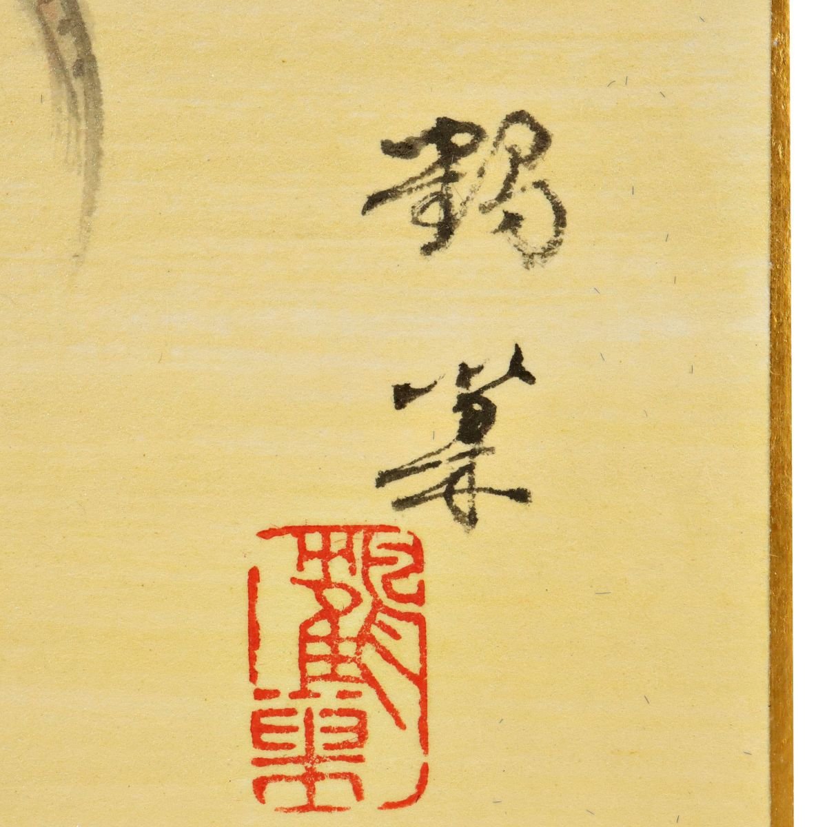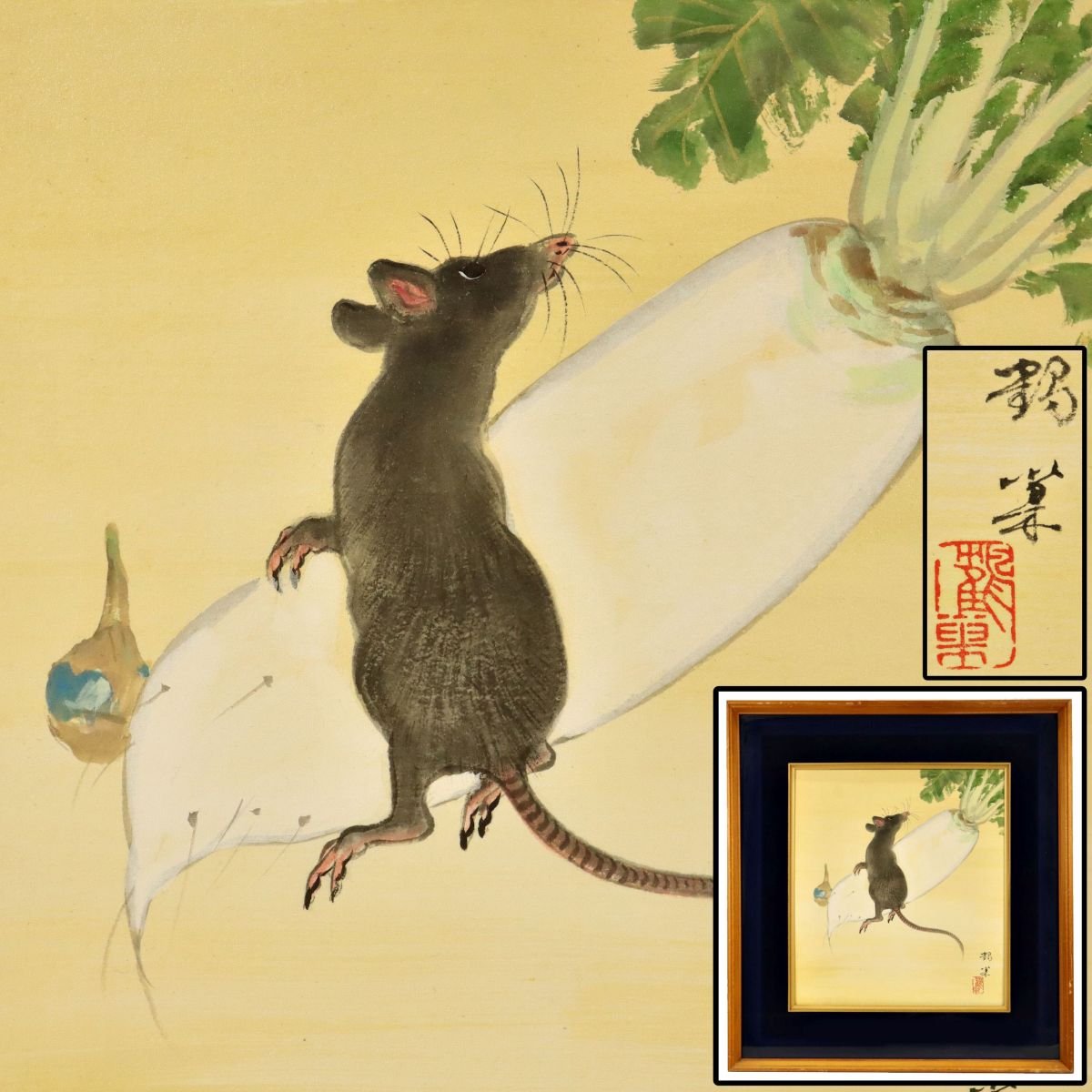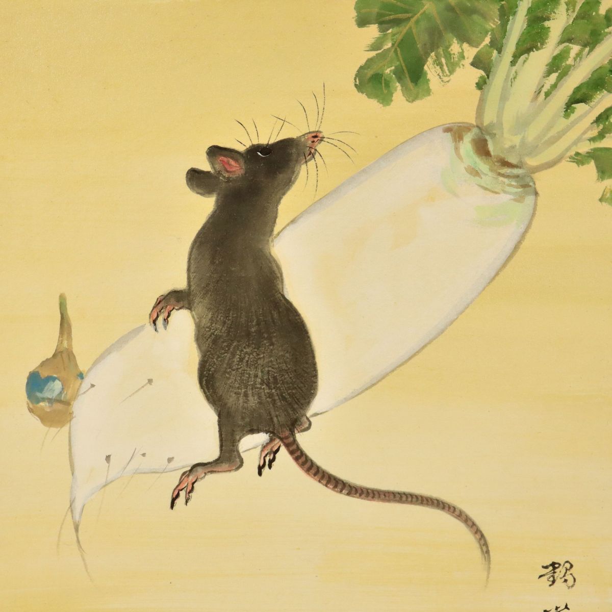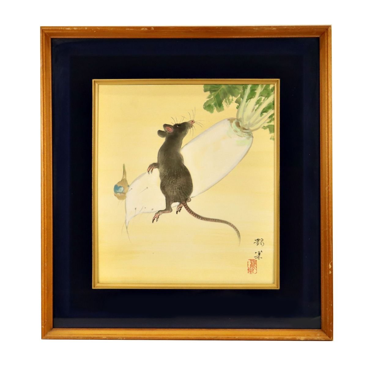 備後(広島県)ゆかりの画家・森鶴巣による「鼠と大根図」の色紙画。約26×23cmの画面に、鼠と大根という素朴な題材を軽妙な筆致で描き、民画的な温かみとユーモアが漂う一作です。簡潔ながらも構図の妙が光り、郷土性を感じる骨董書画として鑑賞・収蔵価値のある作品です。