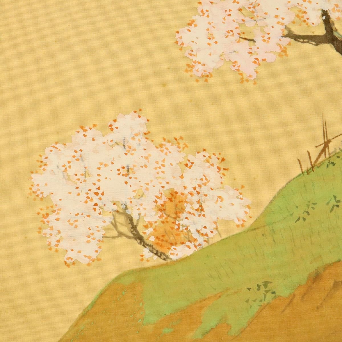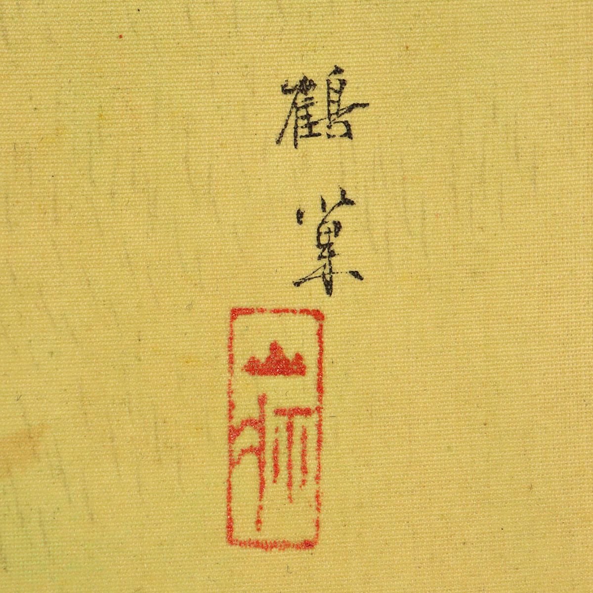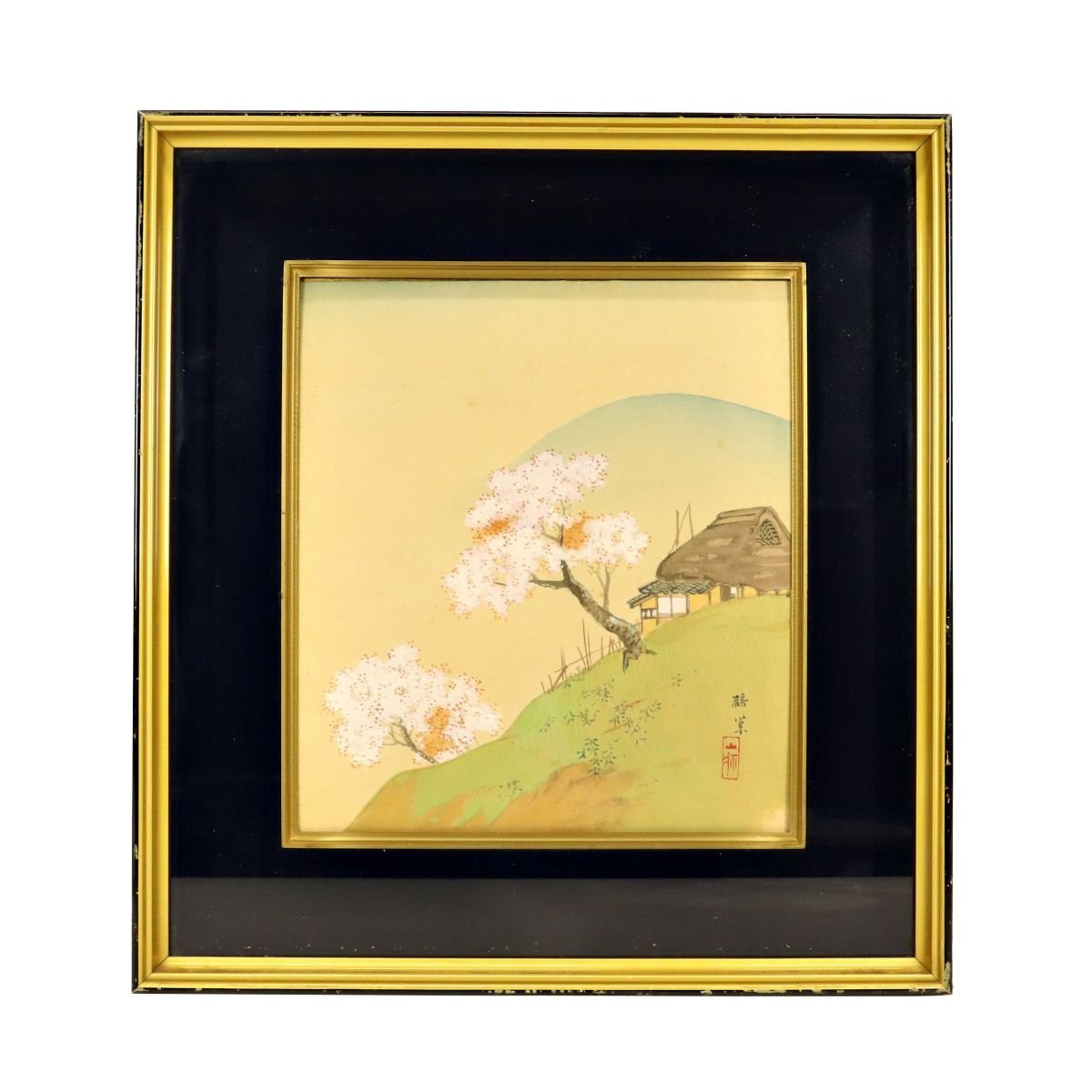 備後ゆかりの画家・森鶴巣による風景図の色紙画です。約26×23cmの端正な画面に自然の静かな情趣を簡潔な筆致と落ち着いた色彩で表現し、文人画風の余韻ある構成が魅力の一作。地方画壇の息吹を伝える資料性も備え、卓上や額装にも映える蒐集価値ある書画作品です。