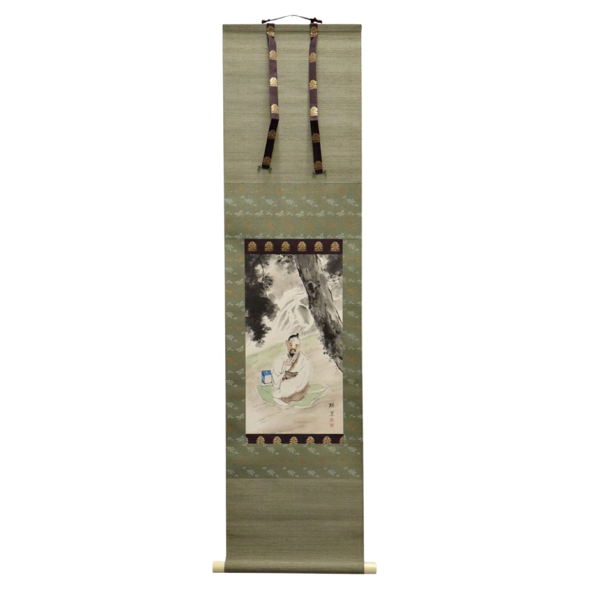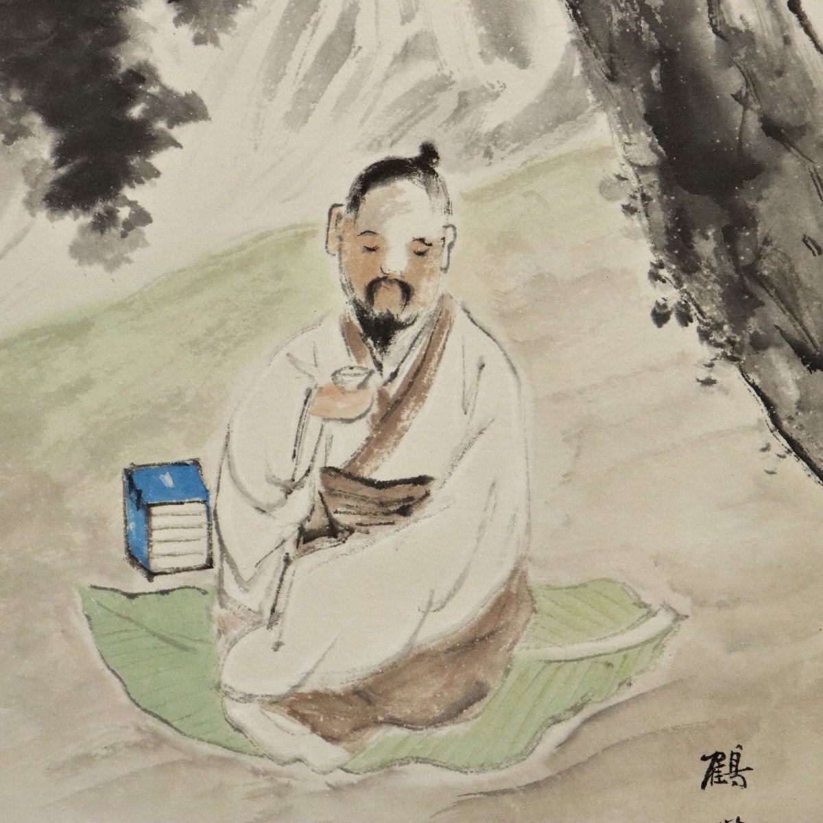 備後ゆかりの画家・森鶴巣による「観瀧靜思図」の掛軸です。瀧を前に静かに思索する人物を描いた文人趣味豊かな構図で、自然と精神世界の調和を感じさせる一幅。紙本ならではの素朴な墨趣も魅力で、地方文人文化の気風を今に伝える資料性と鑑賞性を兼ね備えた書画作品です。