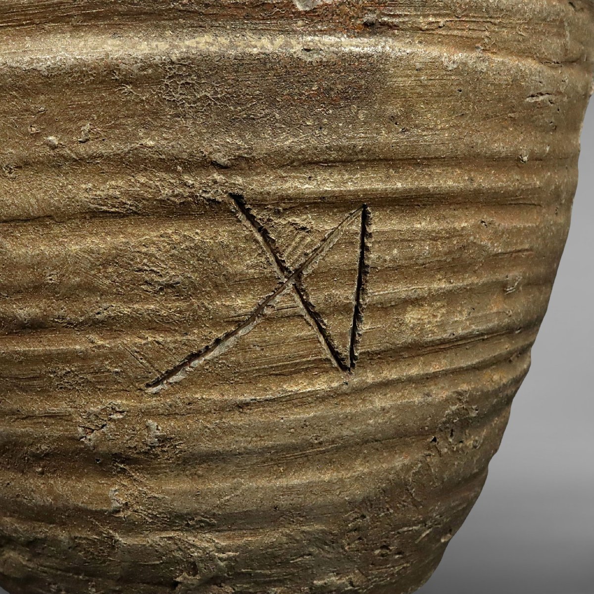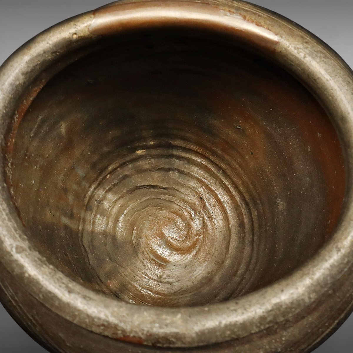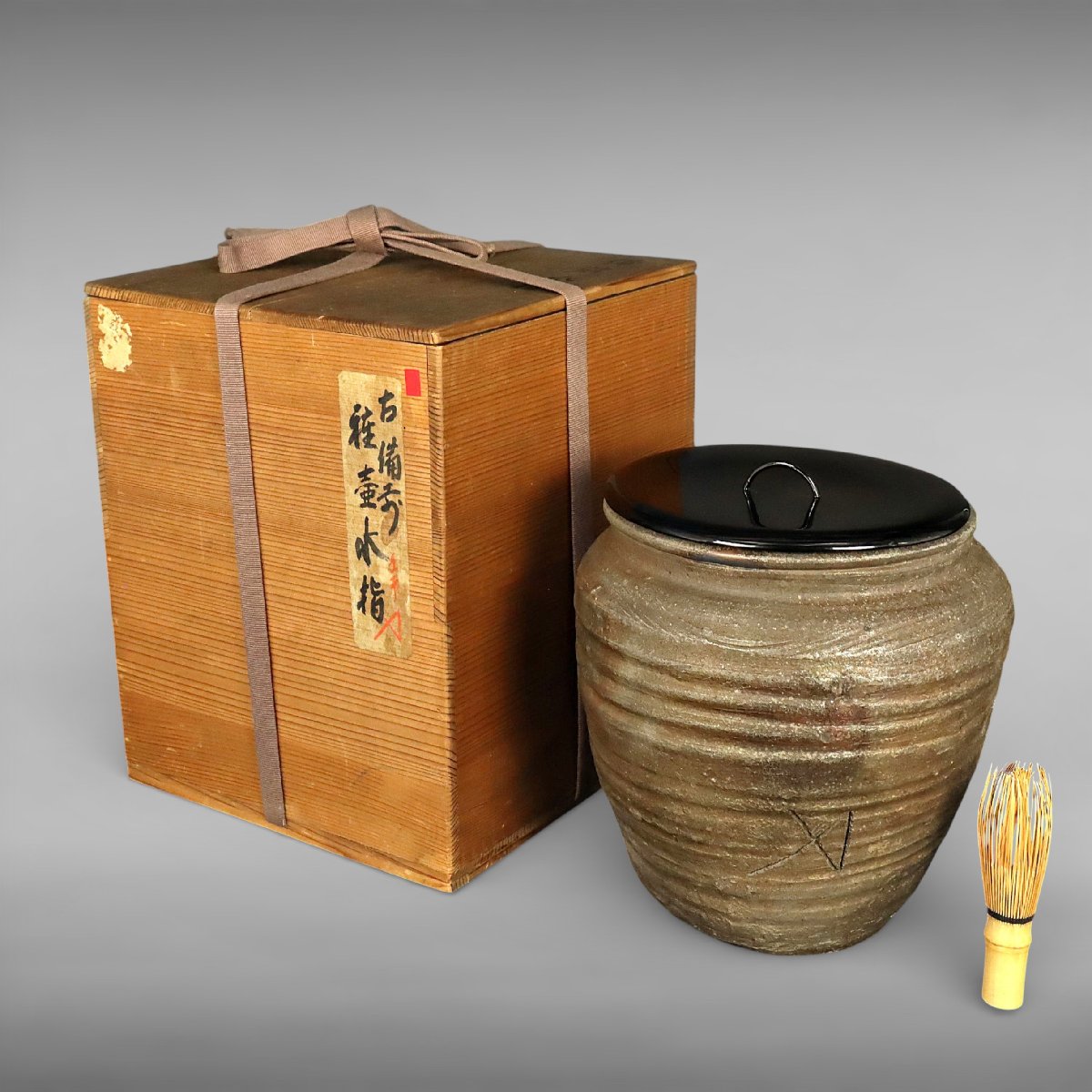 室町期に焼成された古備前の水指は、岡山県備前市周辺の窯による力強い焼締と素朴な造形が魅力の古陶です。箱付で伝来の趣も備え、茶道具・煎茶道具として格調ある佇まいを見せる古備前の味わい深い一品です。