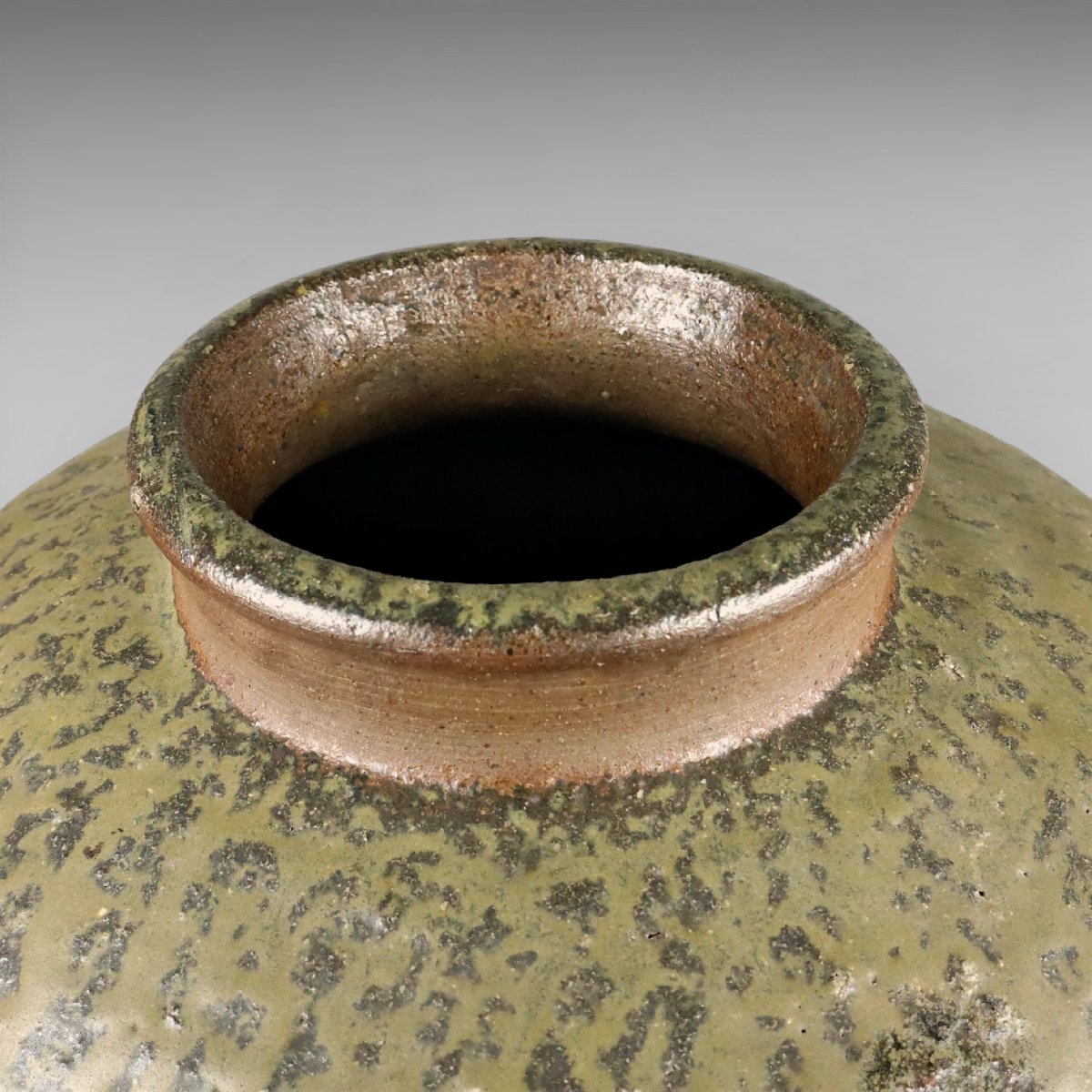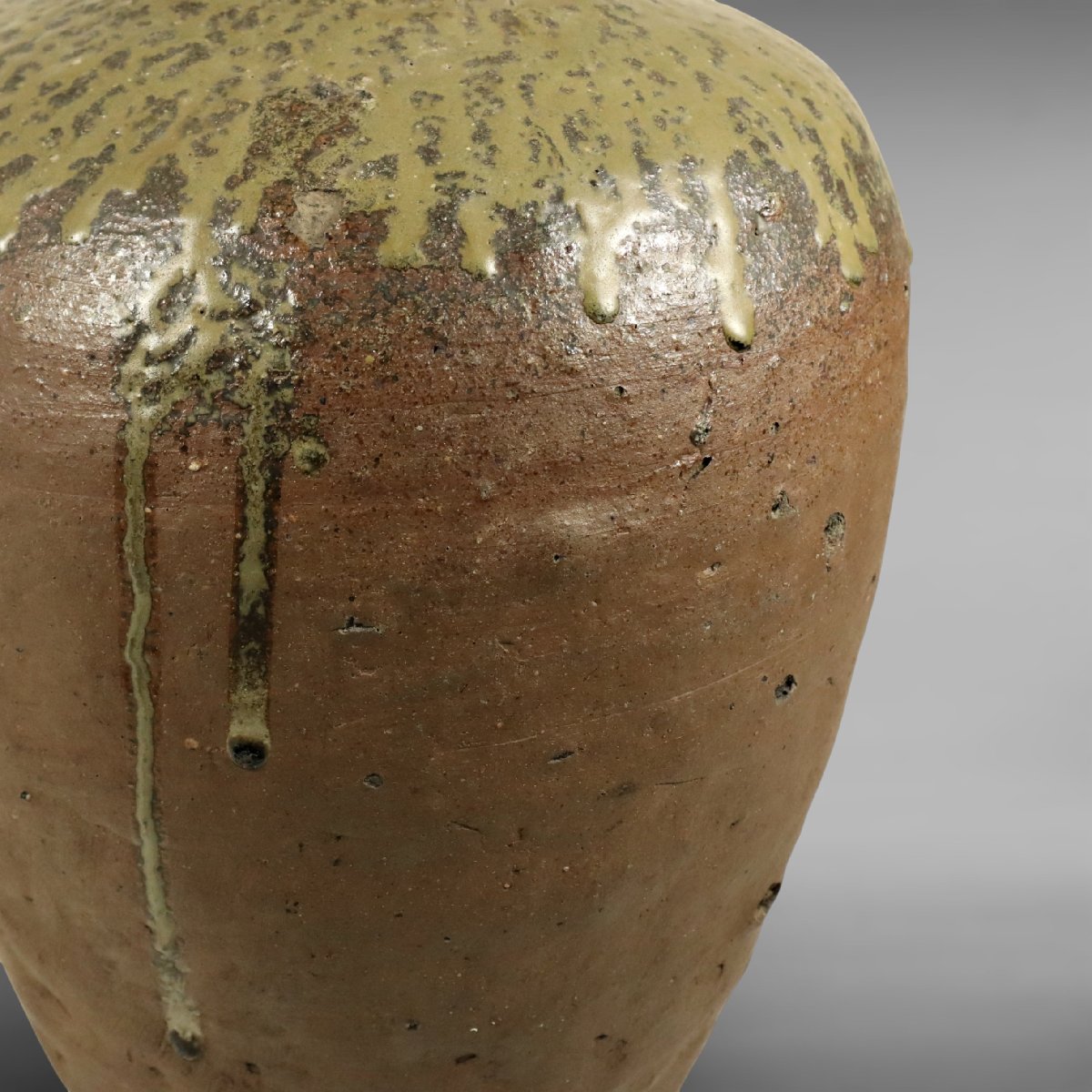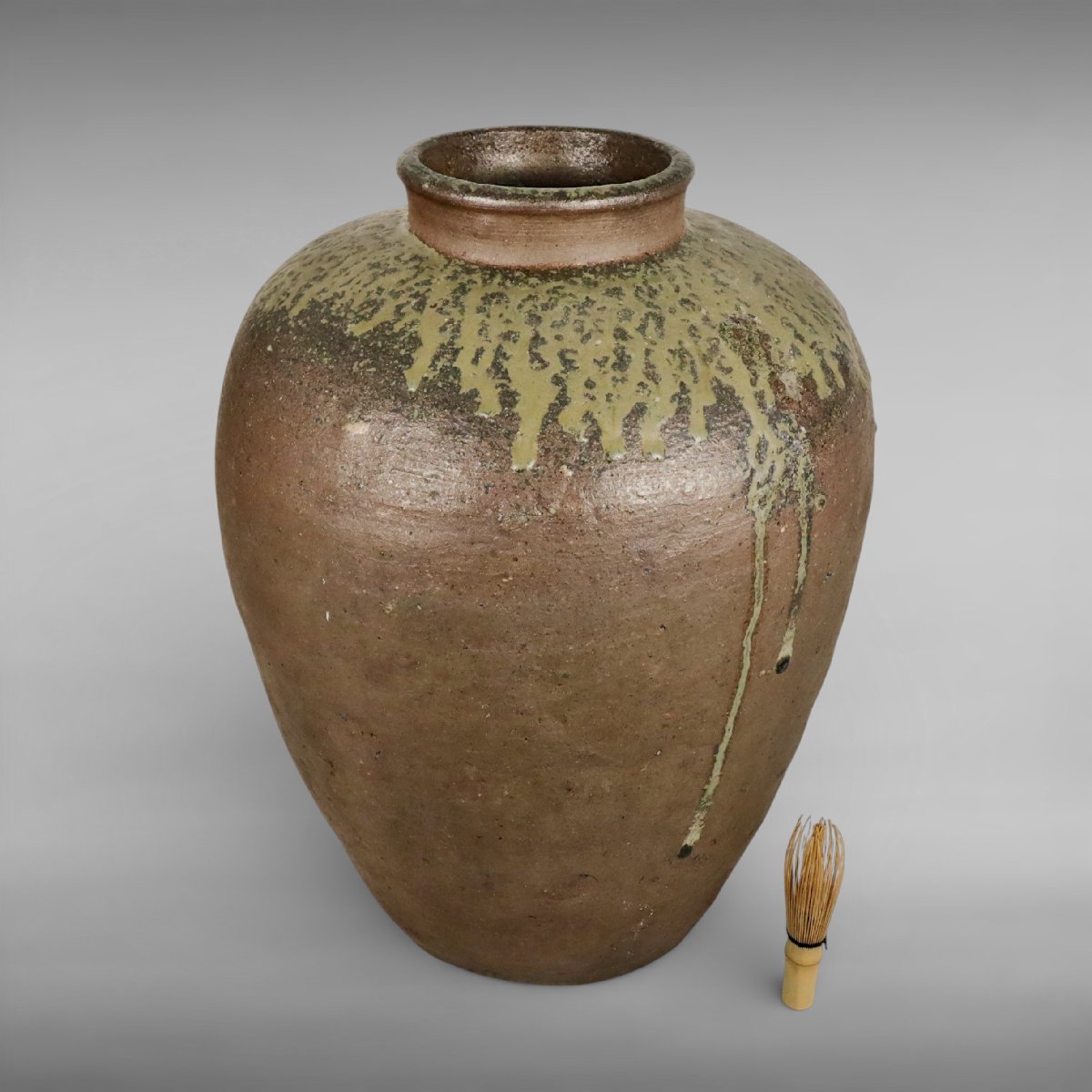 室町期に焼成された古備前の壺は、岡山県備前市周辺の窯による力強い焼締と雨垂れ景色が見どころの古陶です。自然釉が生む流動的な表情が時代の趣を伝え、花入としても評価の高い華道具として魅力ある一品です。