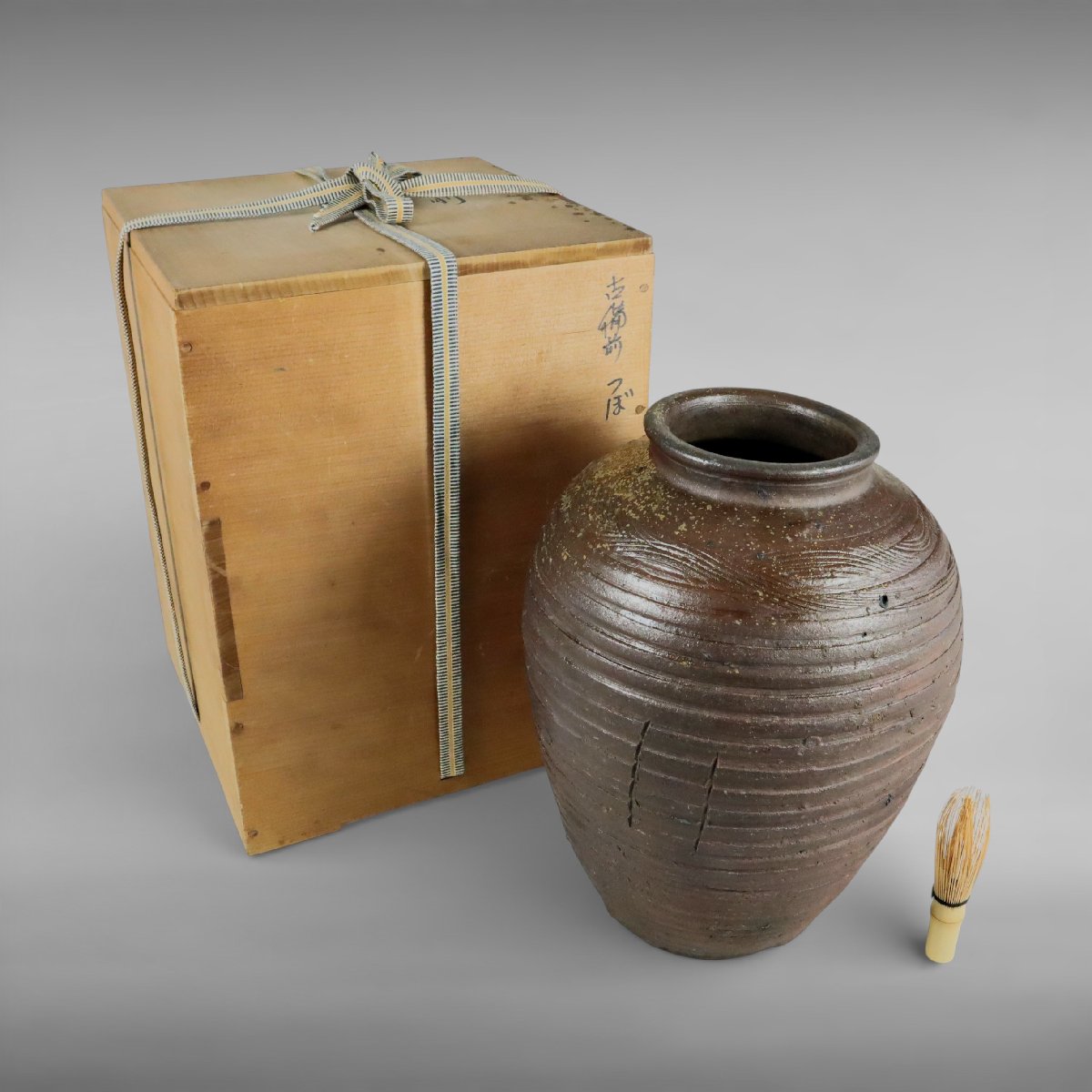 室町期に焼成された古備前の壷は、岡山県備前市周辺の窯による力強い焼締に波状紋と胡麻釉の景色が映える古陶です。自然釉の豊かな表情と箱付の伝来が時代の趣を深め、花入としても評価の高い華道具の佳品です。