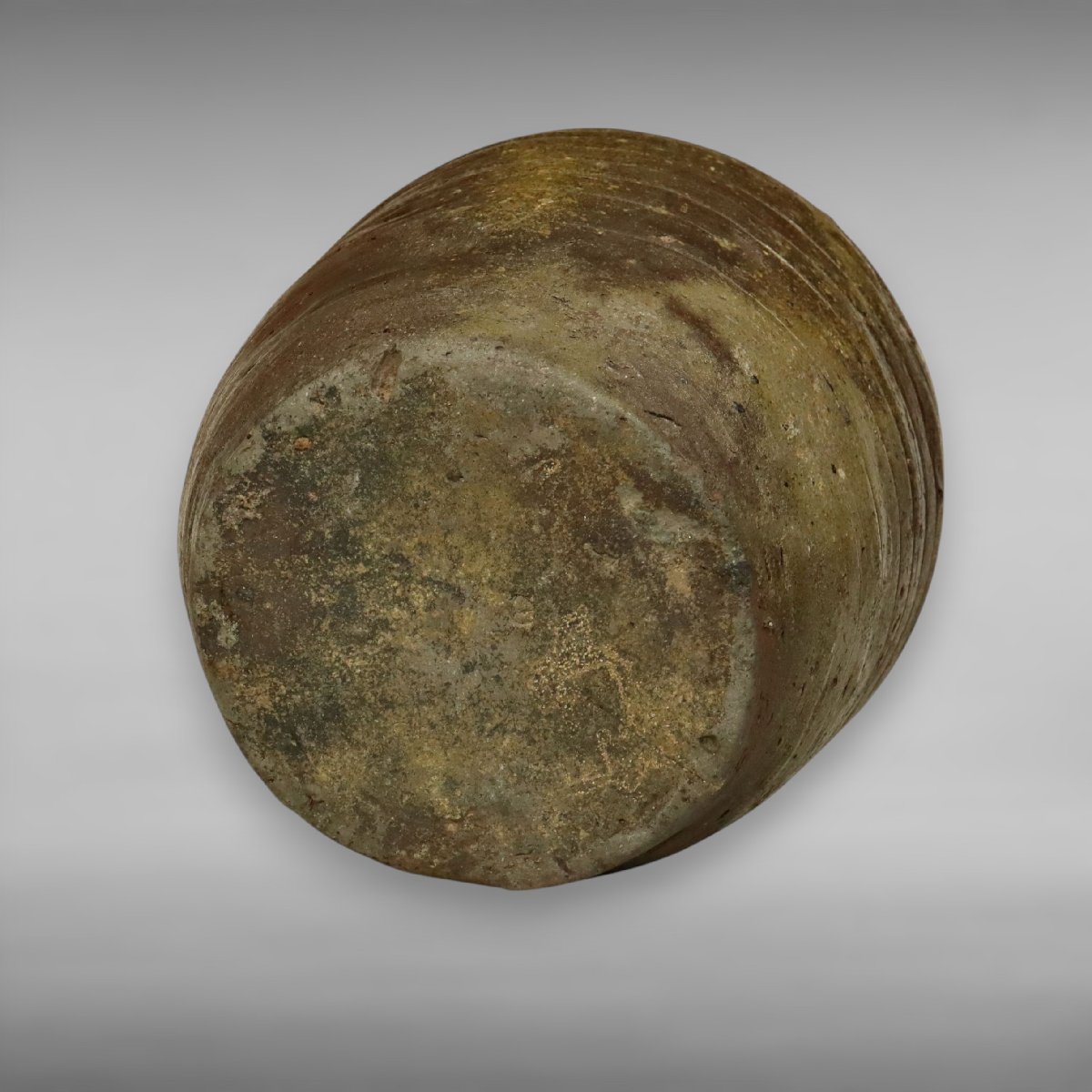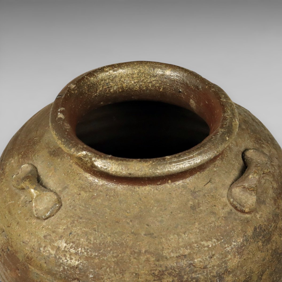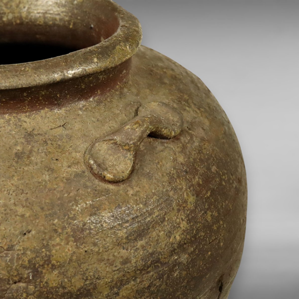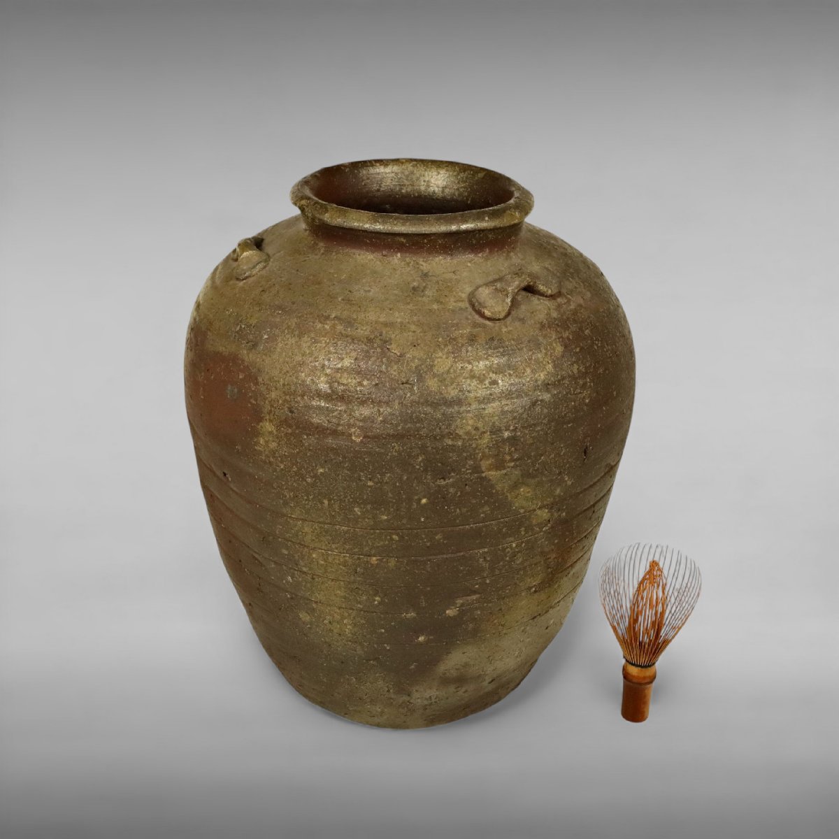 室町期の古備前による三耳壷です。岡山県備前市伊部に連なる古備前特有の素朴で力強い土味と均整の取れた三耳の造形が印象的で、中世古備前ならではの古格を今に伝える一作。華道具としても鑑賞性・蒐集価値の高い優品です。