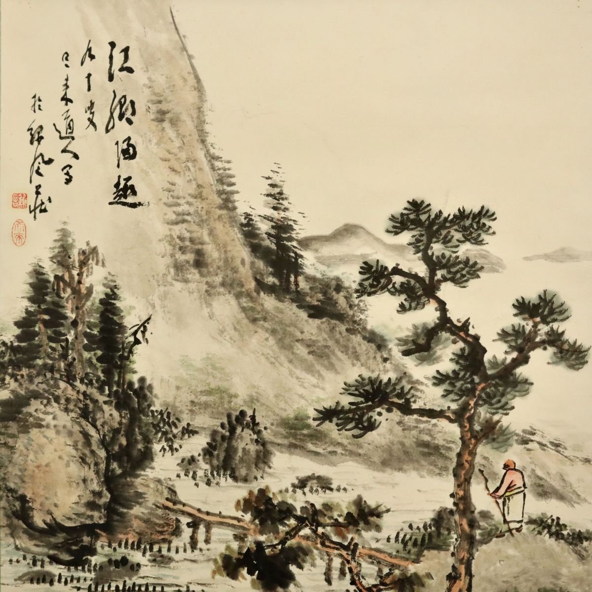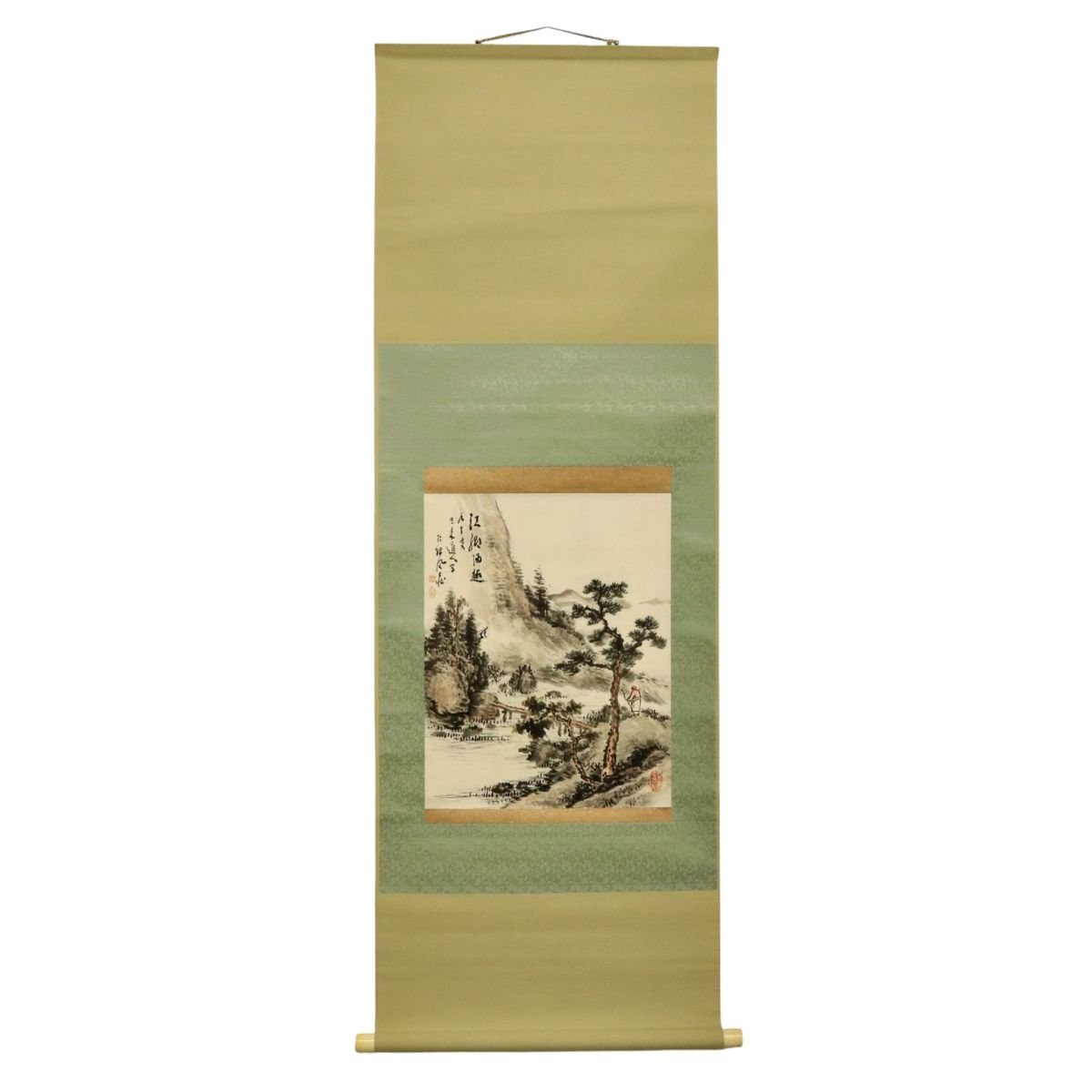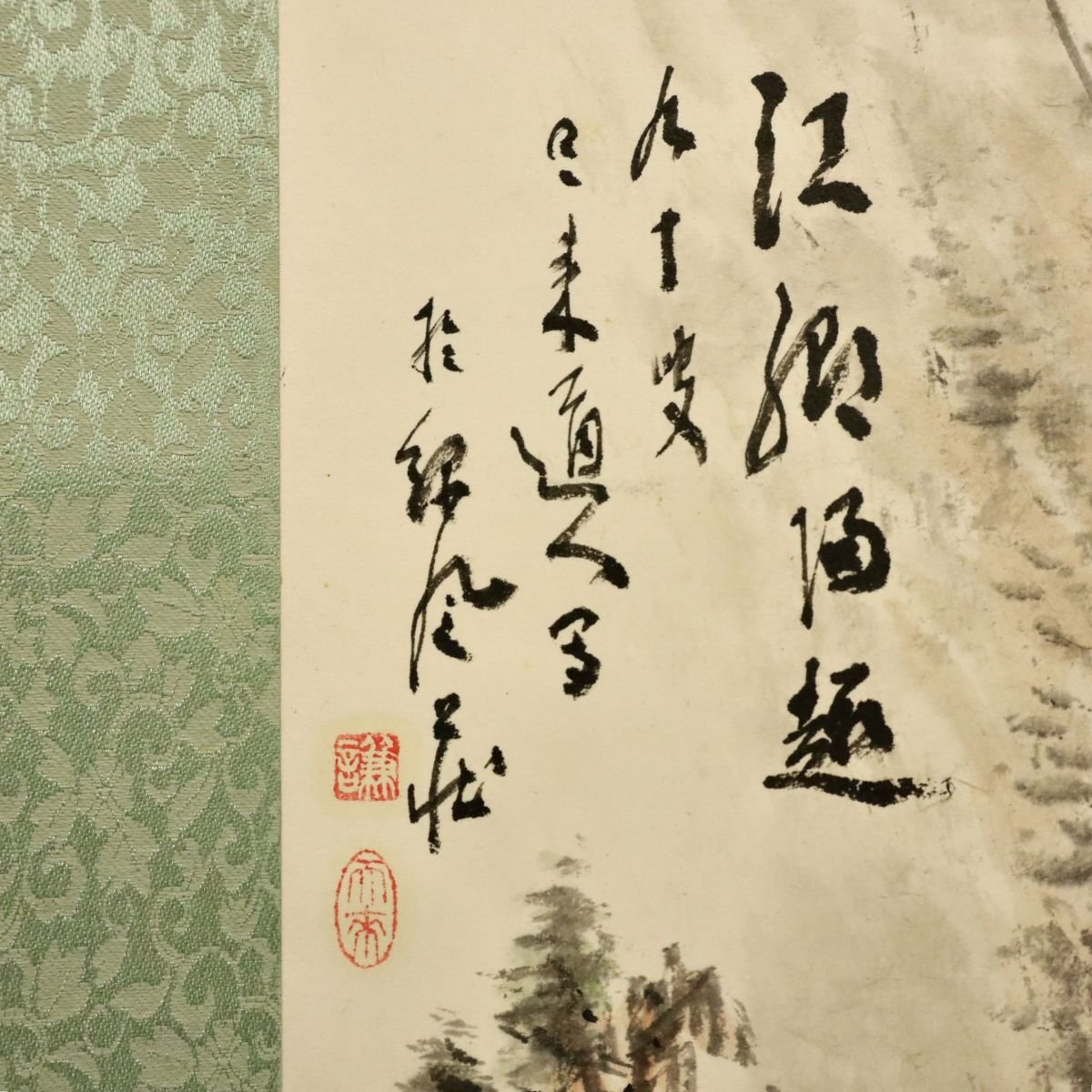 備後出身の書家・内藤天来による山水図の掛軸です。簡潔にして力強い筆致で山川の気韻を捉え、文人画の精神性と静謐な自然観を感じさせる一幅。共箱を備えた点も資料性が高く、近代備後文人文化の広がりを今に伝える鑑賞性と蒐集価値を兼ね備えた興味深い書画作品です。