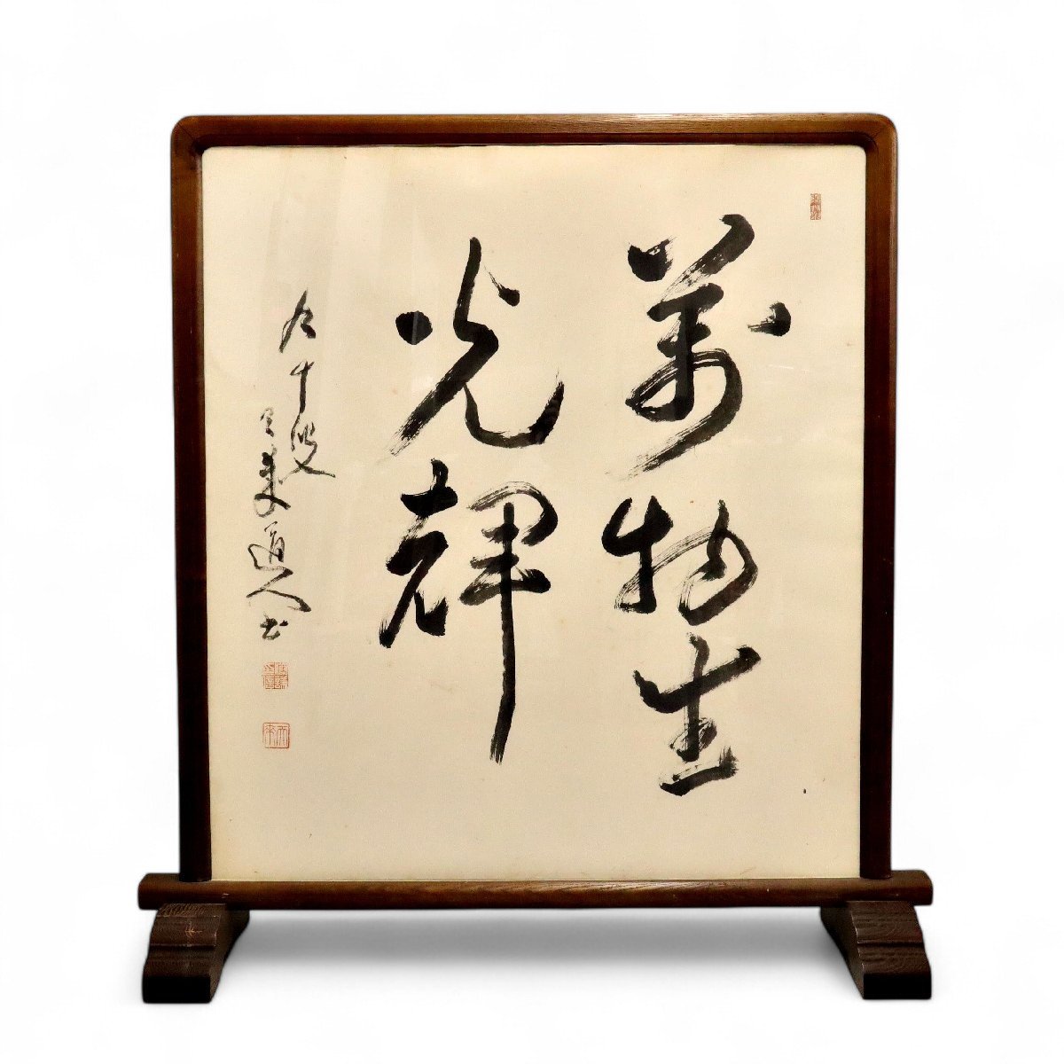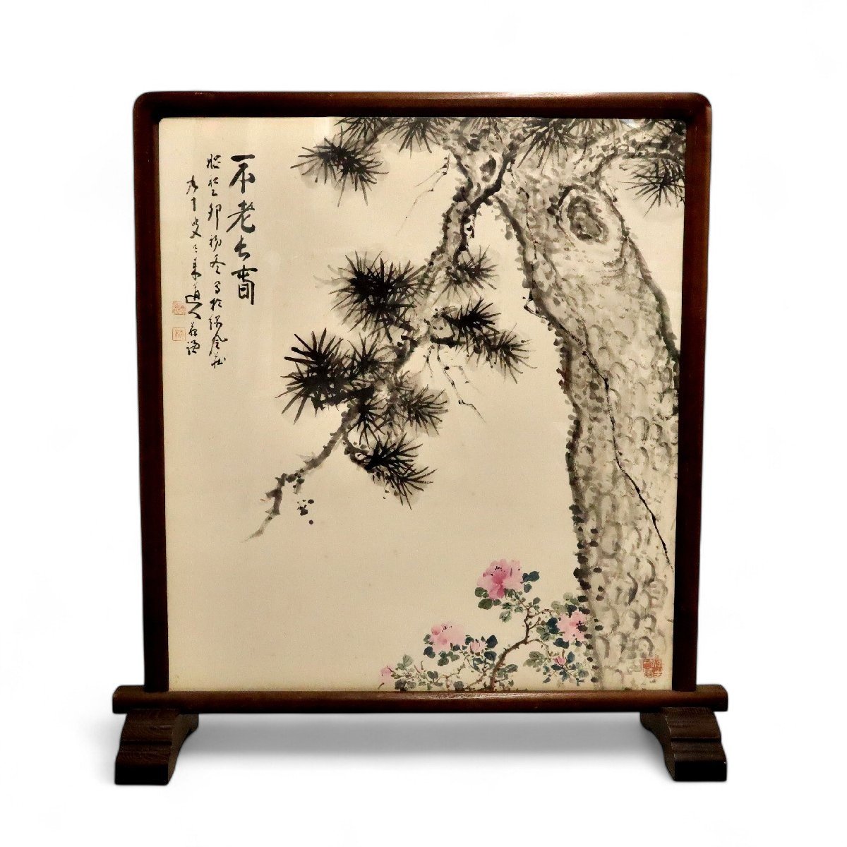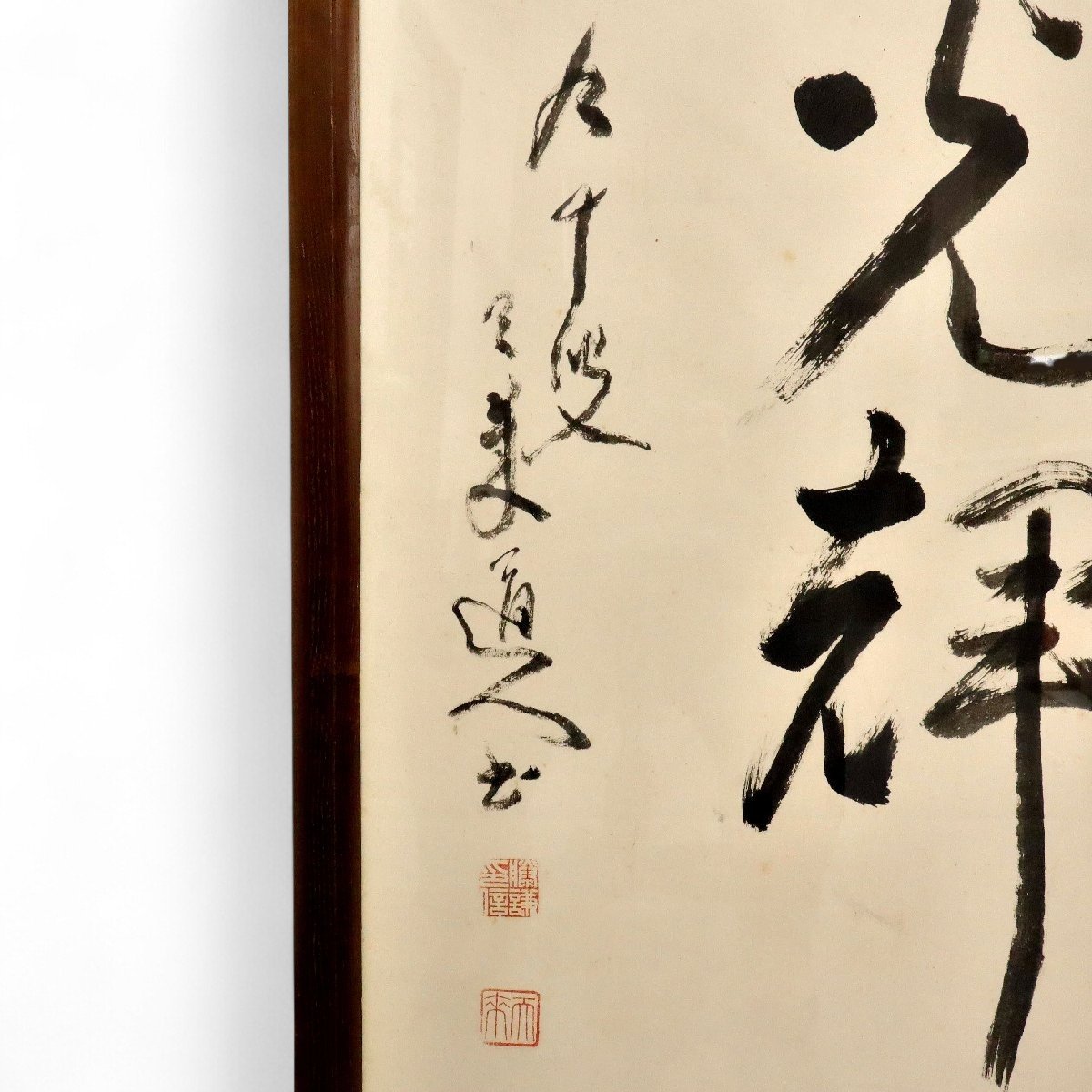 備後ゆかりの画家・内藤天来による水墨画の屏風作品です。墨の濃淡を巧みに生かした簡潔で力強い筆致により、静寂な空気感と奥行ある景趣を表現した格調高い一作。約108×91cmの存在感ある寸法で空間を引き締め、郷土美術の魅力と資料性を兼ね備えた鑑賞価値の高い骨董屏風です。