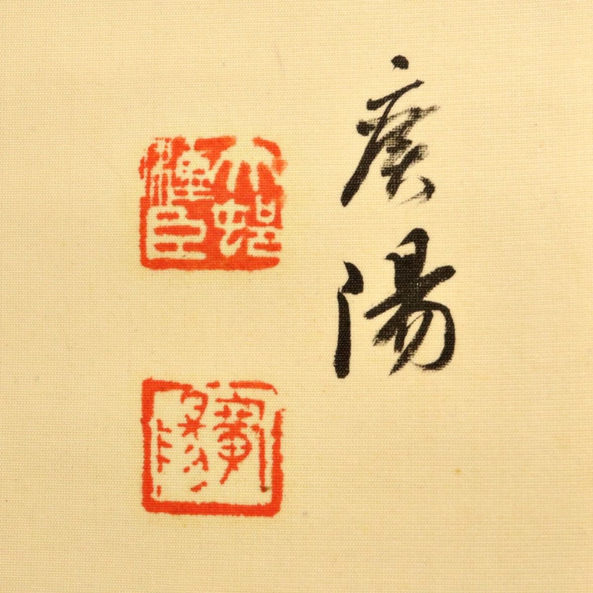 備後ゆかりの画家・大村廣陽による「中夏 緑柳黒馬」図の掛軸です。青々と茂る柳陰に佇む黒馬を端正かつ伸びやかな筆致で描き、静かな季節感と気品ある構図美が際立つ一幅。絹本ならではの柔らかな発色も魅力で、近代地方画壇の息吹を今に伝える鑑賞性と資料性を兼ね備えた書画作品です。