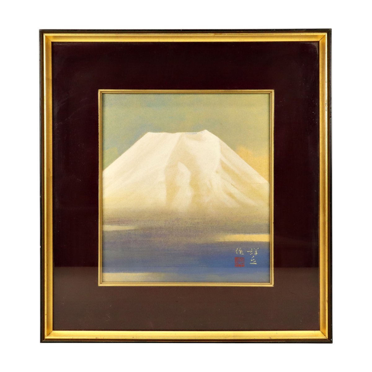 備後福山の絵師・大島祥丘による富士山図の色紙画です。約26×23cmの端正な画面に霊峰富士を簡潔に描き、落ち着いた色調と品格ある筆致が魅力。備後ゆかりの作家作品として蒐集や飾りに好適な風景画の一作です。