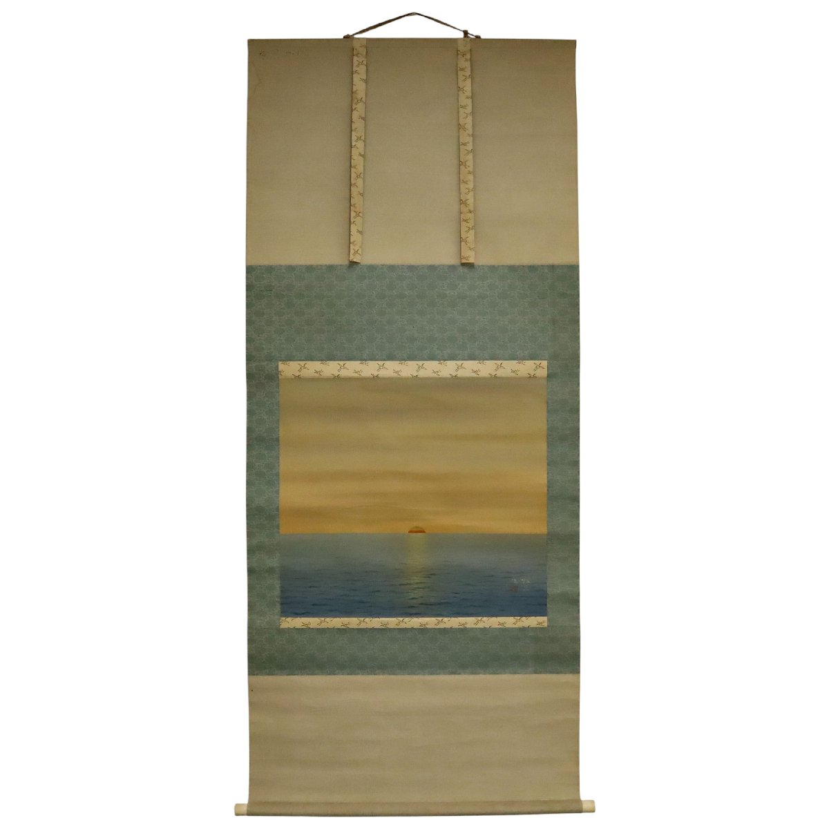 備後福山の絵師・大島祥丘による「日の出図」の掛軸です。昇る旭日を瑞祥的に描いた絹本作品で、やわらかな色彩と端正な構図が魅力。箱付で伝来の趣も備え、備後ゆかりの書画として蒐集価値ある一幅です。