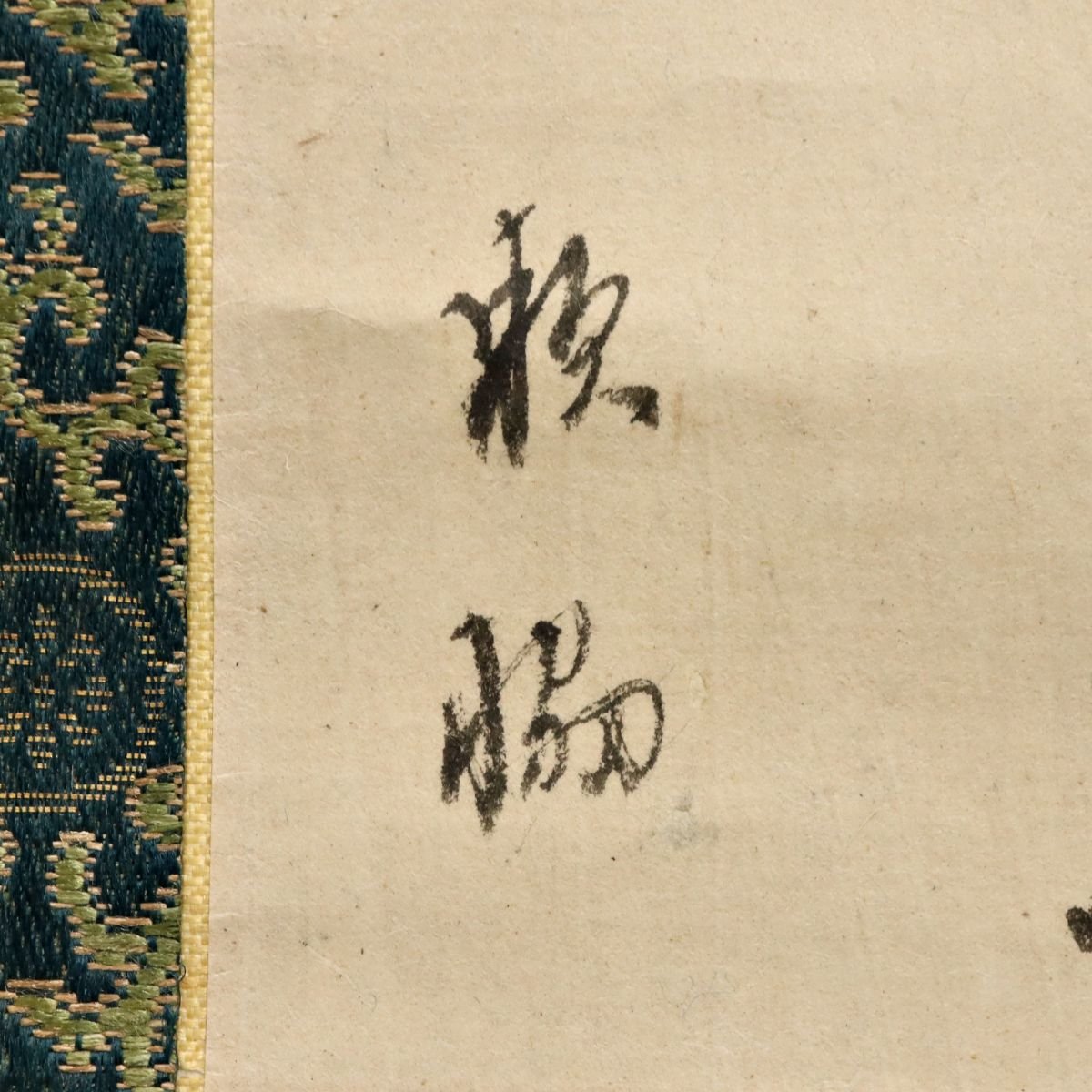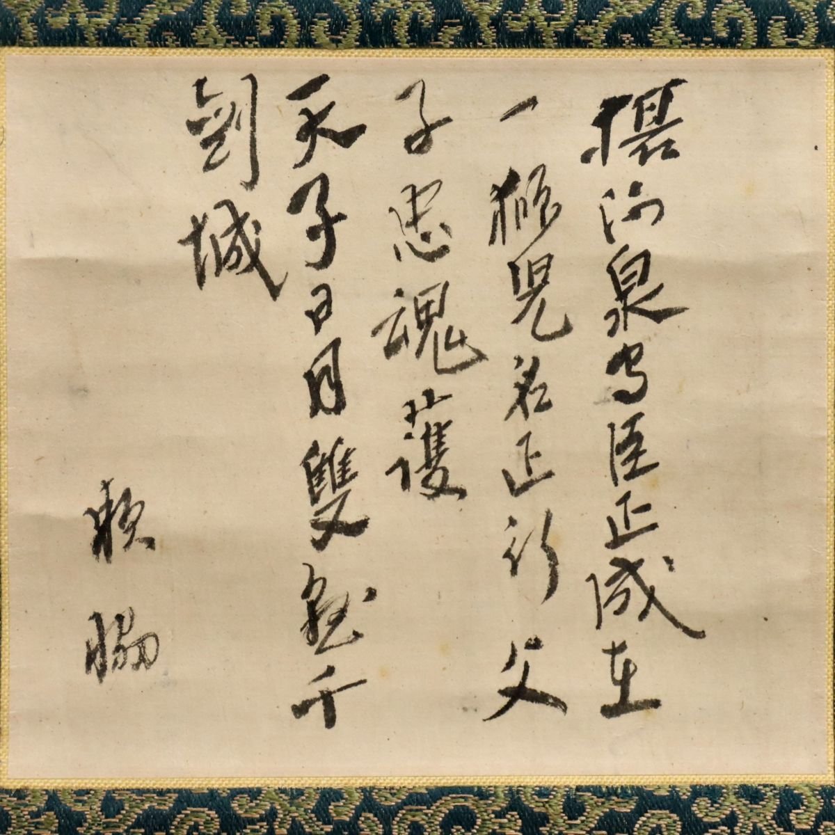 江戸時代後期の備後出身の儒学者・頼聿庵による七言絶句の掛軸で、頼元緒の識を添えた由緒ある一幅です。端正で格調高い筆致には頼家学統の気風が色濃く表れ、詩書一体の文人文化を今に伝えます。識箱を備え資料性も高く、近世備後文人世界の広がりを感じさせる蒐集価値ある書画資料です。