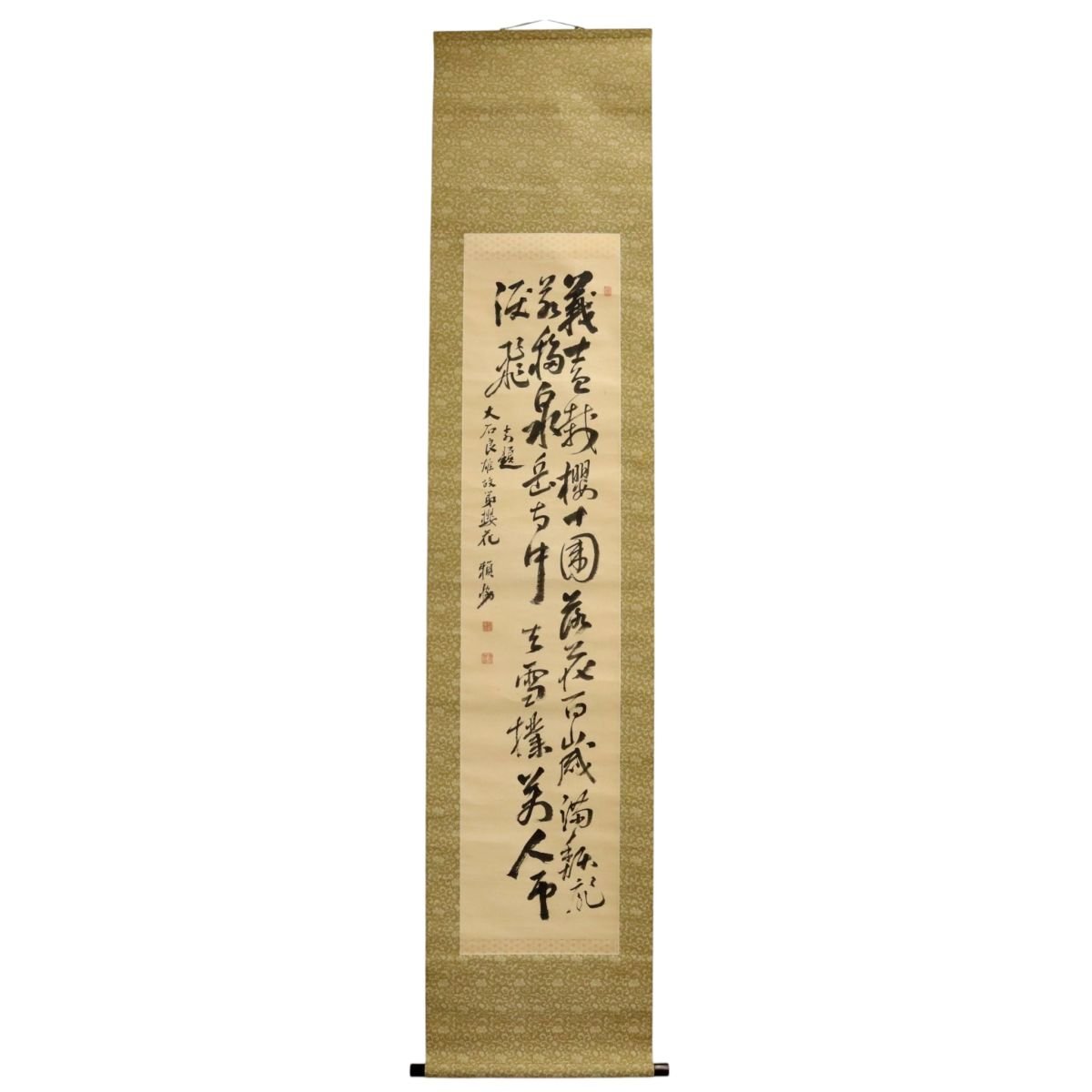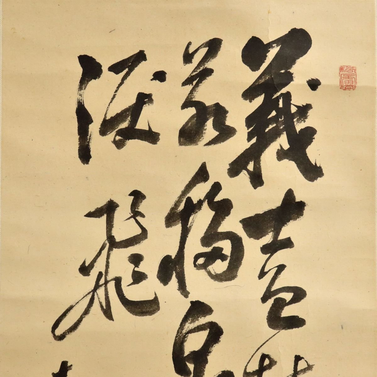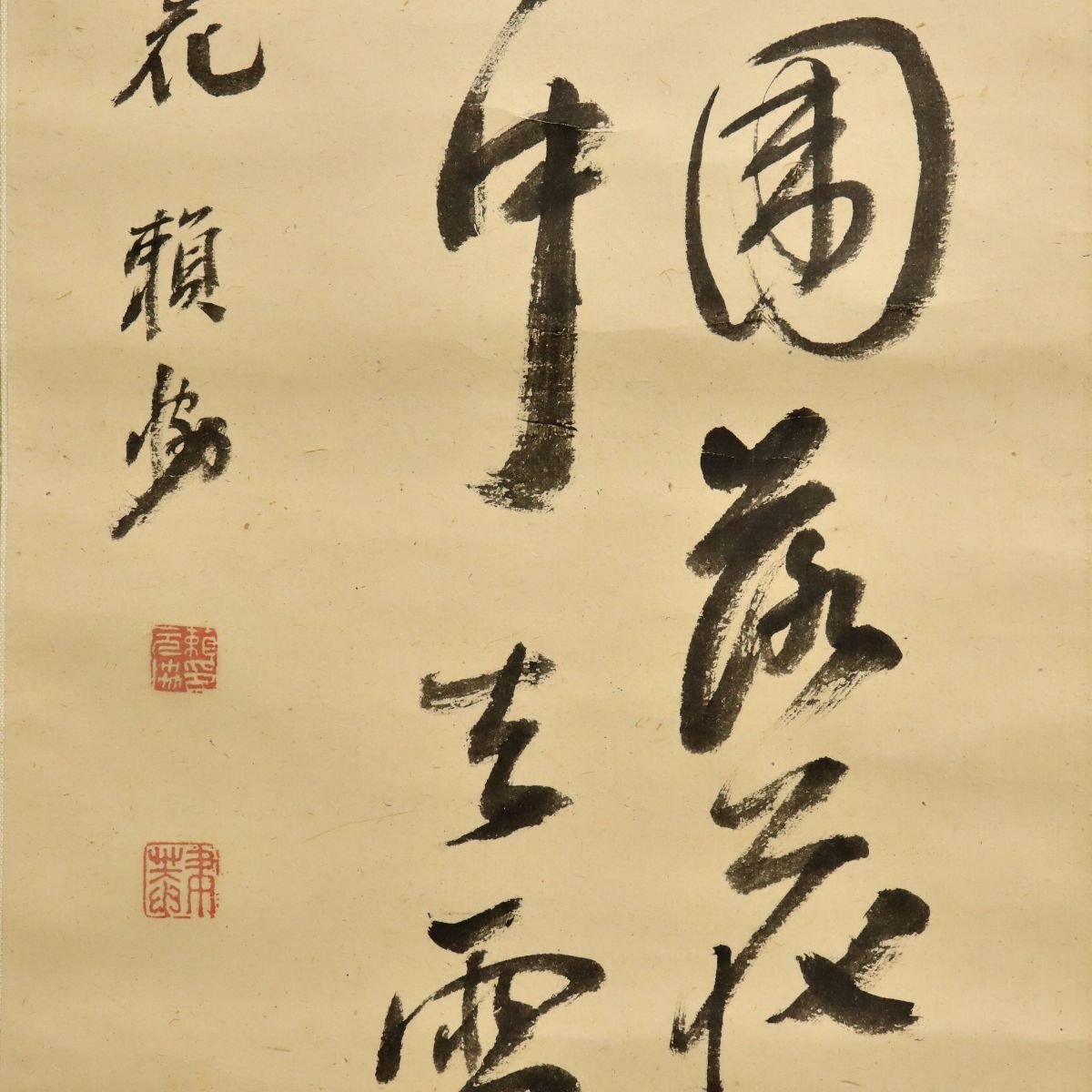 江戸時代の儒学者で安芸国広島(現・広島市)ゆかりの頼聿庵による三行書掛軸。端正で格調高い筆致に学統の気品が漂い、頼元緒による識箱が伝来の確かさを補強します。頼家系譜を伝える備後ゆかりの紙本作品として収集価値ある一幅です。