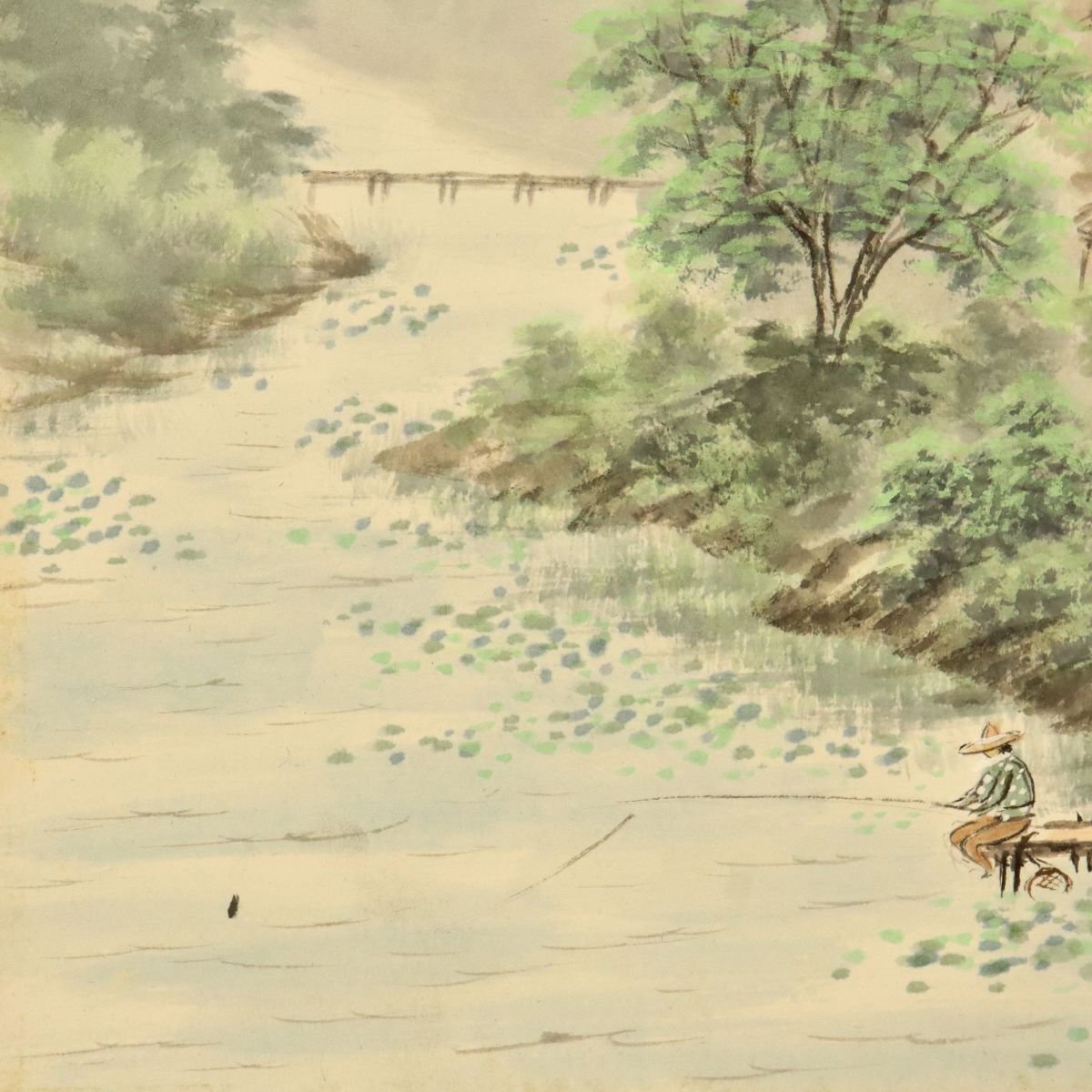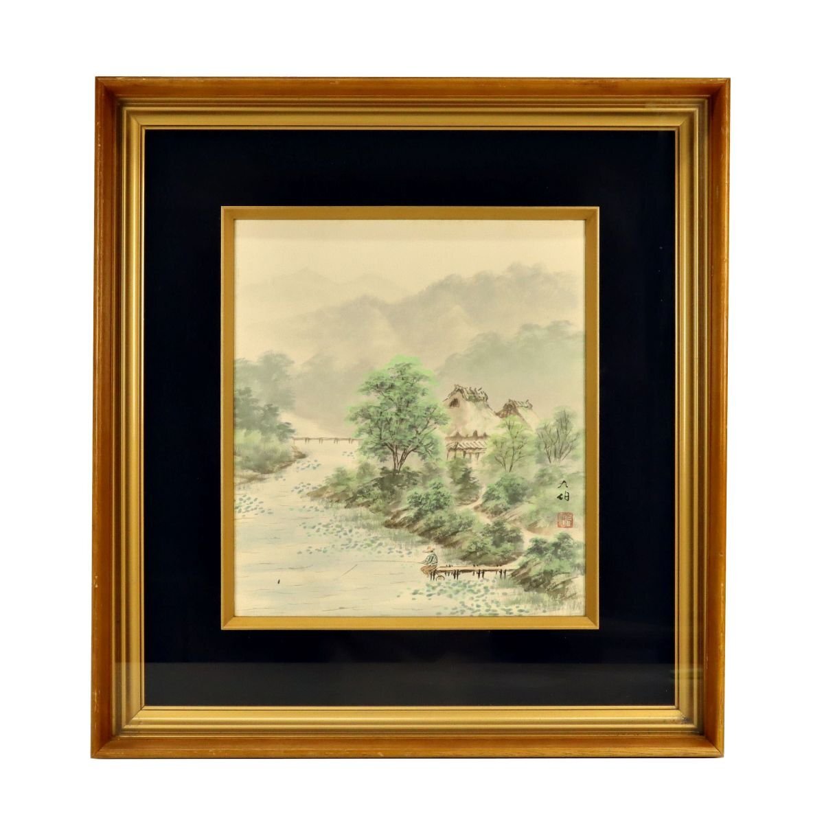 岡山県出身の日本画家、高田九伯(たかだ きゅうはく)による肉筆の色紙画です。師である伊東深水譲りの優美さと、独自の繊細な筆致で描かれた風景は、見る人の心に静寂と安らぎをもたらします。