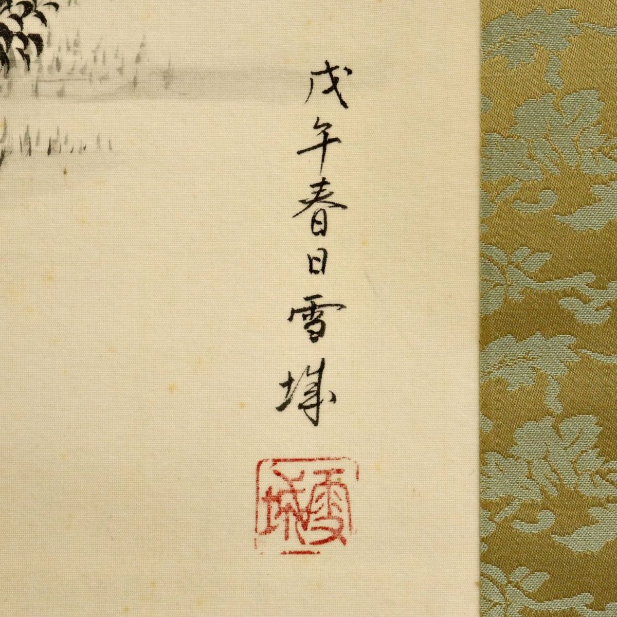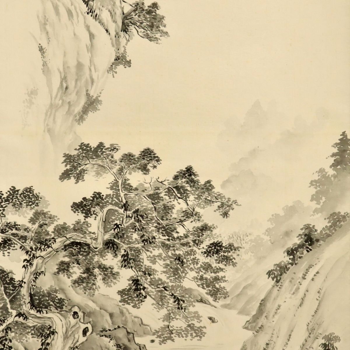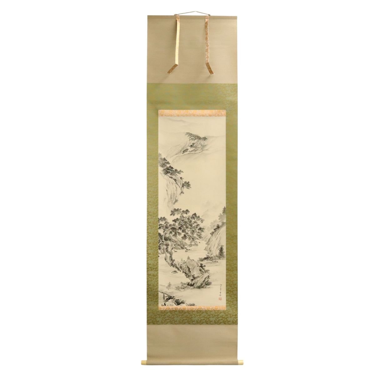 備後ゆかりの画家・佐々木雪城による水墨山水図の掛軸です。にじみと余白を活かした静謐な筆致が、山水の奥行と気韻を巧みに表現し、見る者を幽遠の景へと誘います。絹本ならではの柔らかな墨調も魅力で、共箱を備えた近代地方画壇の息吹を伝える鑑賞性と資料価値を兼ね備えた一幅です。