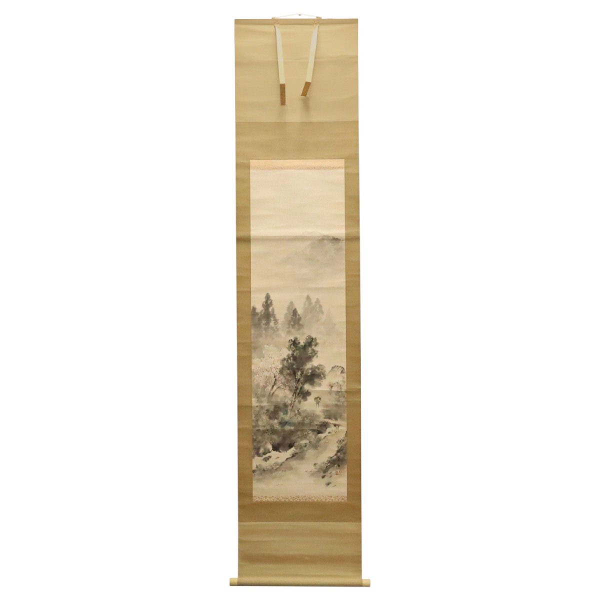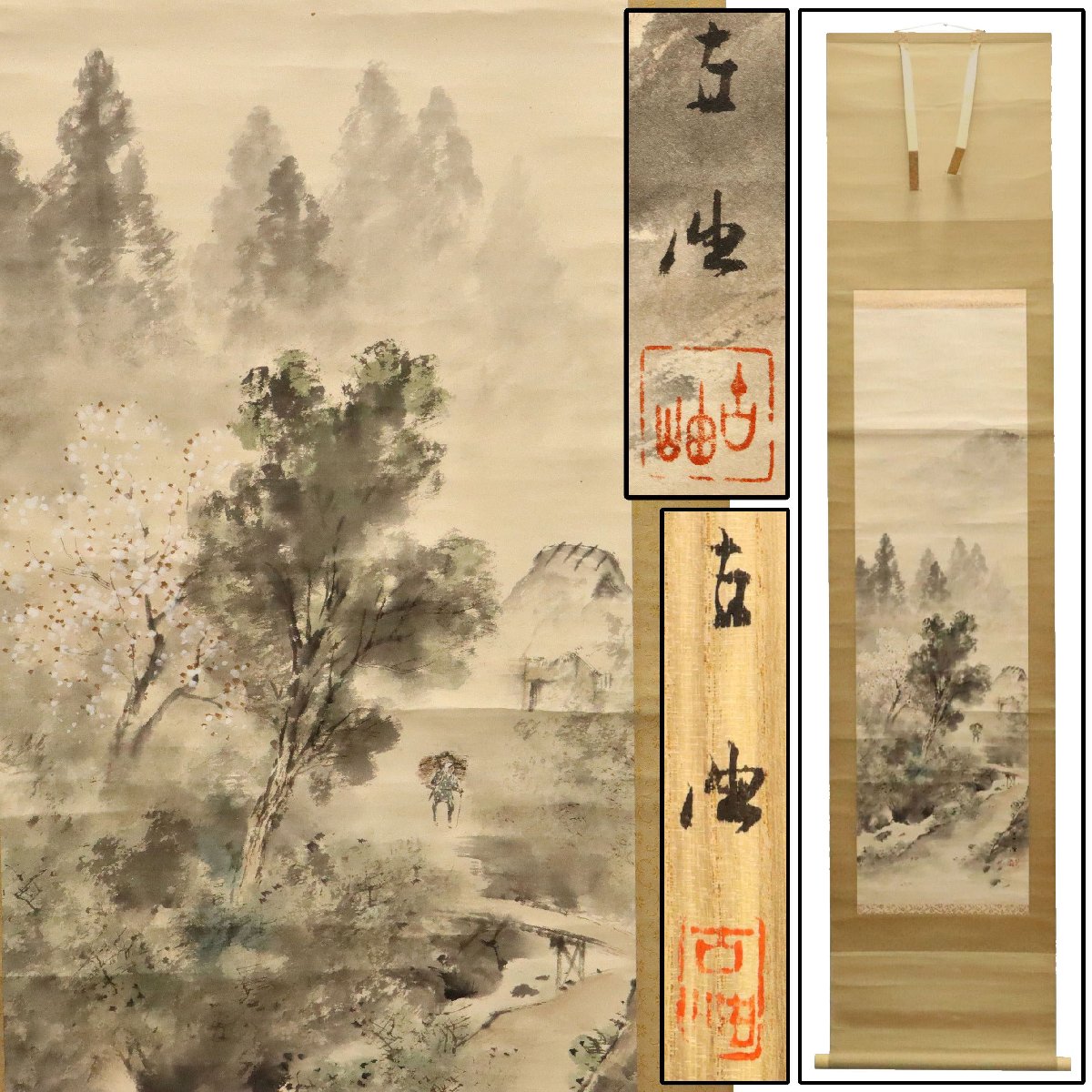 備後(広島県福山市周辺)にゆかりの佐藤古岫による飛泉の図紙本掛軸。水の躍動と静寂の対比が生む山水の美を表現した書画作品。共箱付きで保存良好、床の間や茶席に映える骨董掛軸の逸品です。