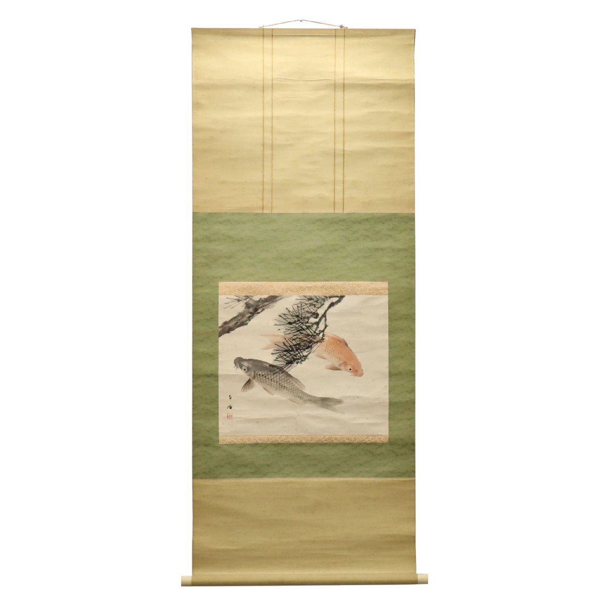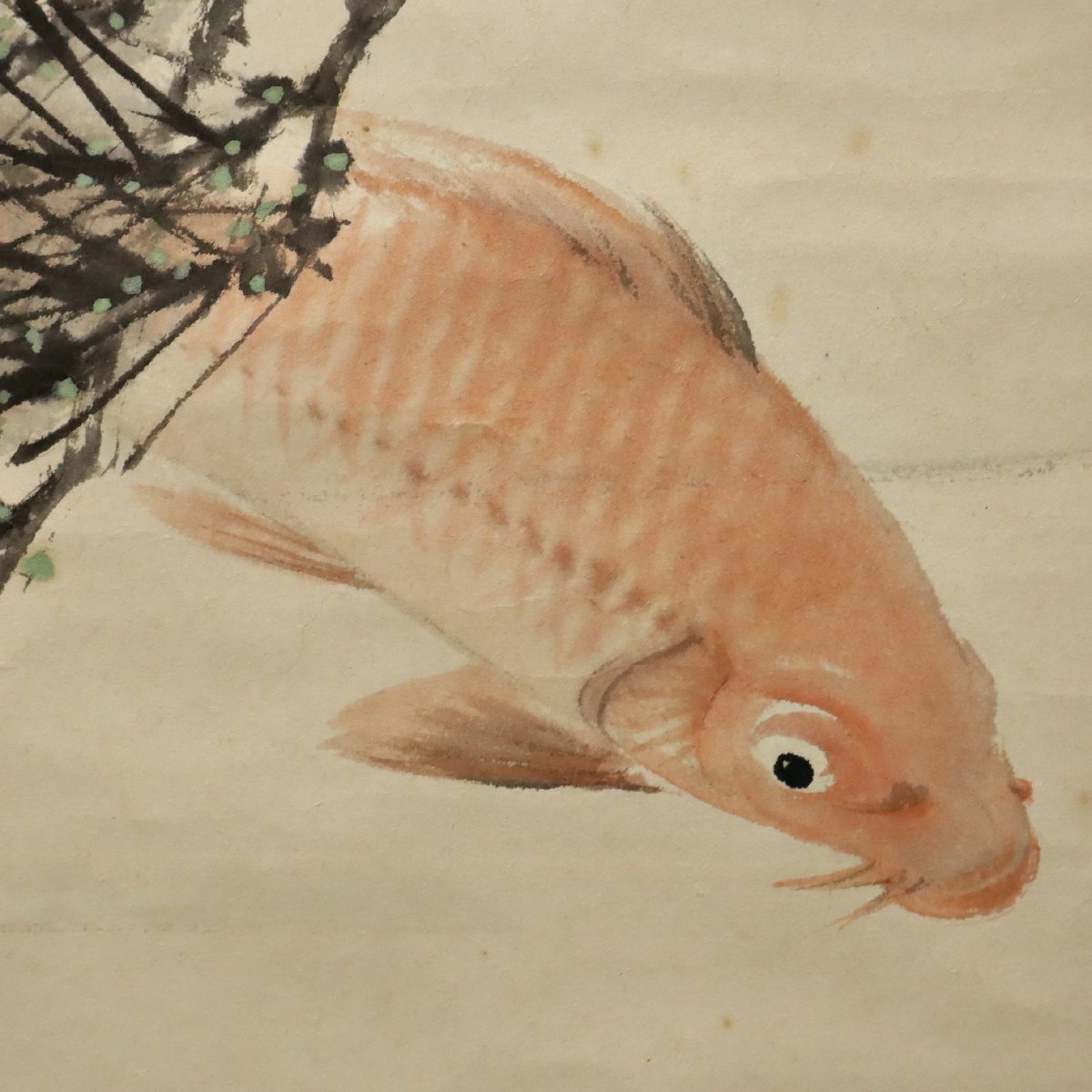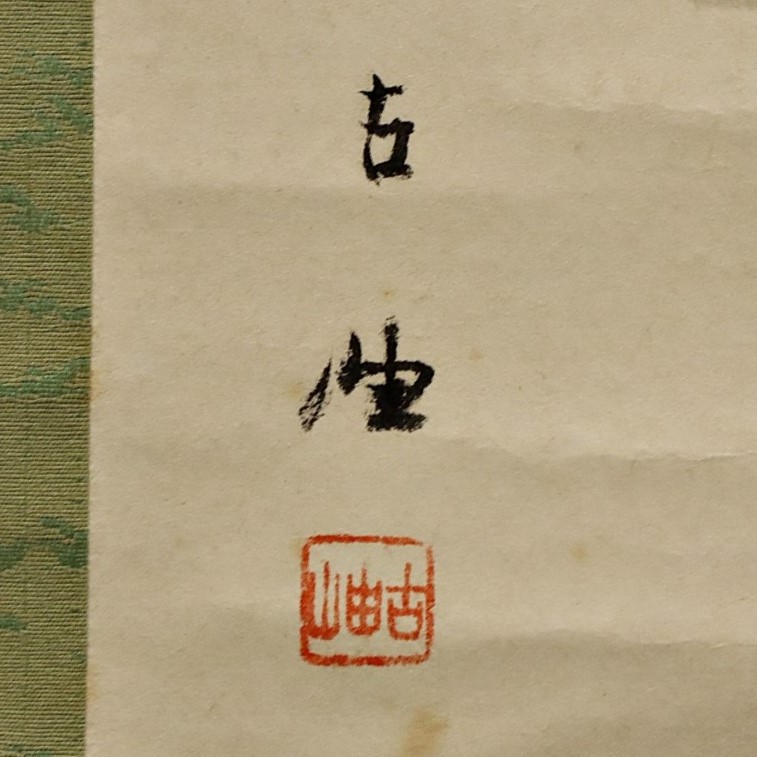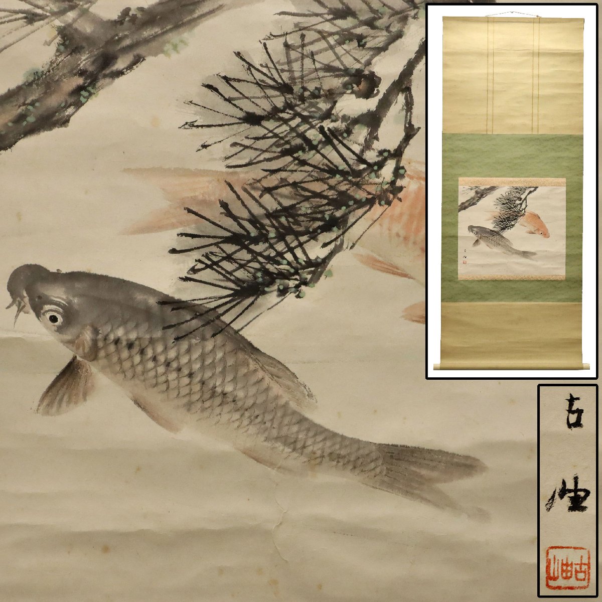 佐藤古岫による鯉図紙本掛軸。備後ゆかりの画系に連なる作として、水中を力強く泳ぐ鯉の姿を端正な筆致で描き、躍動と静寂が共存する構図が魅力です。余白を生かした日本画的表現により生命感が際立ち、吉祥画としても好まれた骨董書画の一幅で資料性も高い作品です。