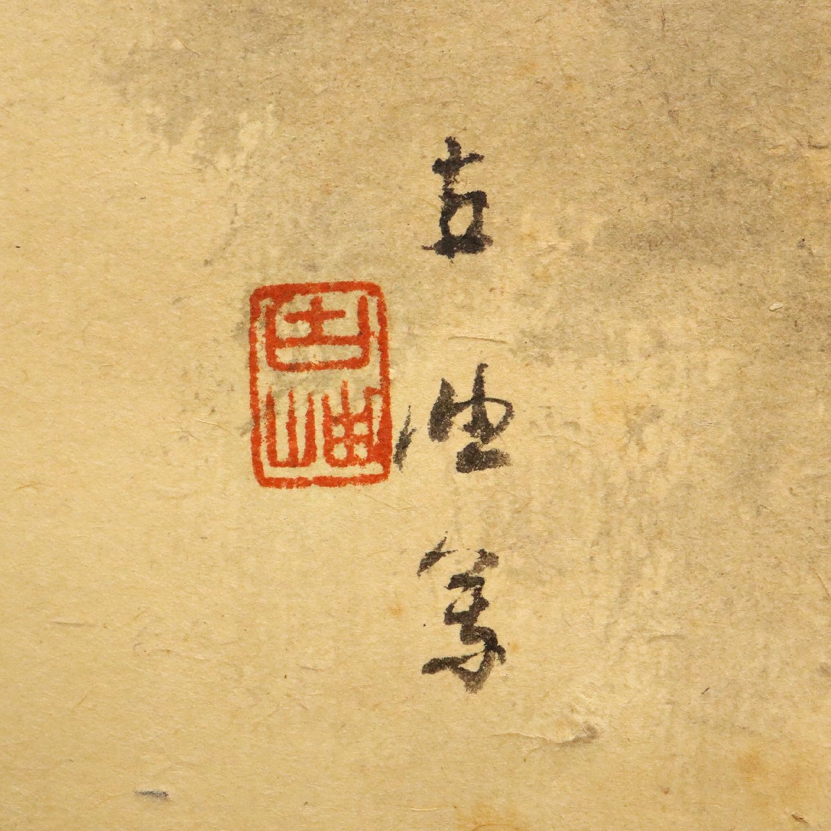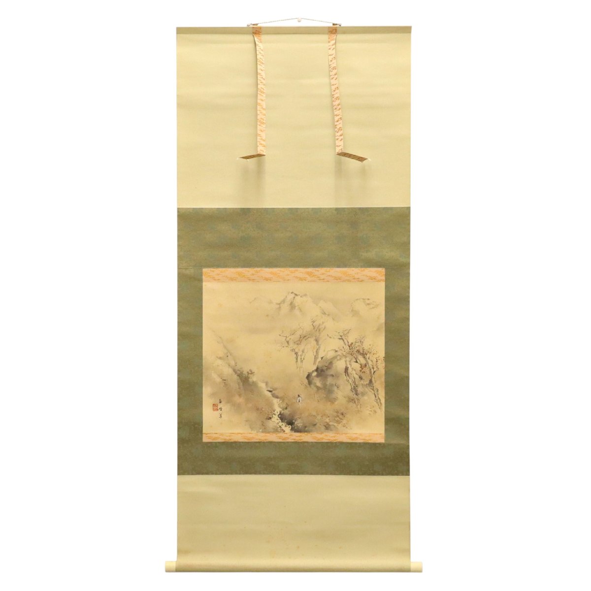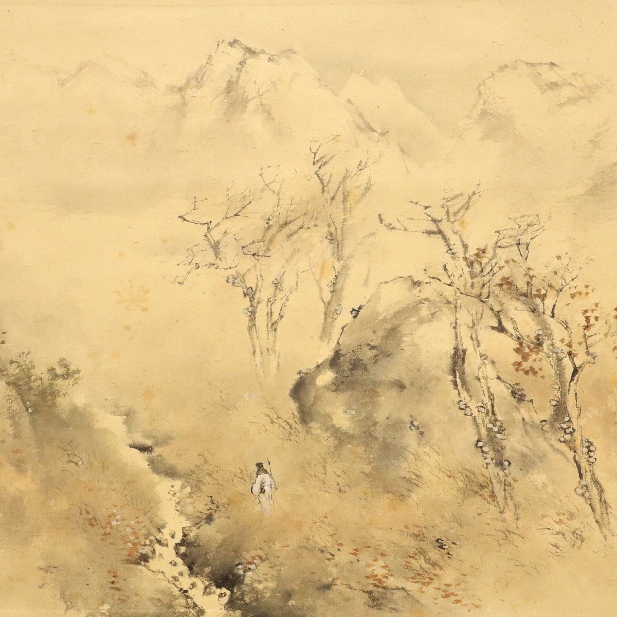 備後・福山市ゆかりの画人・佐藤古岫による「山中導士図」紙本掛軸。共箱付の書画骨董で、山中に佇む導士の静謐な姿を端正な筆致で描き、自然観と精神性が融合した格調高い美術品です。深い余白表現が魅力の希少な一幅です。