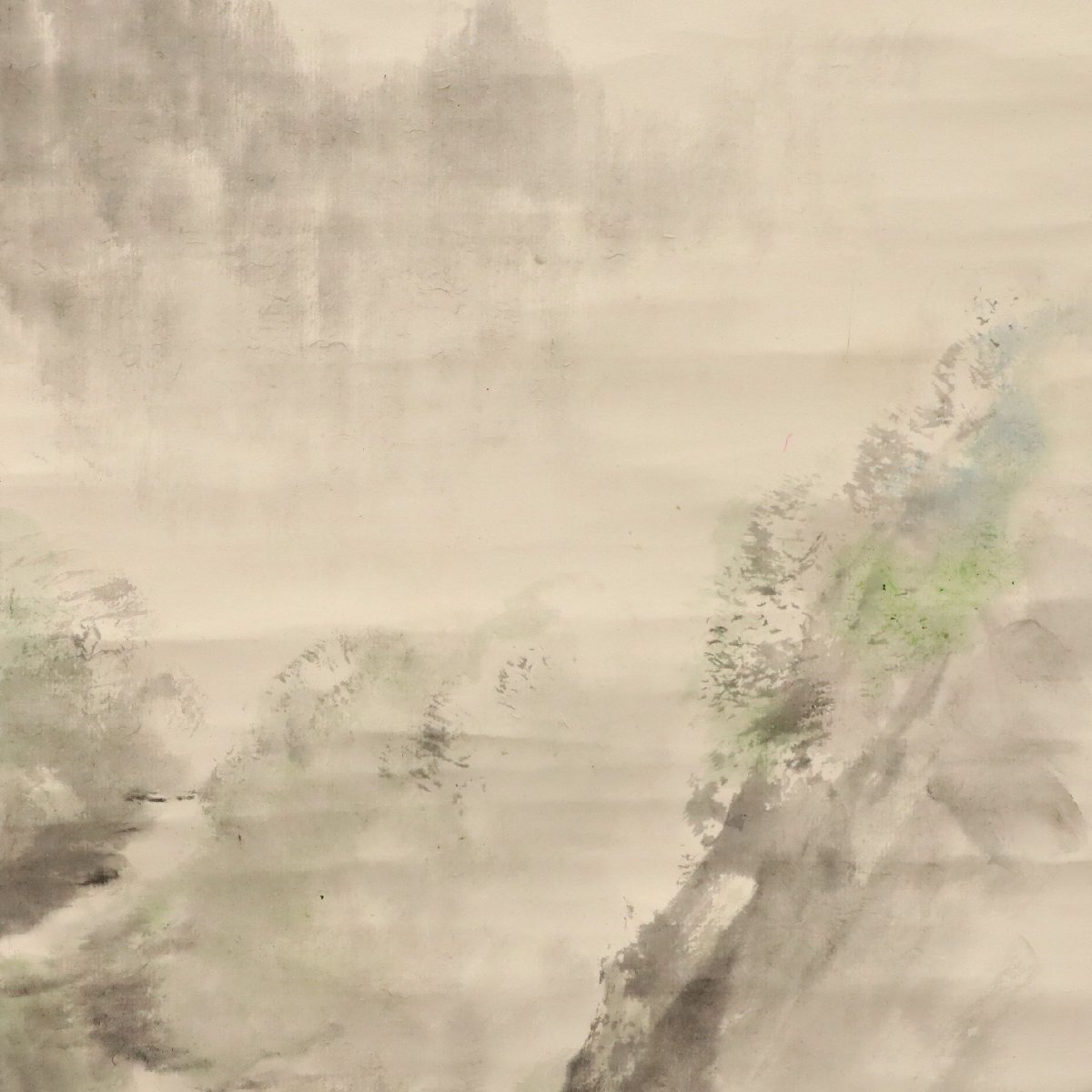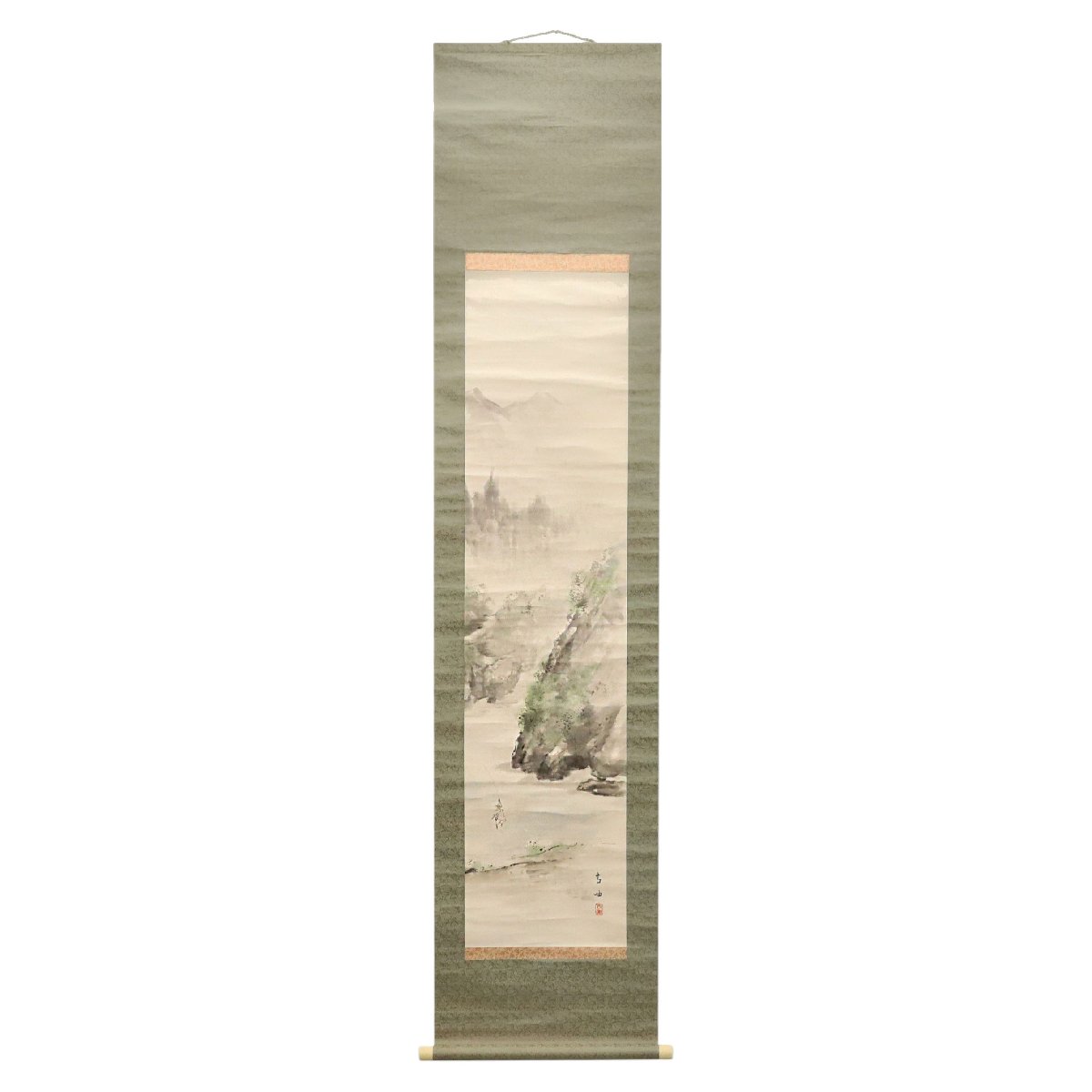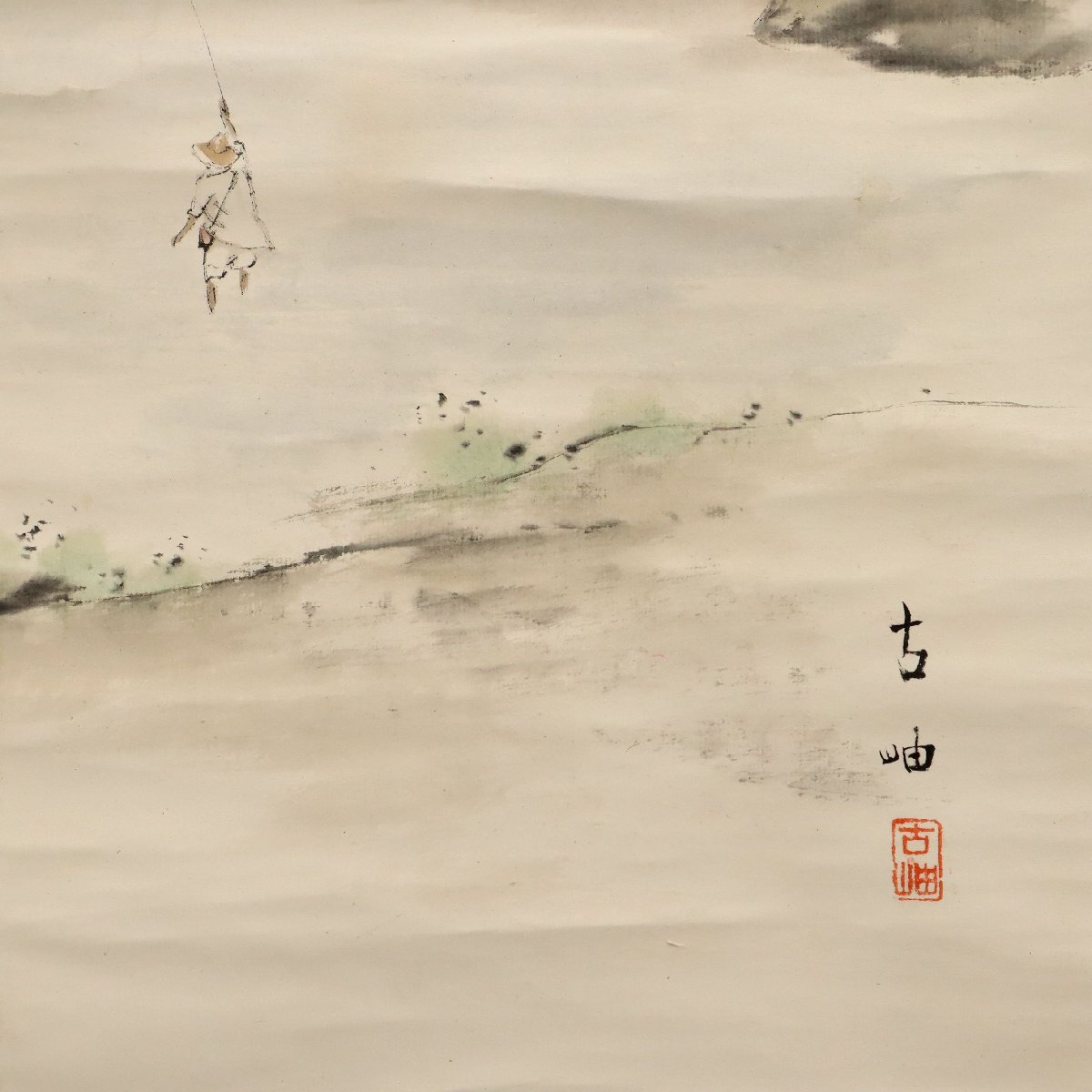 備後ゆかりの画人・佐藤古岫による山水に釣り人図の紙本掛軸です。静かな山水の中に釣り人を配した詩情豊かな構図が印象的で、文人趣味あふれる自然観と地方画壇の気風を今に伝える一幅。備後書画文化を知る発見性ある味わい深い古美術作品です。