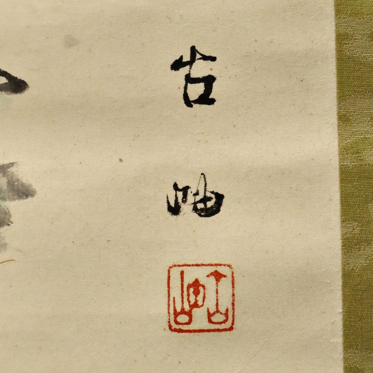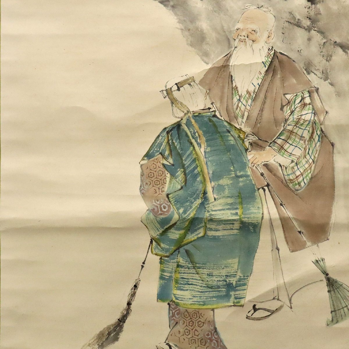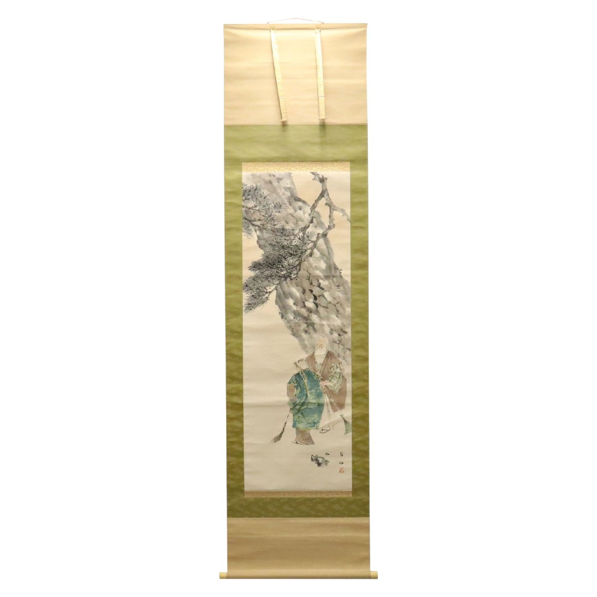 備後(広島県福山市周辺)ゆかりとされる佐藤古岫による「高砂図」掛軸です。共箱付きで、松と老夫婦(高砂)の吉祥画題を端正な筆致で描いた書画作品です。茶席や和室に格調を添える骨董掛軸としておすすめの逸品です。
