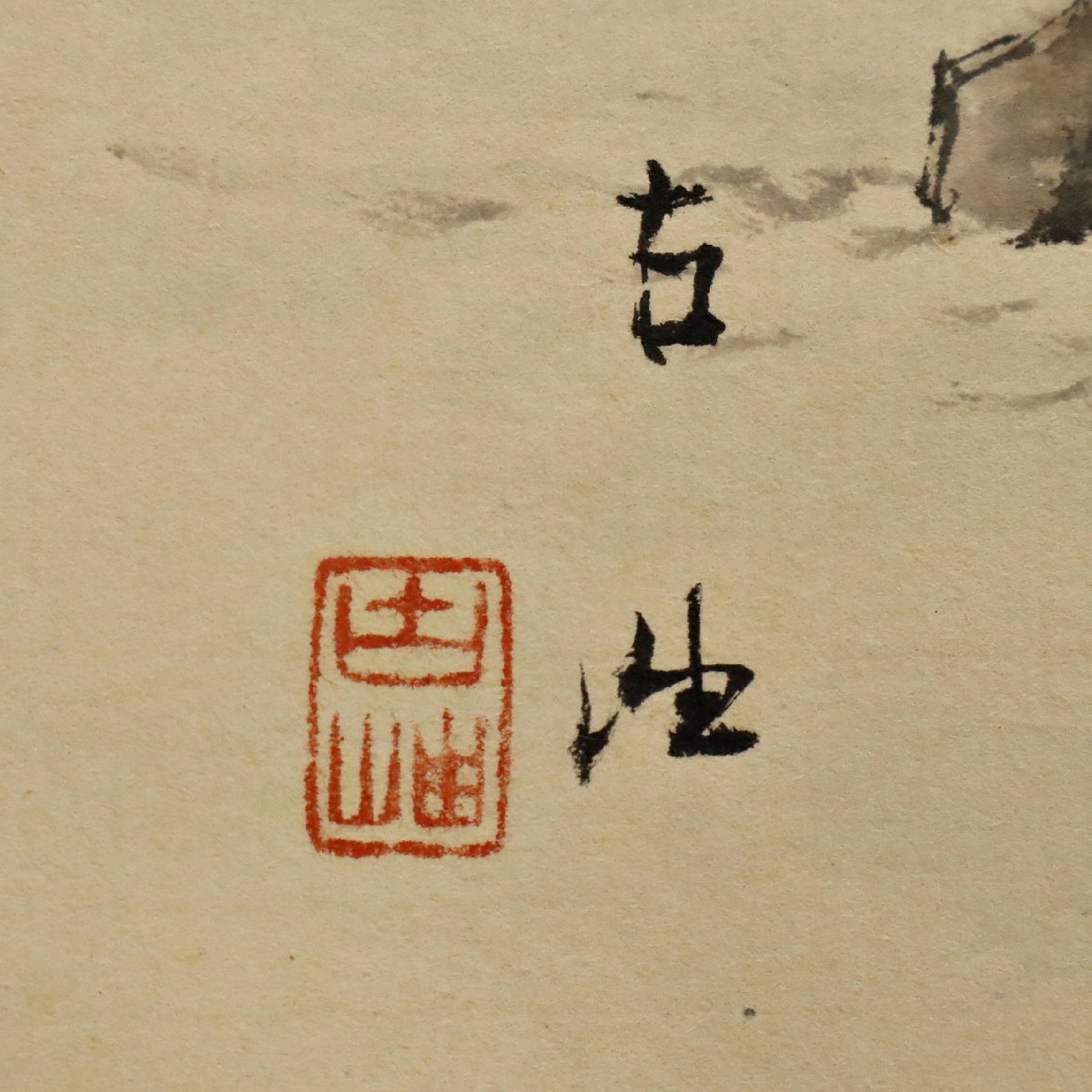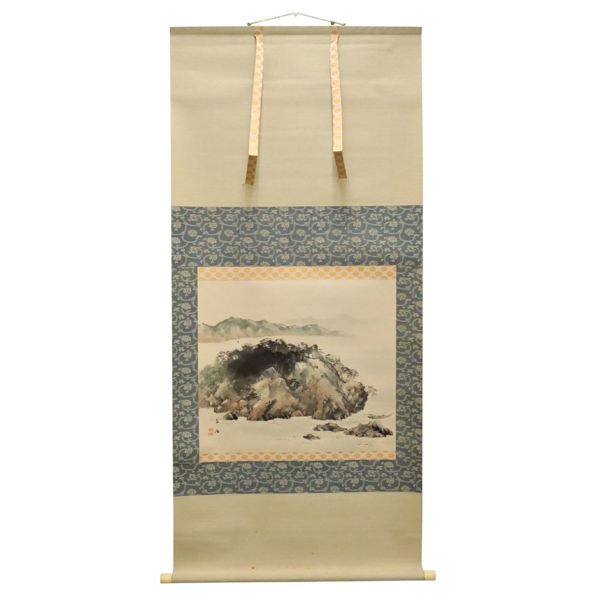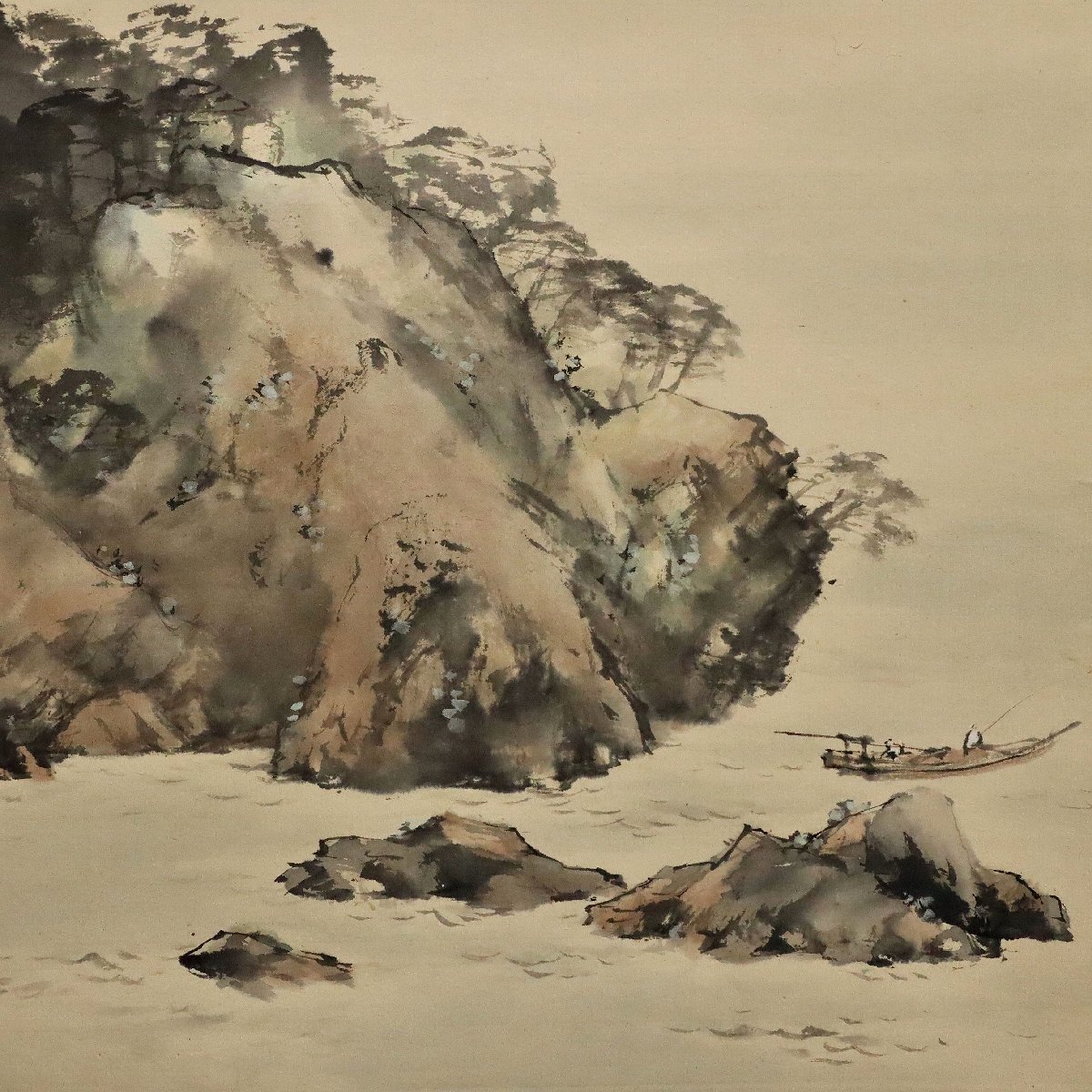 備後・福山市ゆかりの画人・佐藤古岫による「游釣りの図」紙本掛軸。共箱付の書画骨董で、川辺に遊び釣る人物の穏やかな情景を端正な筆致で描き、自然との調和と閑雅な趣を伝える格調高い美術品です。郷土画家の叙情性が光る希少な一幅です。