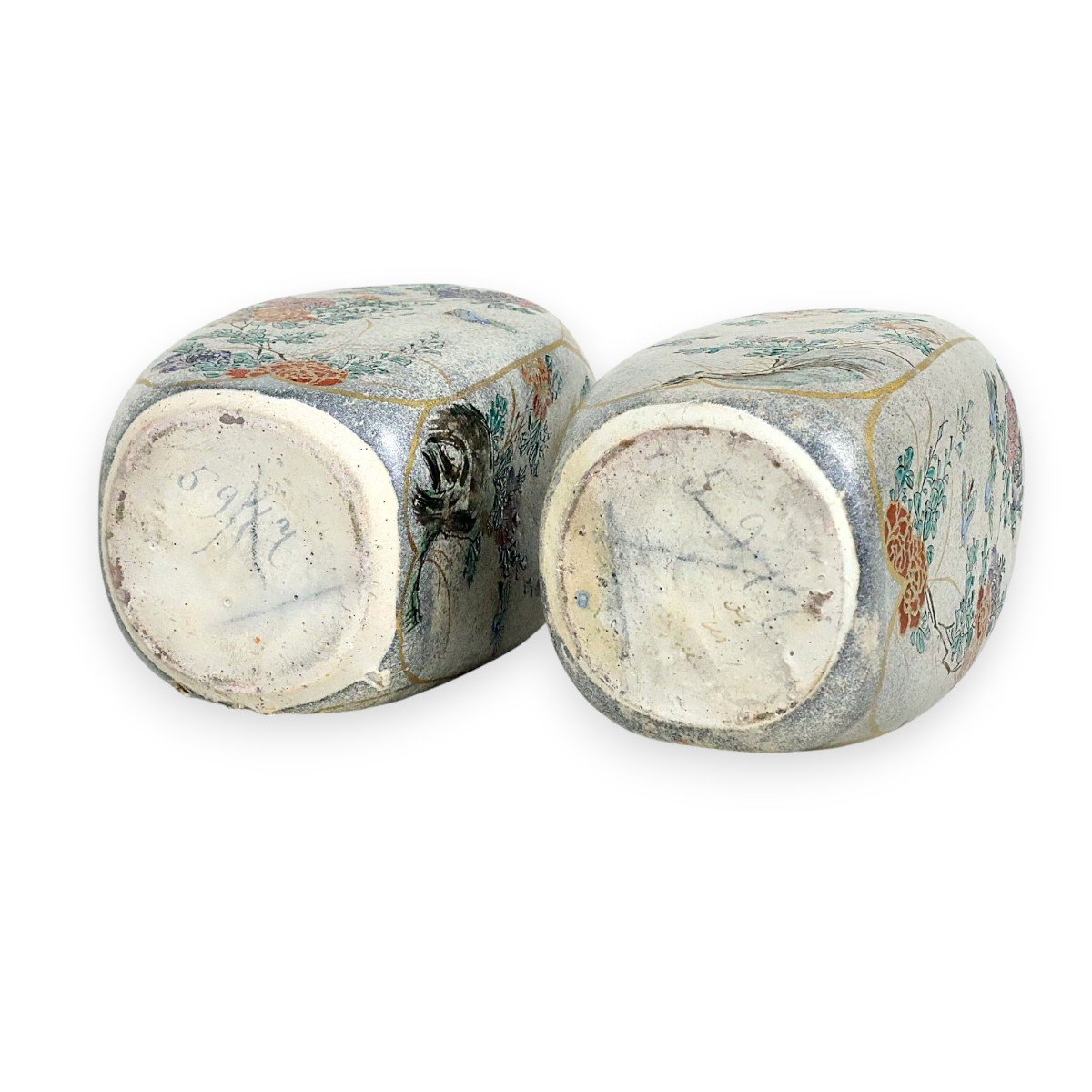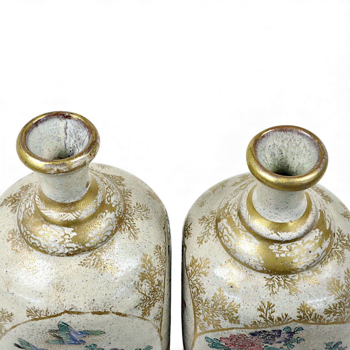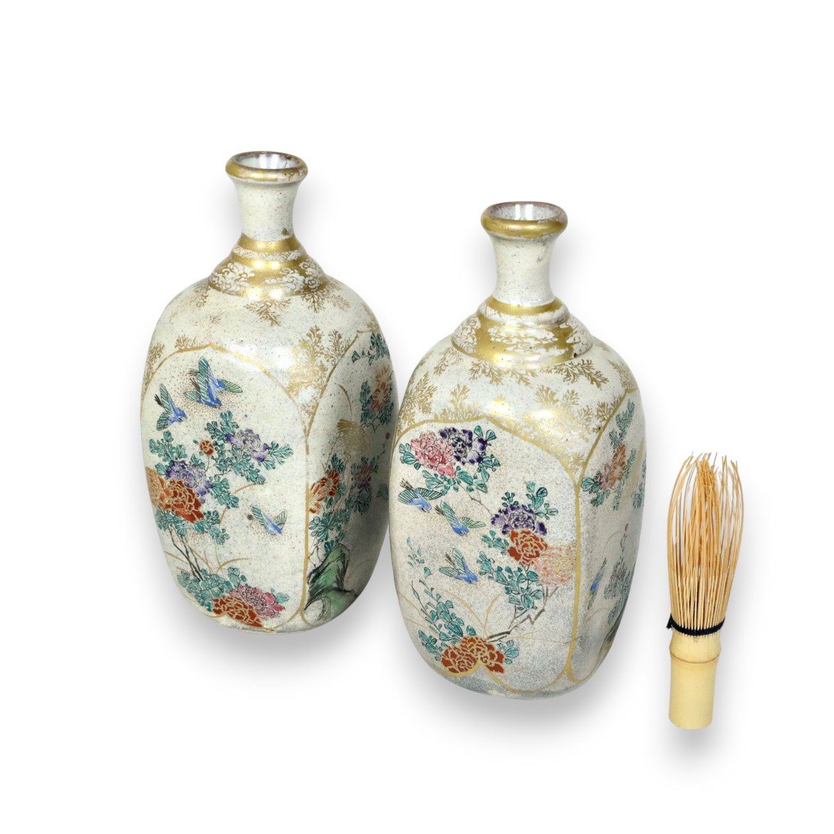 備後・鞆の浦に伝わる保命酒徳利、薩摩焼花鳥文の大小一対。きめ細かな白薩摩の肌に華やかな花鳥文を描き、異国趣味漂う優美な意匠が魅力です。鞆徳利として珍重された歴史を今に伝える酒器で、観賞性と資料性を備えた古陶磁の逸品です。