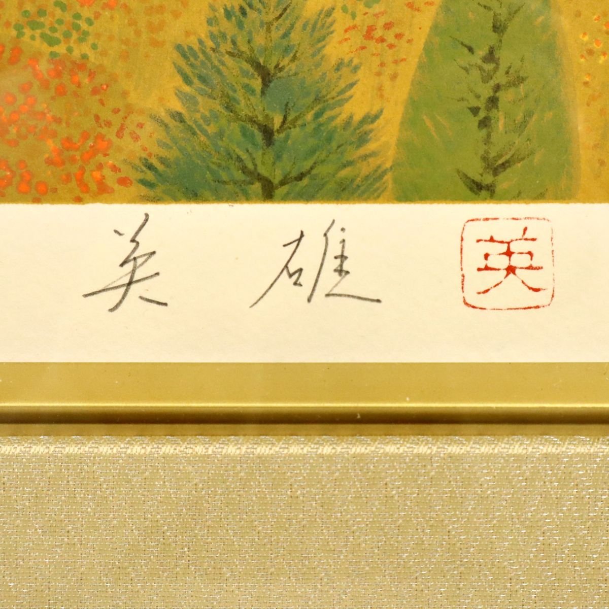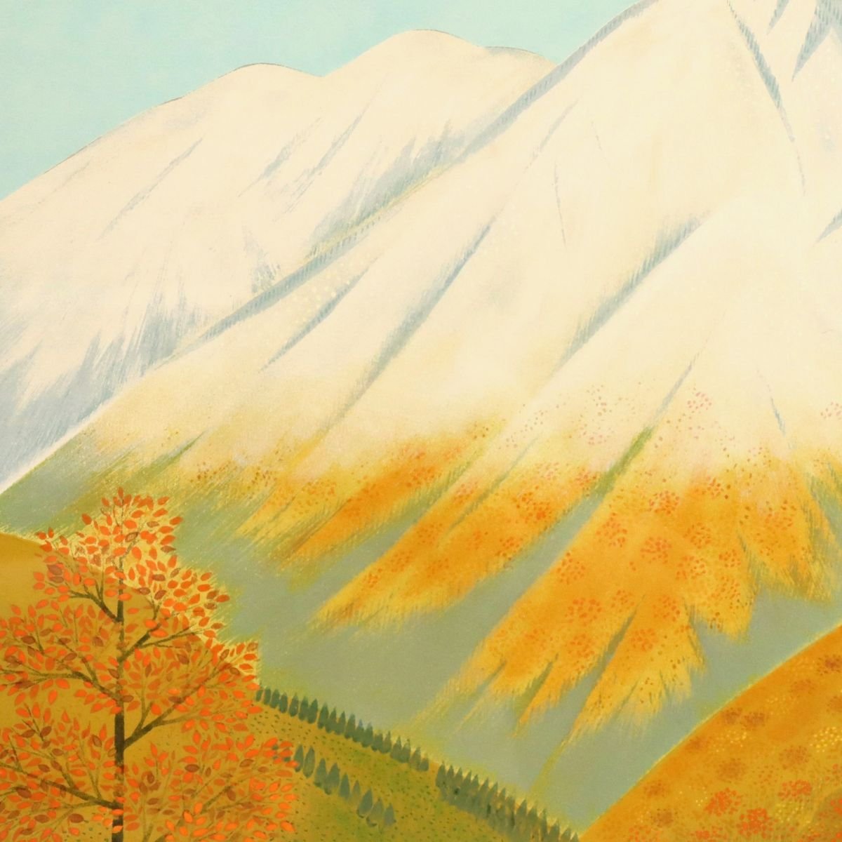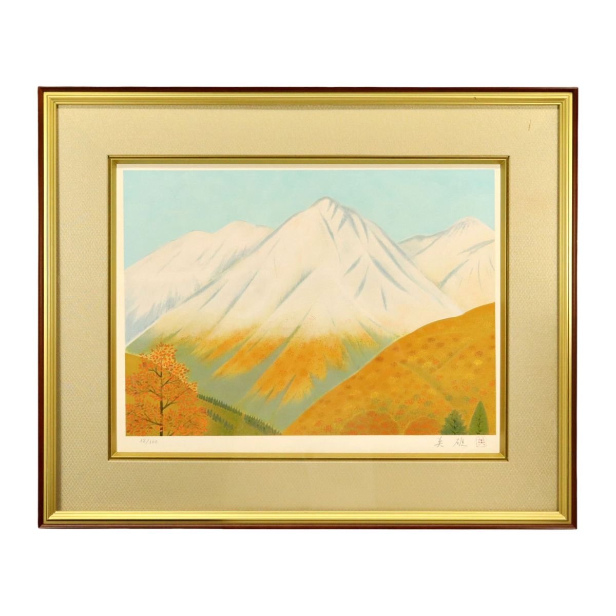 備後出身の洋画家・塩出英雄によるリトグラフ作品「連山初雪」です。初雪に包まれた連なる山々の静謐な景観を繊細な階調で表現し、澄んだ空気感と季節の移ろいを感じさせる一作。限定12/100の貴重な版画でタトウ箱付、郷土作家の魅力を伝える鑑賞性の高い骨董美術品です。