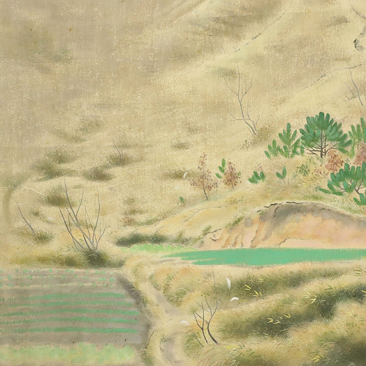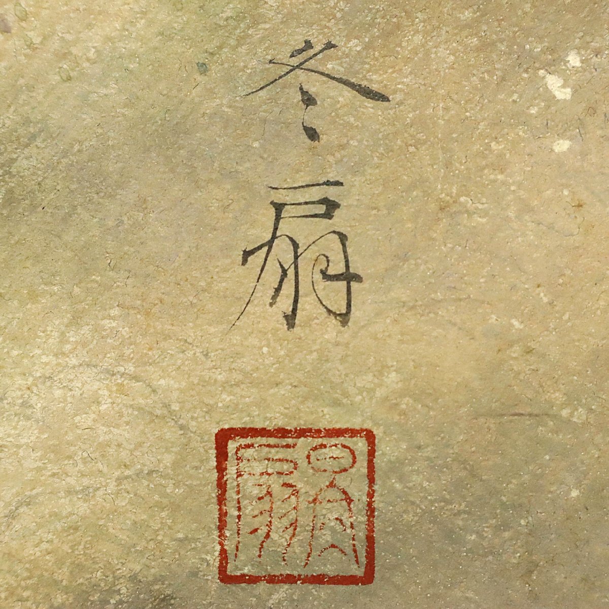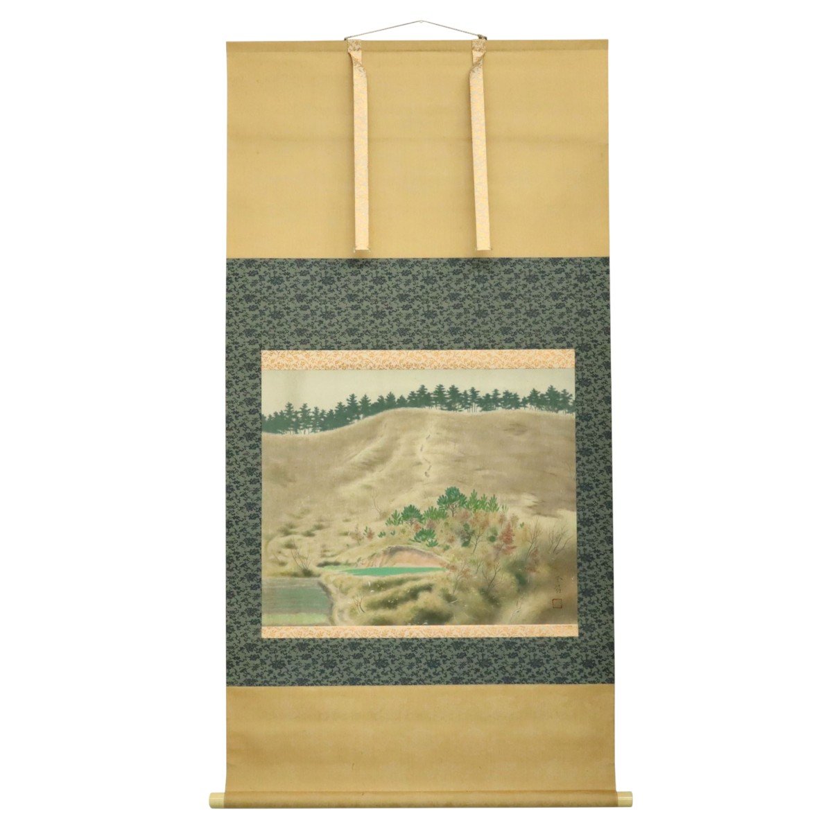 備後ゆかりの書家・園木冬扇による「草戸半坂早春」図の掛軸です。福山・草戸半坂の早春の情景を簡潔で清雅な筆致により表し、郷土景観への温かな眼差しが感じられる一幅。紙本・共箱を備え資料性も高く、備後地方の名所図として地域文化を伝える蒐集価値ある書画作品です。