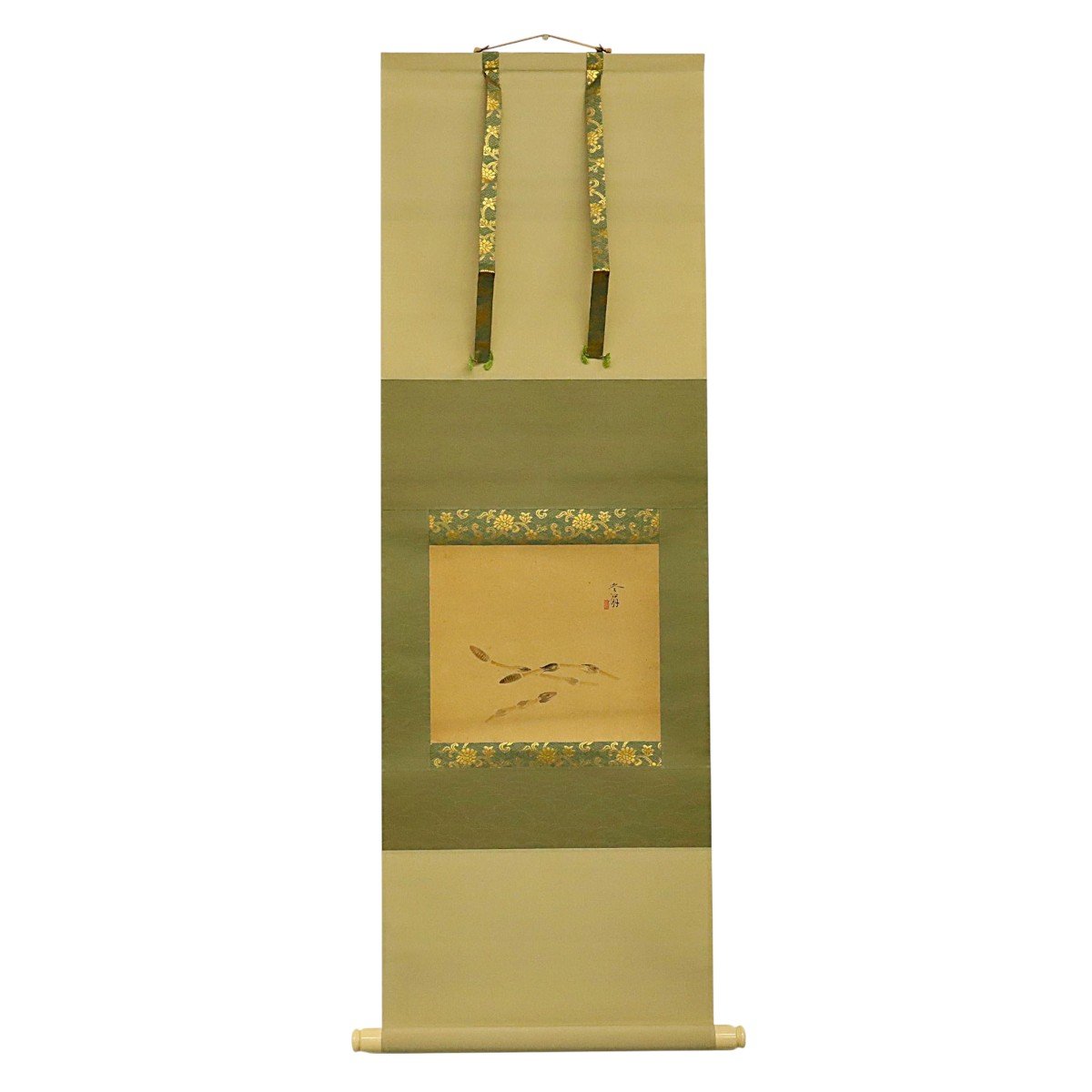 備後ゆかりの書家・園木冬扇による土筆図の掛軸です。春の訪れを告げる土筆を簡潔で伸びやかな筆致により描き、素朴な自然観と文人画らしい清雅な趣が漂う一幅。紙本ならではの柔らかな墨趣も魅力で、近代備後文人文化の息吹を今に伝える資料性と鑑賞性を兼ね備えた書画作品です。