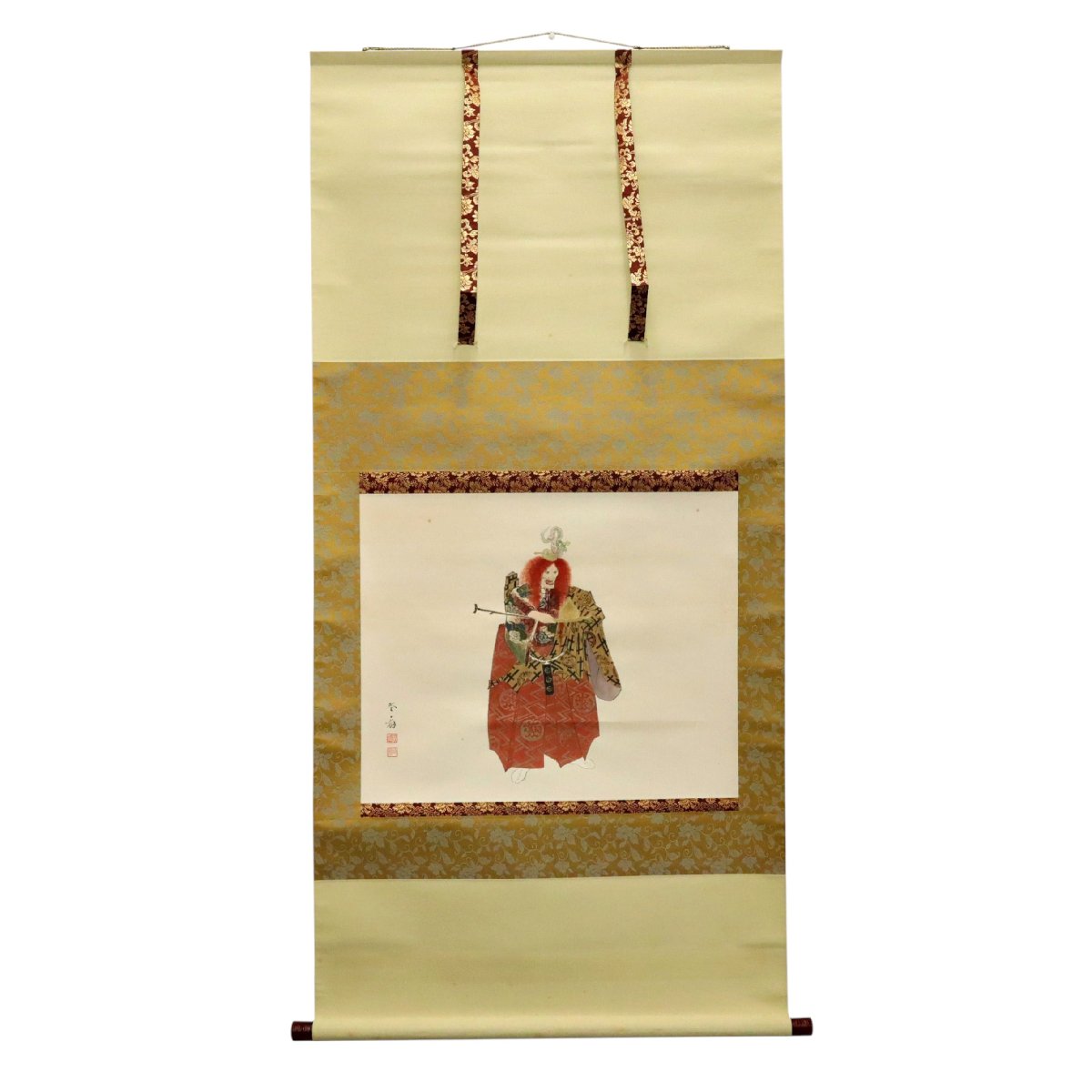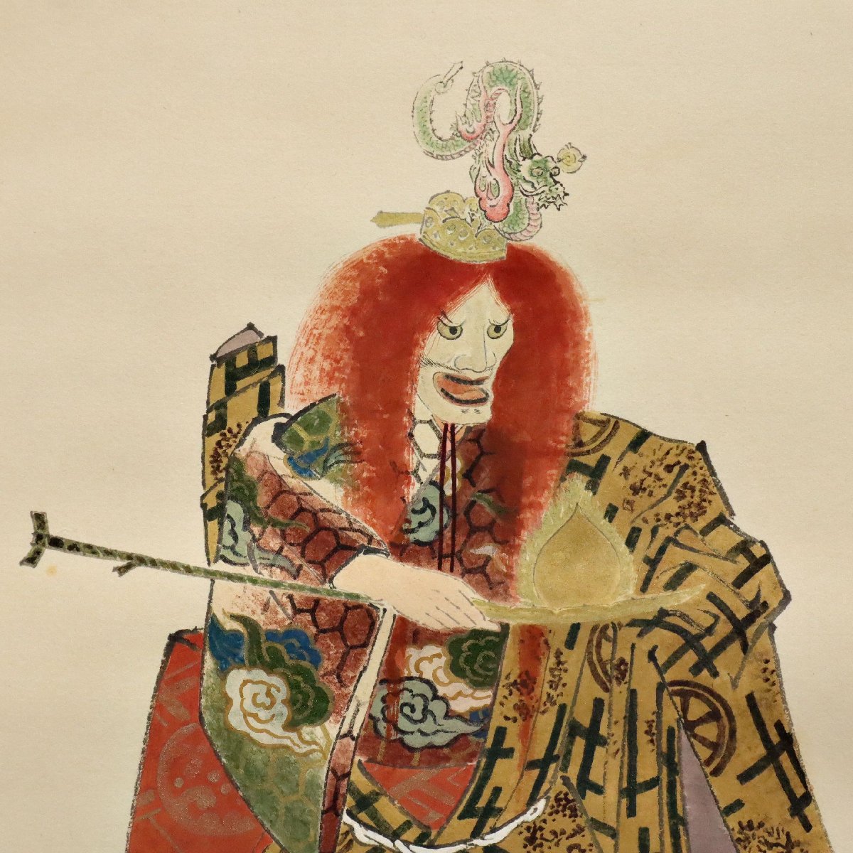 備後・福山市ゆかりの画人・園木冬扇による「能の図」紙本掛軸。共箱付の書画骨董で、能楽の静謐な一瞬を端正な筆致で描き、舞の緊張感と余韻を巧みに表現した格調高い美術品です。日本伝統芸能を題材とした希少な一幅です。