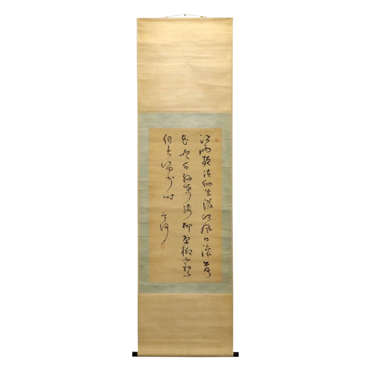備後(広島県福山市周辺)出身の儒学者・漢詩人、菅茶山による三行書の紙本掛軸です。簡潔ながら格調高い筆致は学識と精神性を映し出す書画骨董です。江戸後期の福山藩儒学文化を伝える貴重な一幅です。