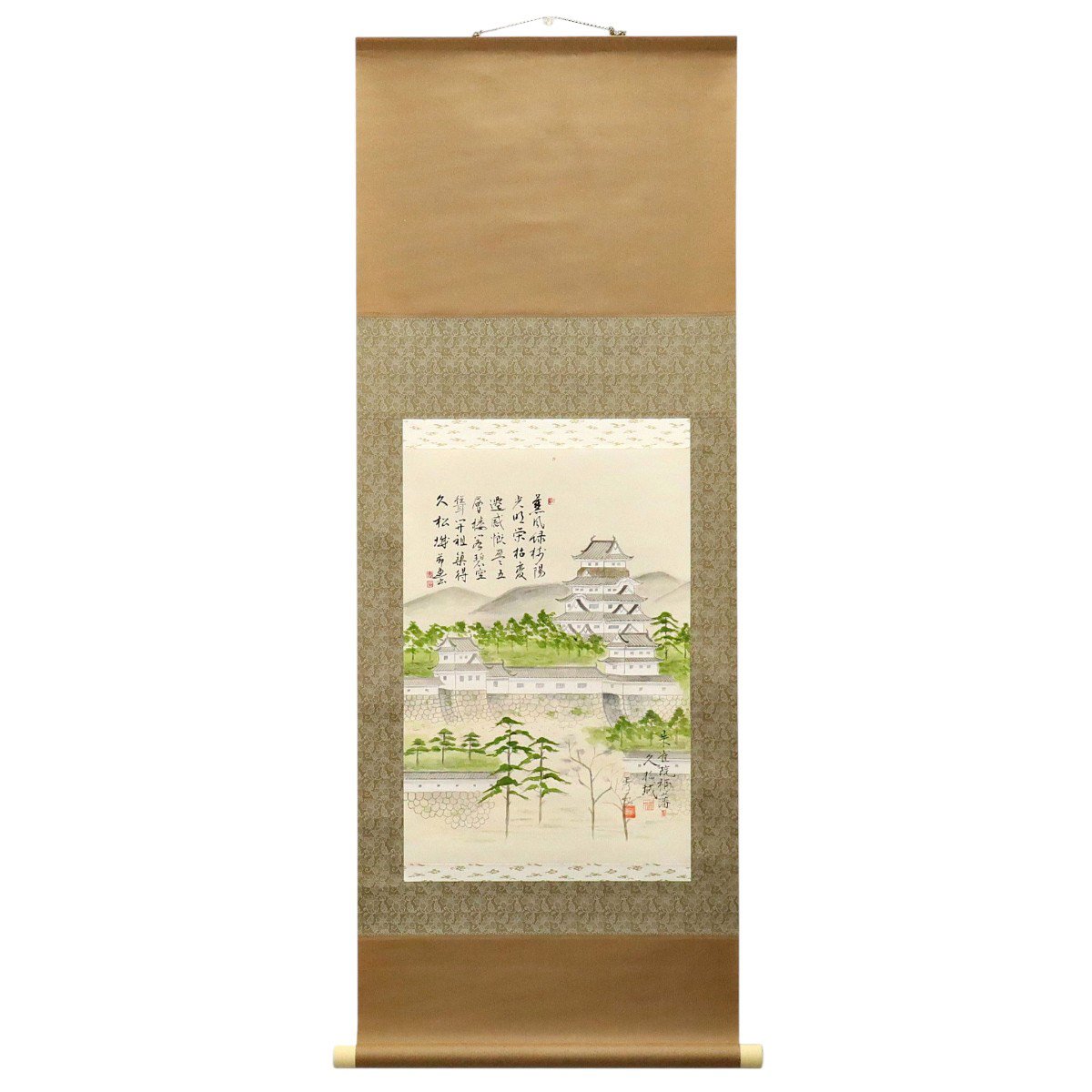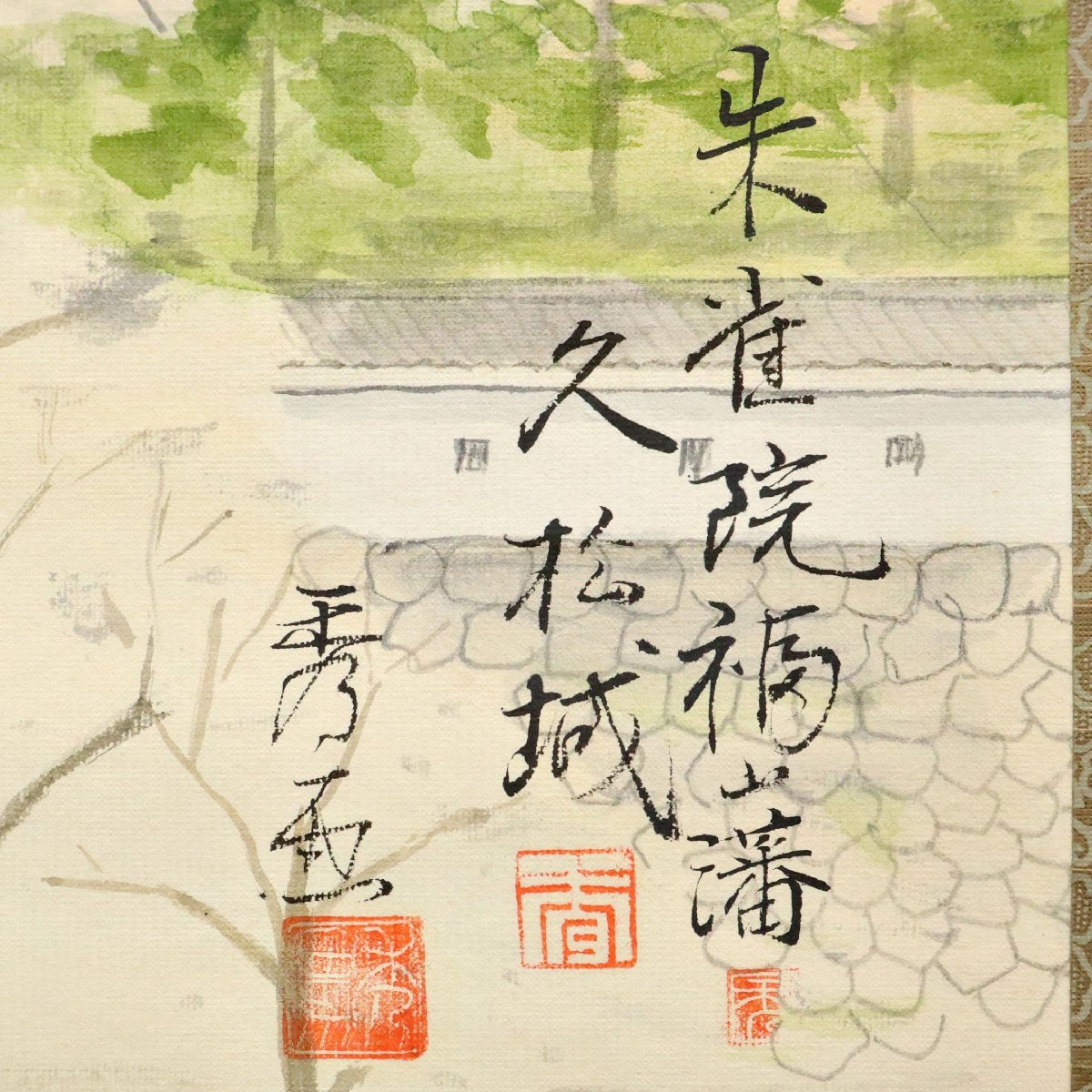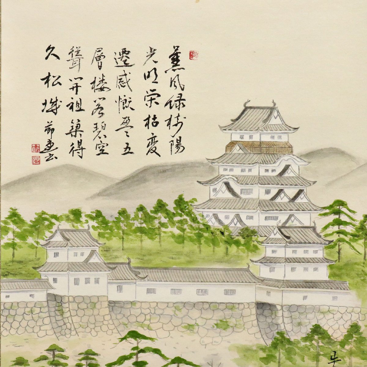 在銘「朱雀院福山藩 久松城」は、備後・福山の歴史を伝える紙本の掛軸です。福山藩の居城である久松城を題材に、簡潔ながらも趣深い筆致で往時の景観を表現。郷土色豊かな主題と落ち着いた構図が魅力で、歴史的価値も感じられる骨董書画の一幅です。