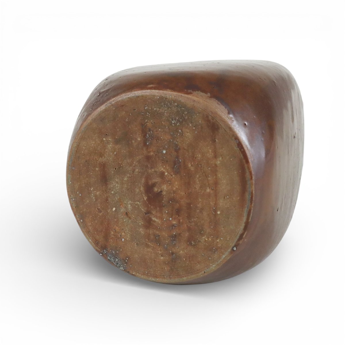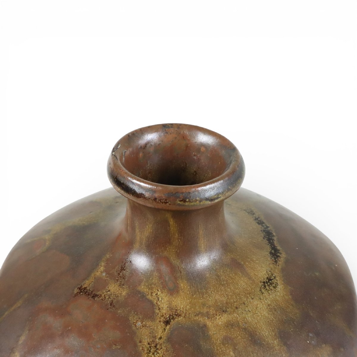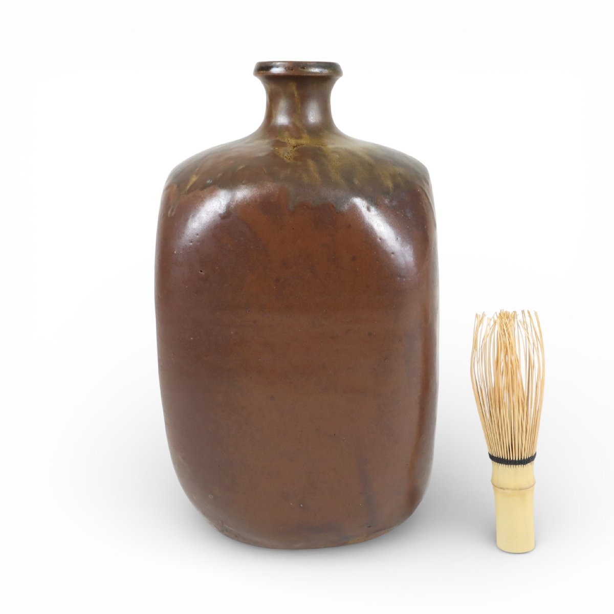 江戸後期、福岡県直方市周辺を源流とする高取焼の保命酒徳利です。備後・鞆の浦で流通した大振りの鞆徳利は、伸びやかな器形と流釉の景色が見どころ。茶陶の系譜を引く高取焼ならではの力強さと気品が宿り、港町文化を今に伝える逸品です。
