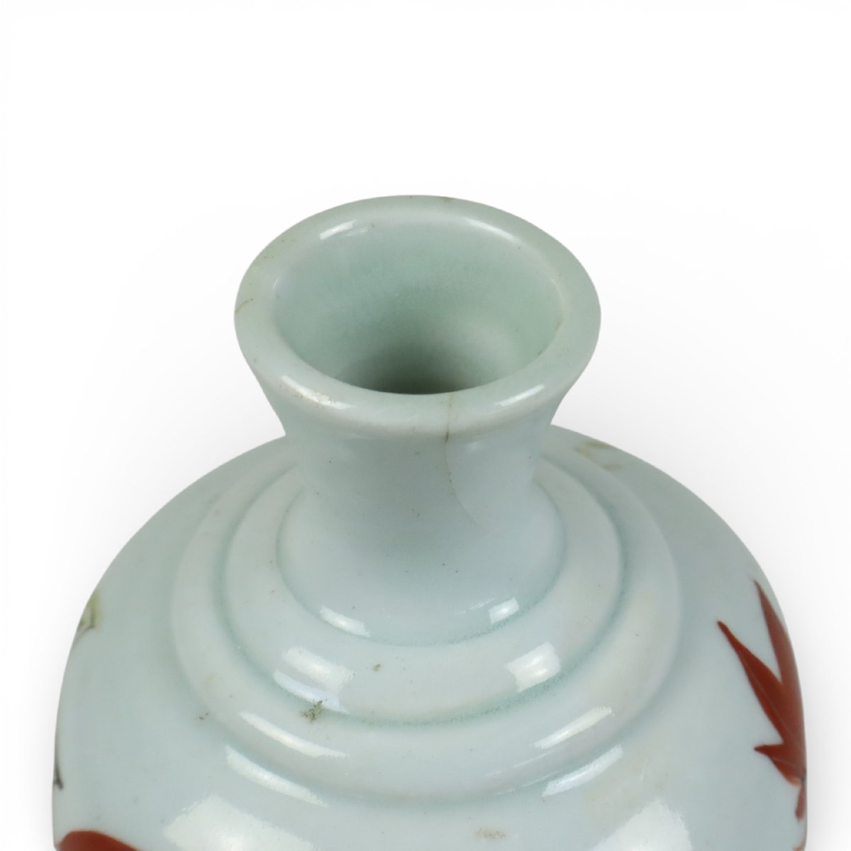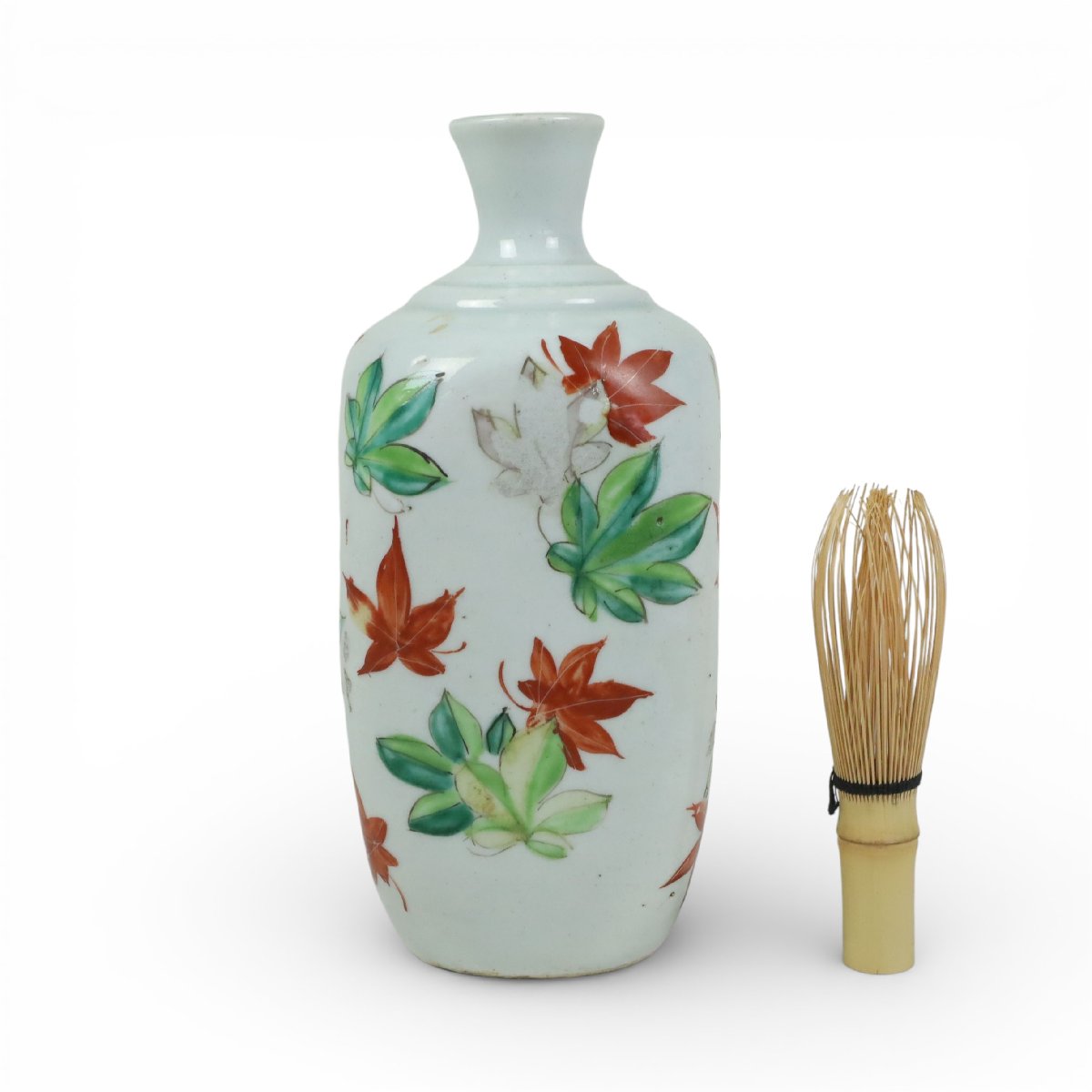 江戸後期の岩谷焼「紅葉文保命酒徳利」は、備後・鞆の浦に伝わる鞆徳利の中でも季節感豊かな一作です。器面に紅葉文をあしらい、素朴な土味と雅な意匠が調和。保命酒文化を支えた実用酒器でありながら、秋情を映す美的価値を備えた骨董陶磁器です。