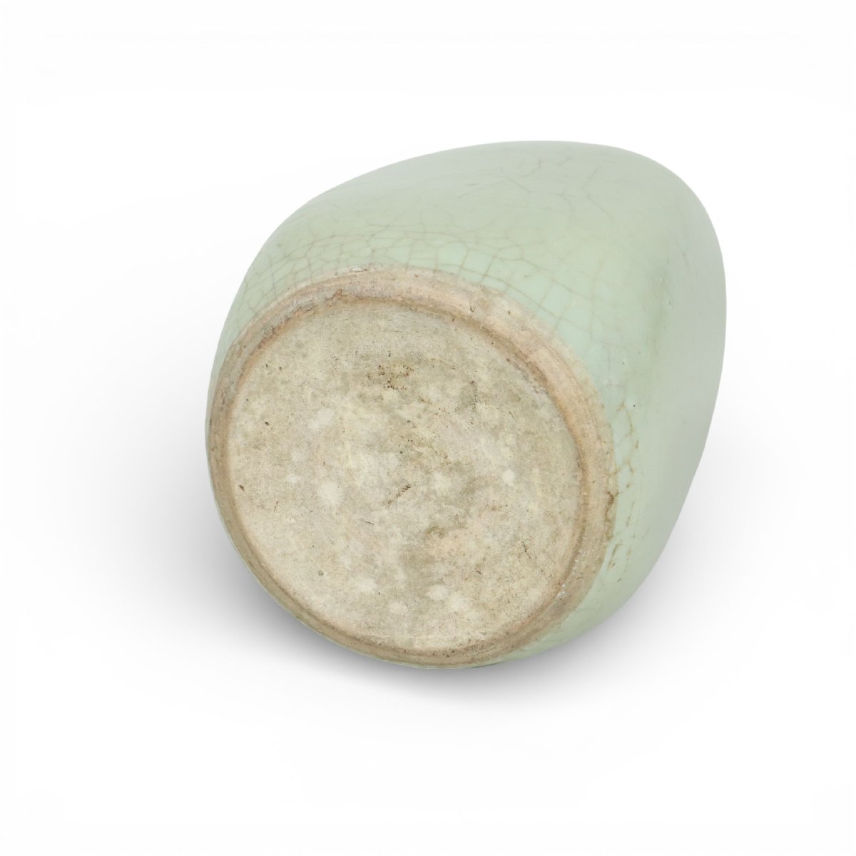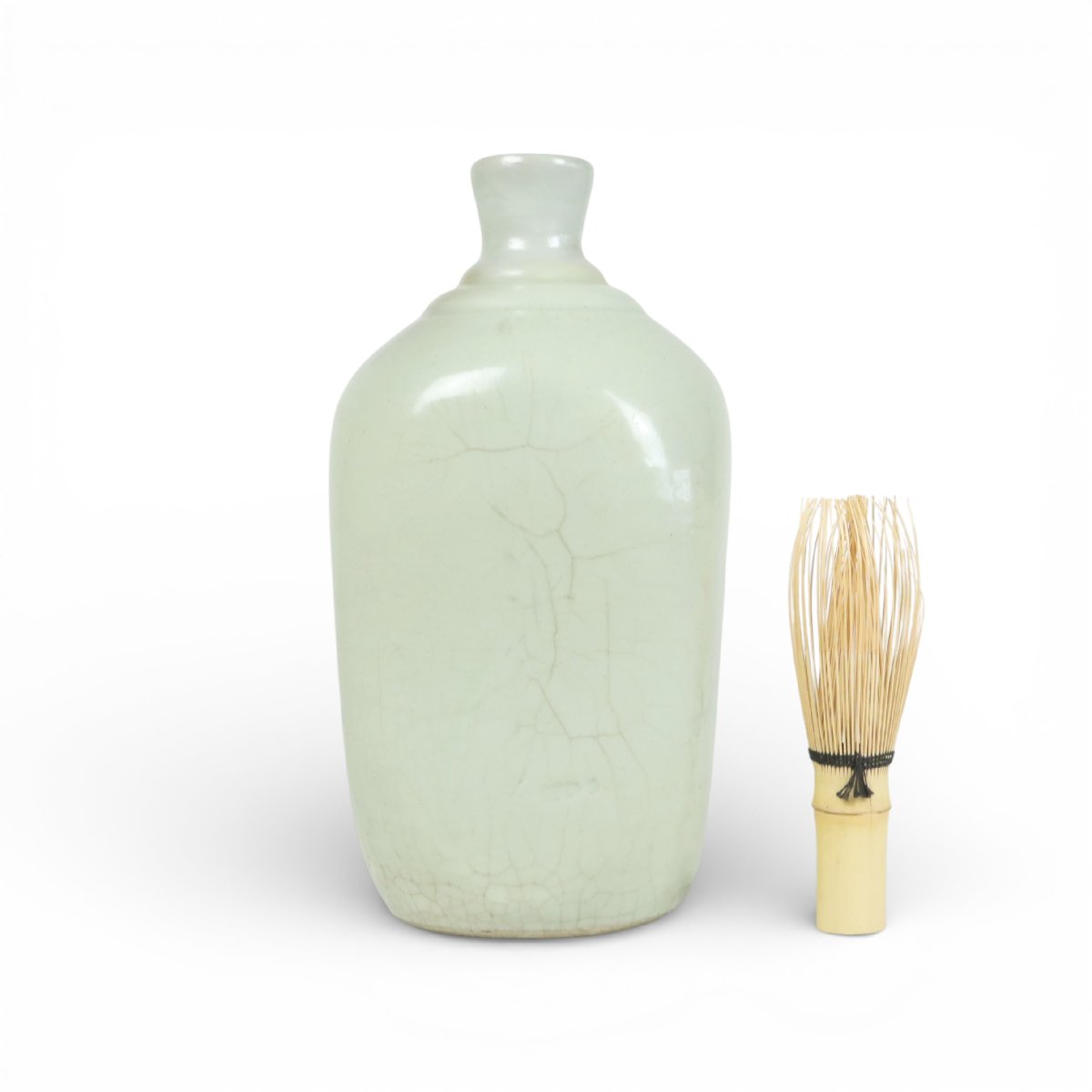 幕末から明治期に広島県福山市・鞆の浦で焼かれた鞆皿山焼の青磁保命酒徳利です。備後名産の保命酒を収めた鞆徳利は、淡く澄んだ青磁釉の気品と端正な造形が魅力。港町の交易文化を背景に育まれた地方窯の美意識を今に伝える一品です。