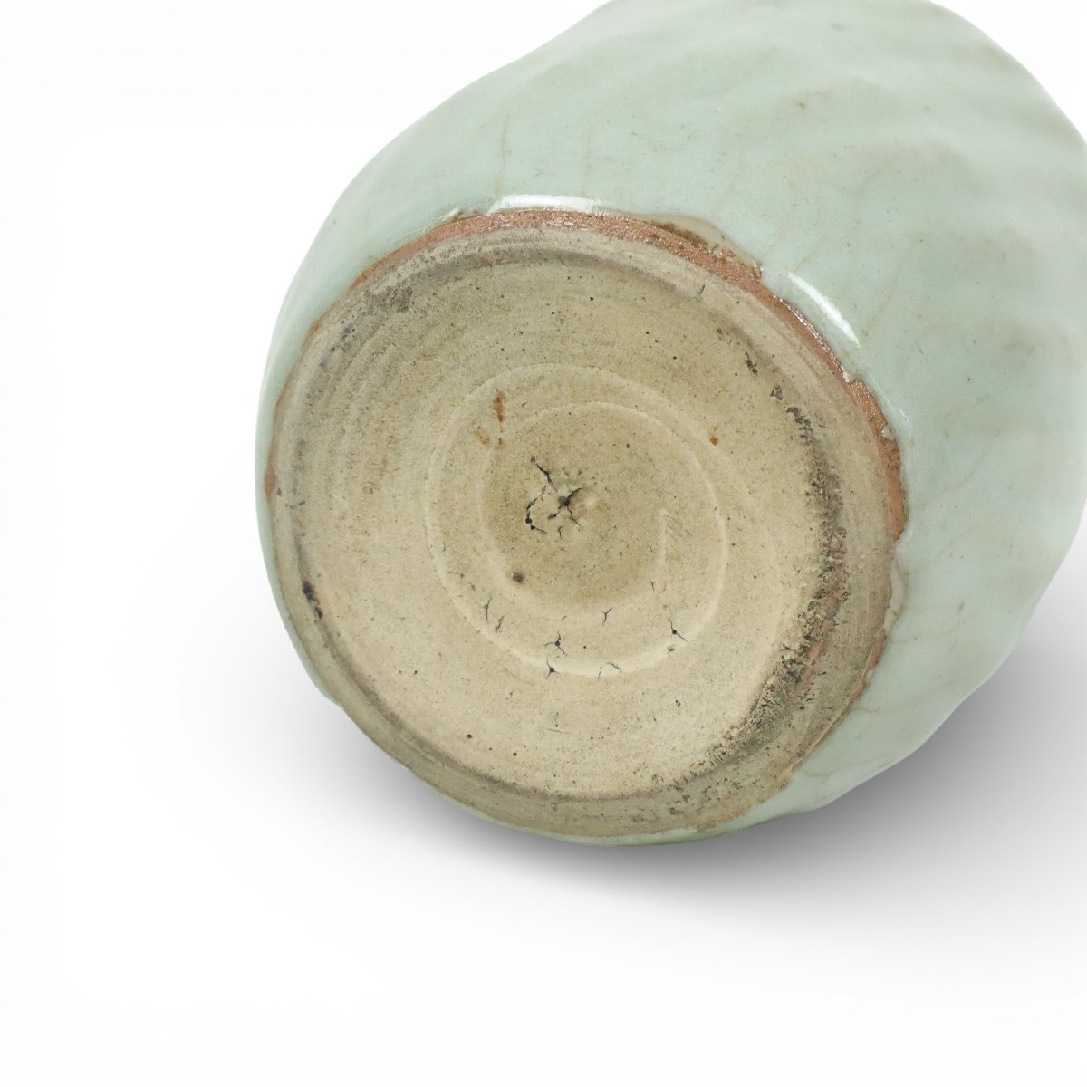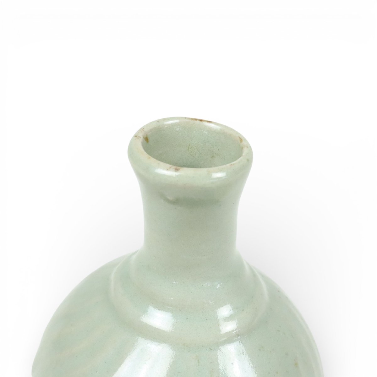 幕末から明治期、広島県福山市・鞆の浦で焼かれた鞆皿山焼の青磁捻じり保命酒徳利です。備後名産の保命酒を収める鞆徳利で、青磁釉の澄んだ発色と捻じり造形が特徴。地方窯の技巧と港町文化の美意識を今に伝える趣深い酒器です。