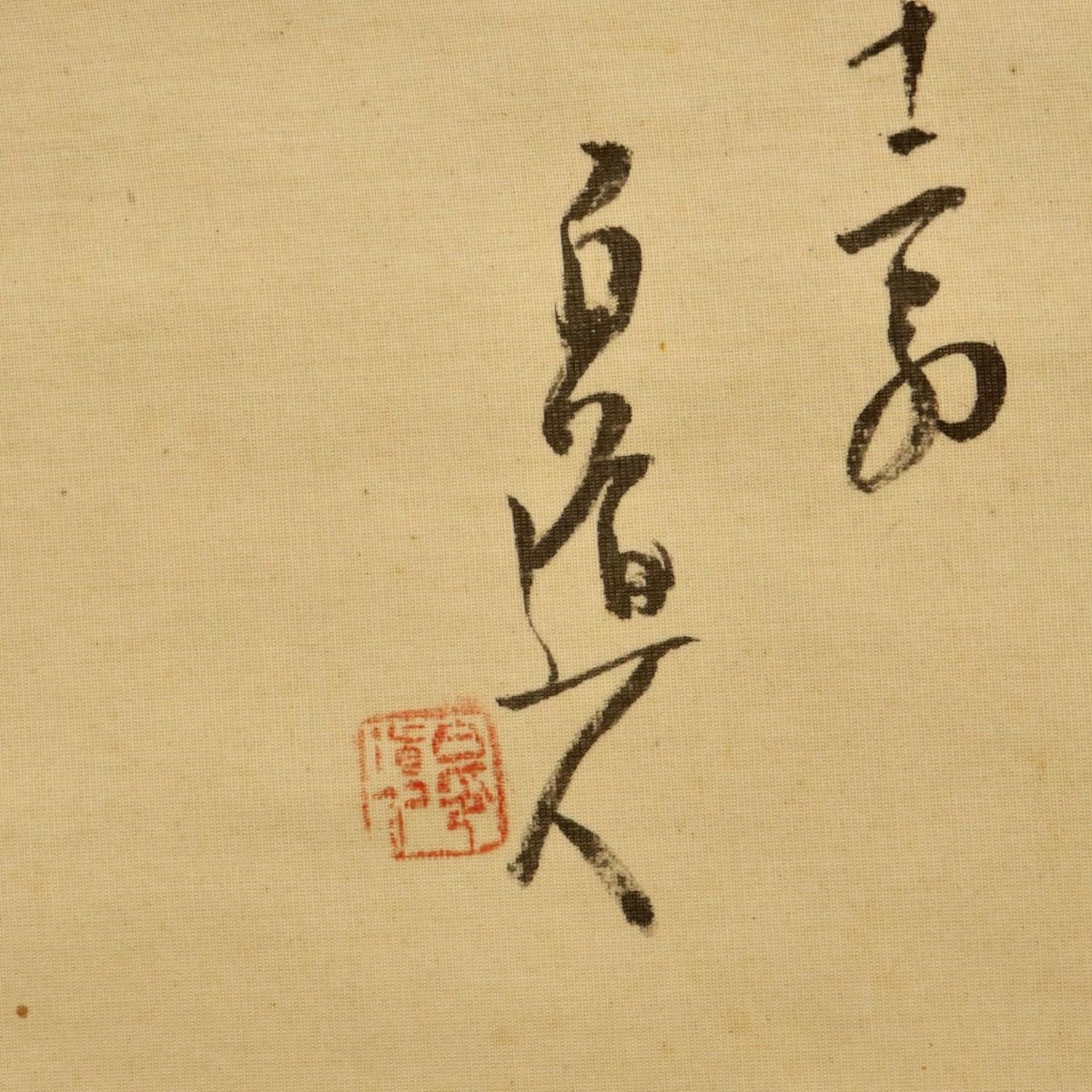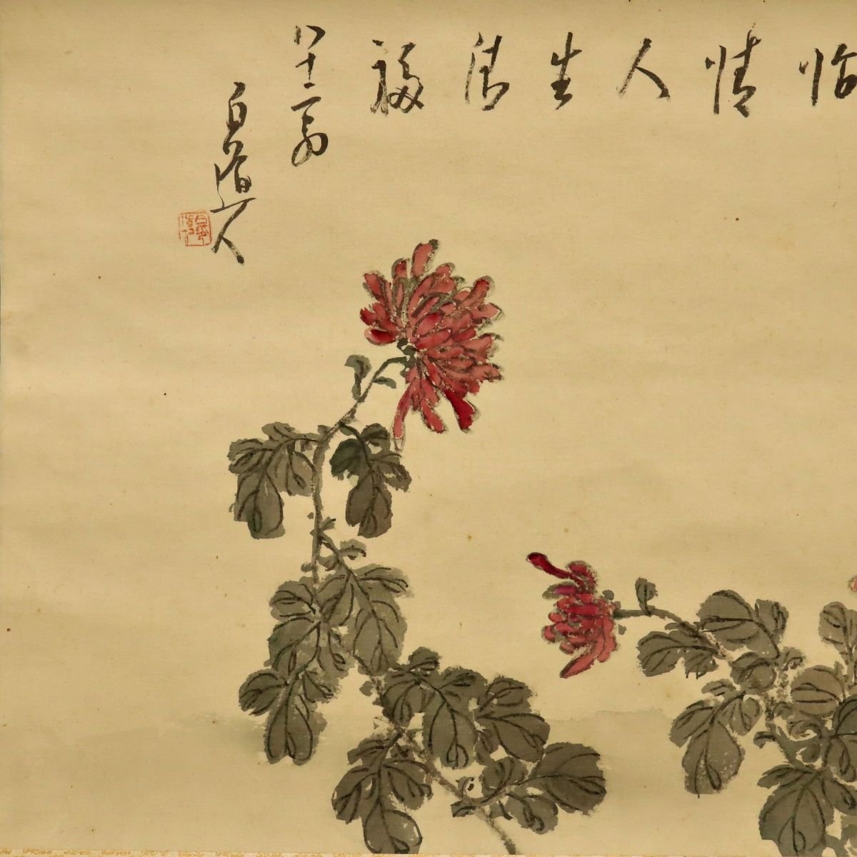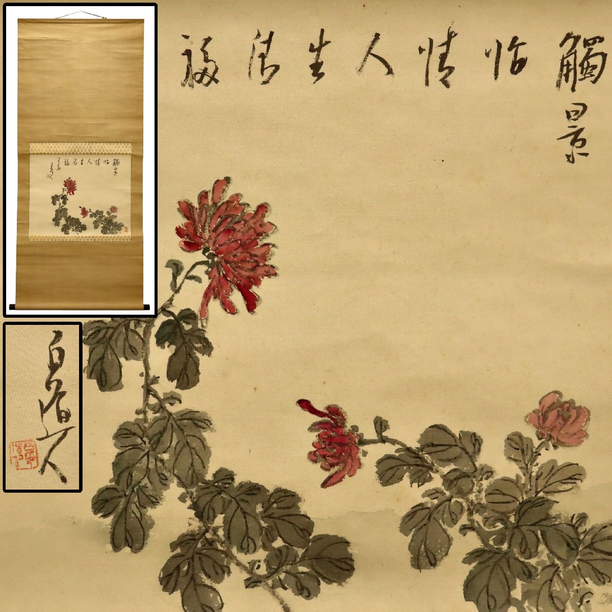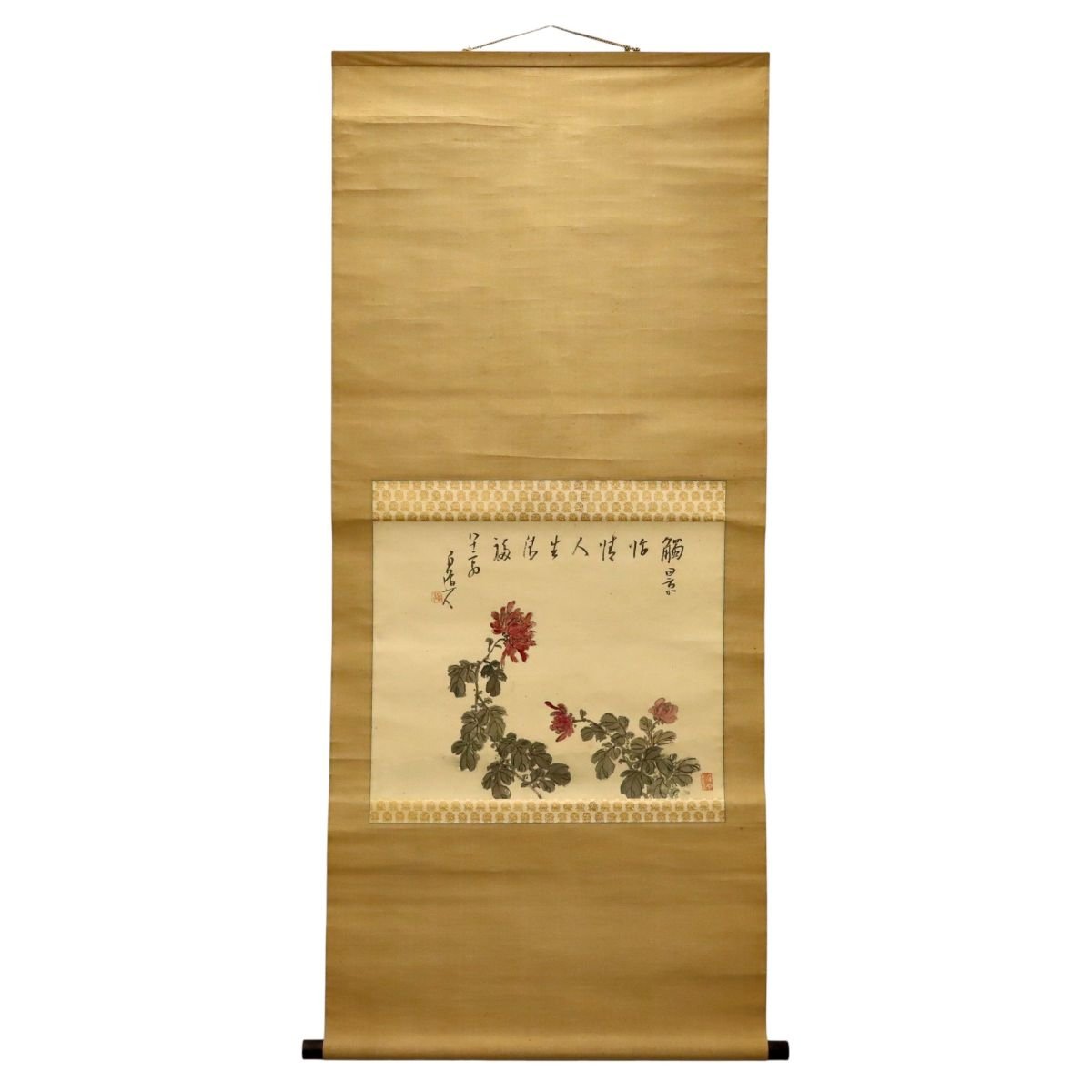 備後ゆかりの画家・津田白印による菊図の絹本掛軸です。秋を象徴する菊花を端正で気品ある筆致により描き上げ、清雅な趣と格調を感じさせる一幅。季節掛としても楽しめ、郷土作家の美意識と表現力を伝える資料性と鑑賞性を兼ね備えた備後美術の魅力あふれる骨董掛軸です。