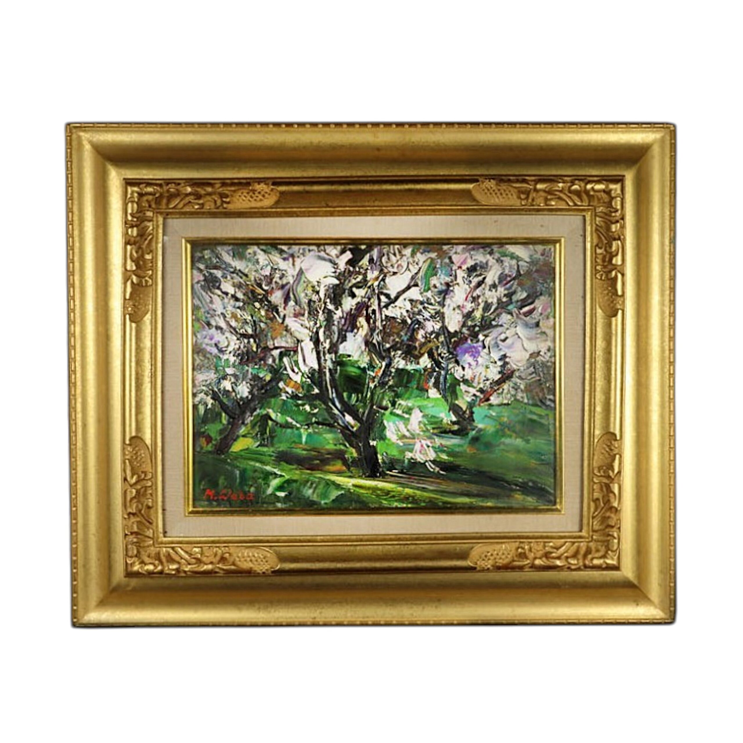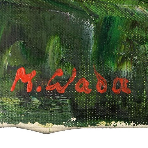 和田貢による風景画「杏」、油彩4号、タトウ箱付きです。広島県備後地方で描かれた本作は、柔らかな色彩と繊細な筆致で杏の風景を生き生きと表現。地方作家の感性が息づく絵画骨董品として、室内に穏やかな情景美をもたらします。