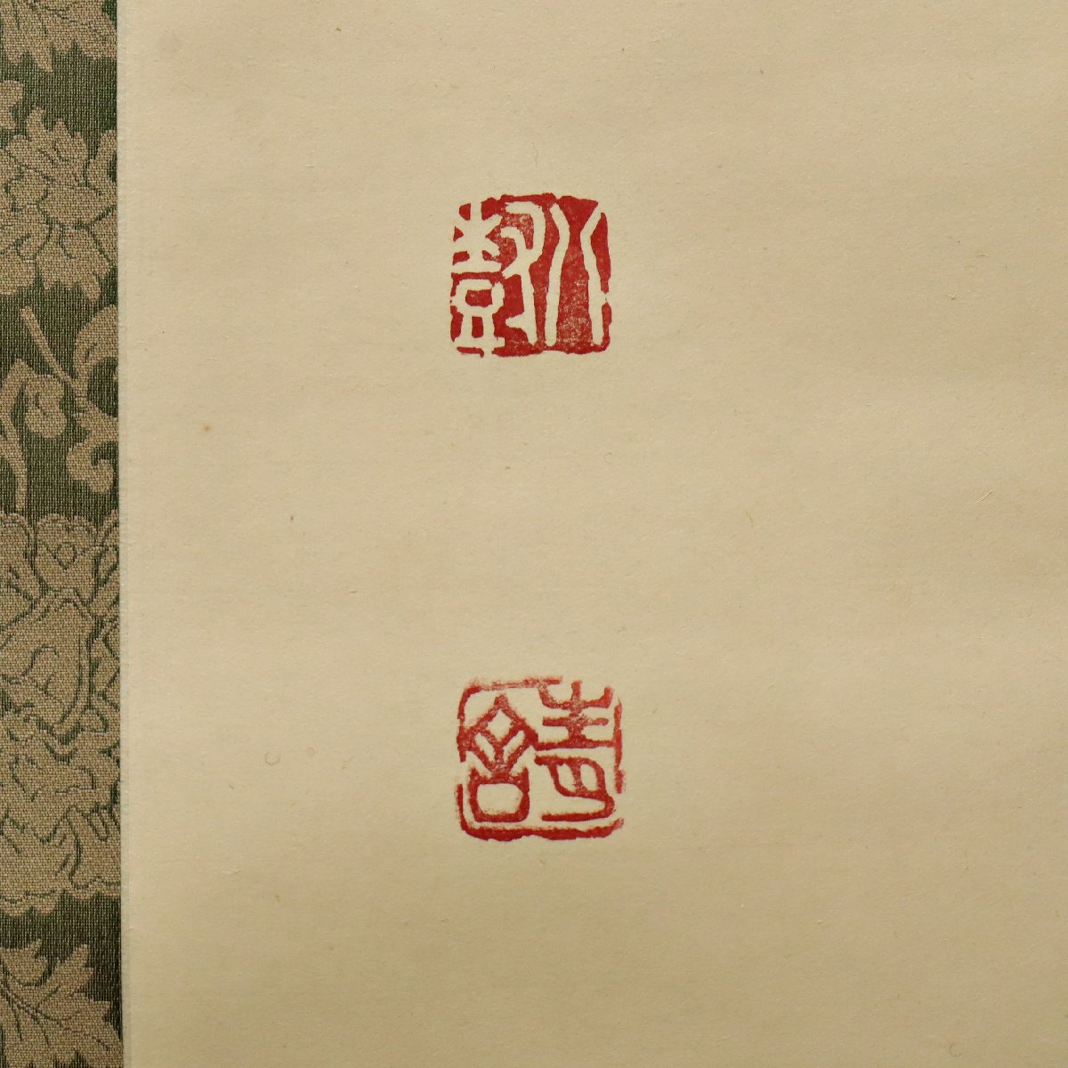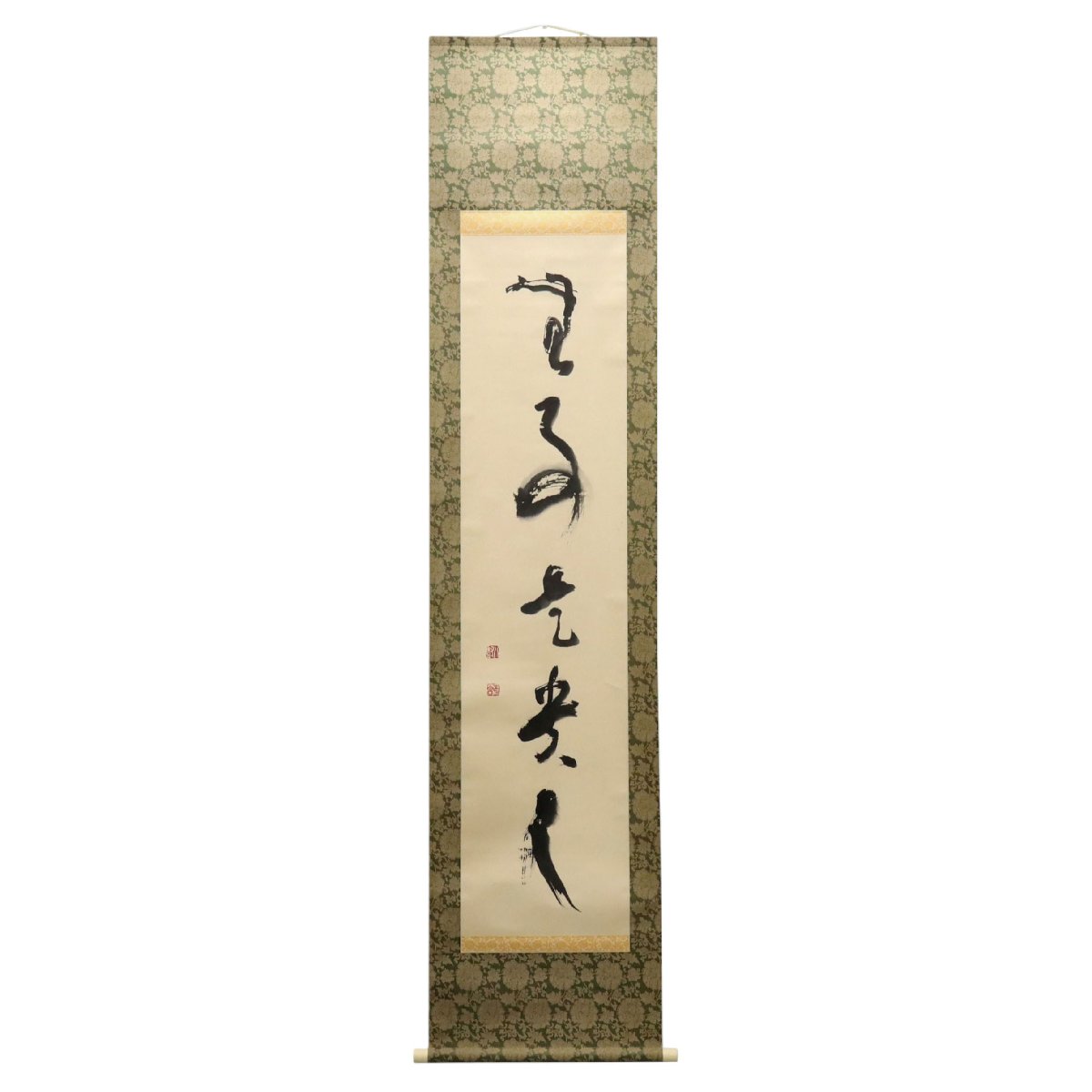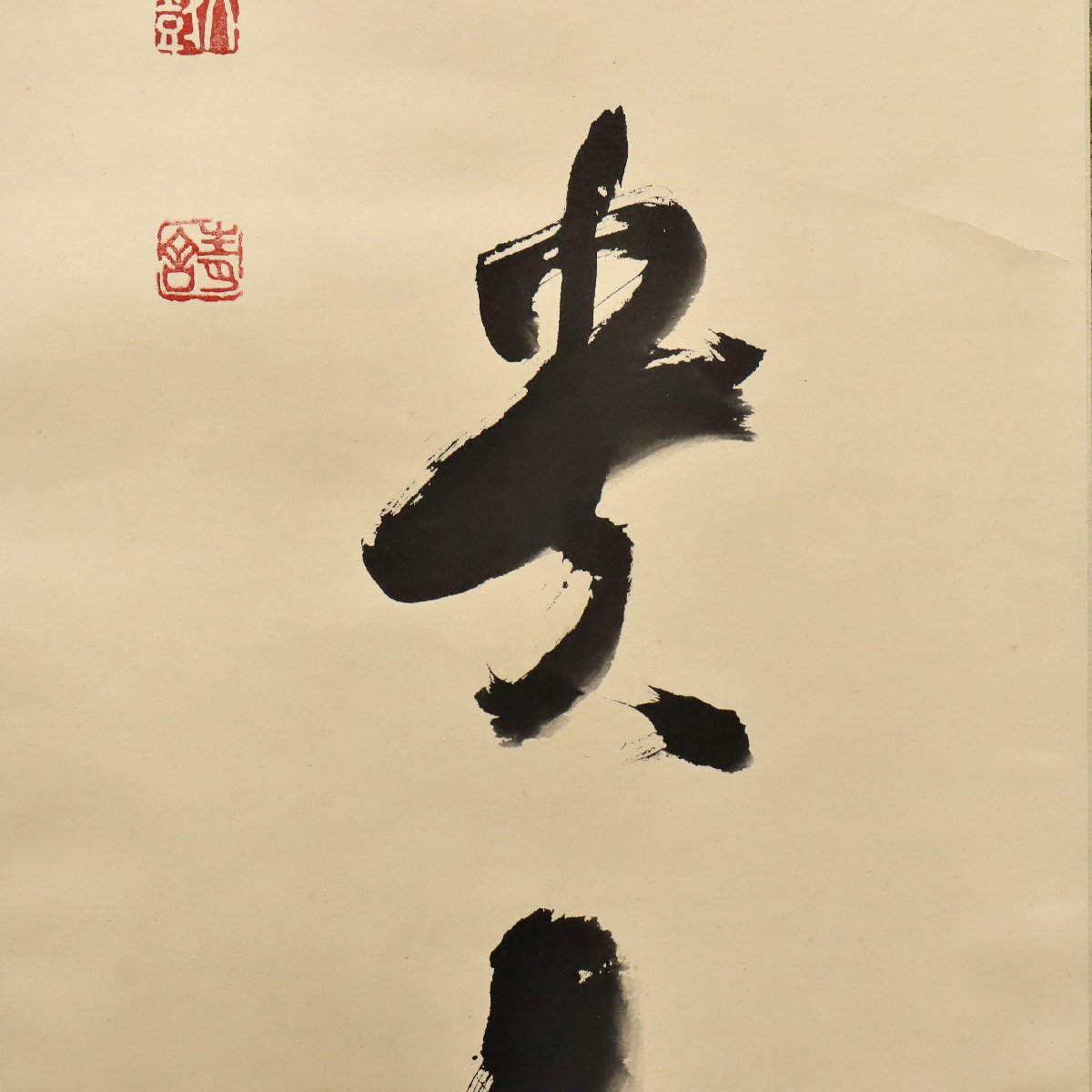 備後・福山市ゆかりの書家・八樹青舎による紙本一行書掛軸。共箱付の書画骨董で、研ぎ澄まされた筆致と余白の美が調和し、禅的な静けさと精神性を感じさせる格調高い美術品です。床の間を引き締める希少な一幅です。